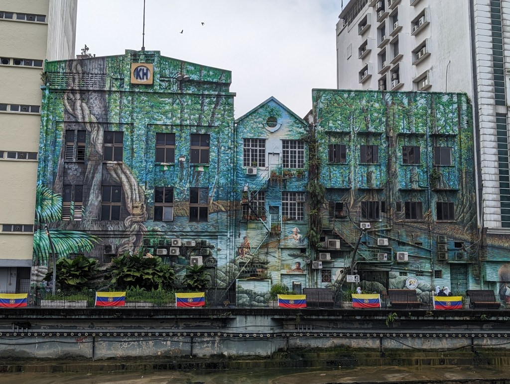 We walked along the Klang River, where we could see some of the buildings from the city’s colonial past. Many have been abandoned and are falling into disrepair though some have been restored. But the colorful murals that are painted on the buildings dress it up quite a bit.