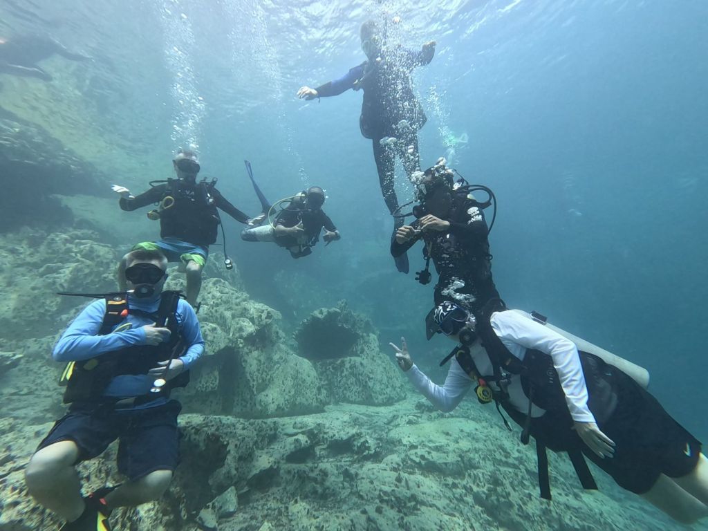 Here we all are on the rocky bottom, just above the thermocline at about 40 feet. The thermocline is a barrier in the water where temperatures above and below are different. Above the temperature was in the low 80’s. Below the water hovered in the high 90’s. We actually felt a chill when we came back above the thermocline. That’s me in the foreground wearing the white shirt.