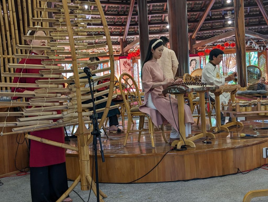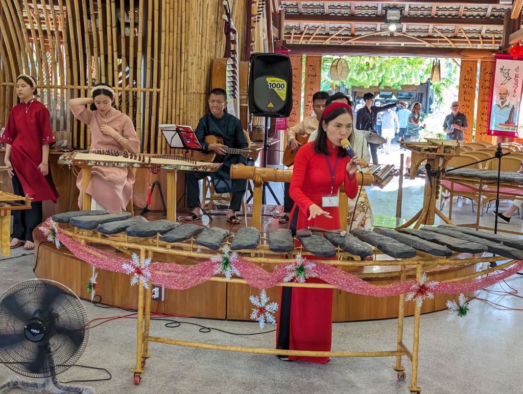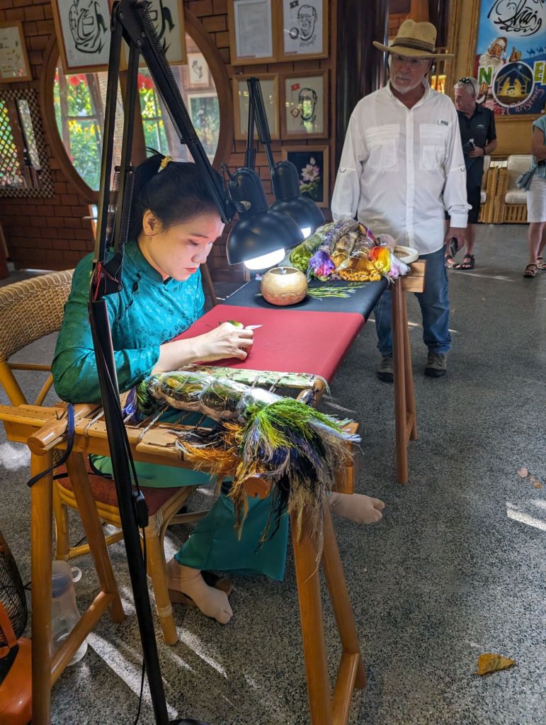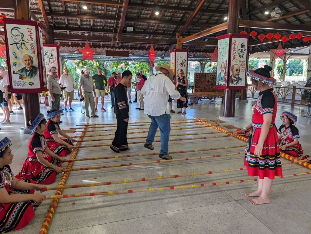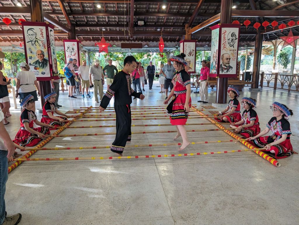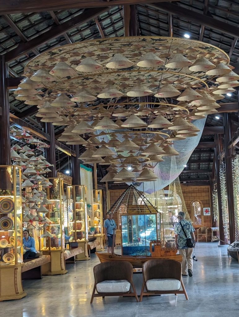 We were told the Truong Son Workshop was a crafts shop and were expecting a typical shopping stop. We were were surprised and delighted by this unique and beautiful garden spot. There one elegant hall after another with people demonstrating traditional crafts and art forms–rattan weaving, conical hat making, clay toy kneading, embroidery and much more. Lovely people played music on traditional instruments, danced between bamboo sticks, (Joel joined them), made rice milk and showed us fine artistic creations. And the gardens! Not only were they lush and beautiful, but they were decorated with the intricate bamboo figures created locally.
