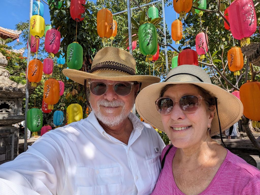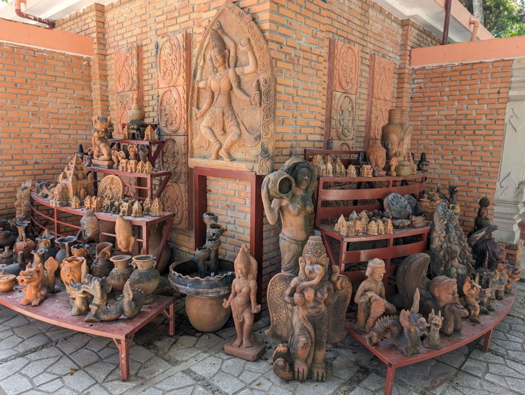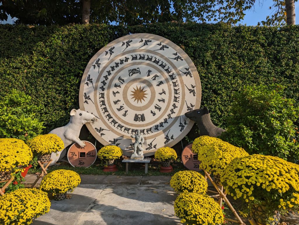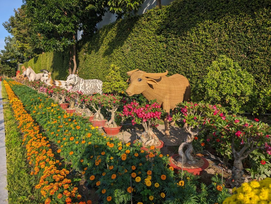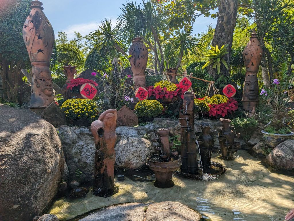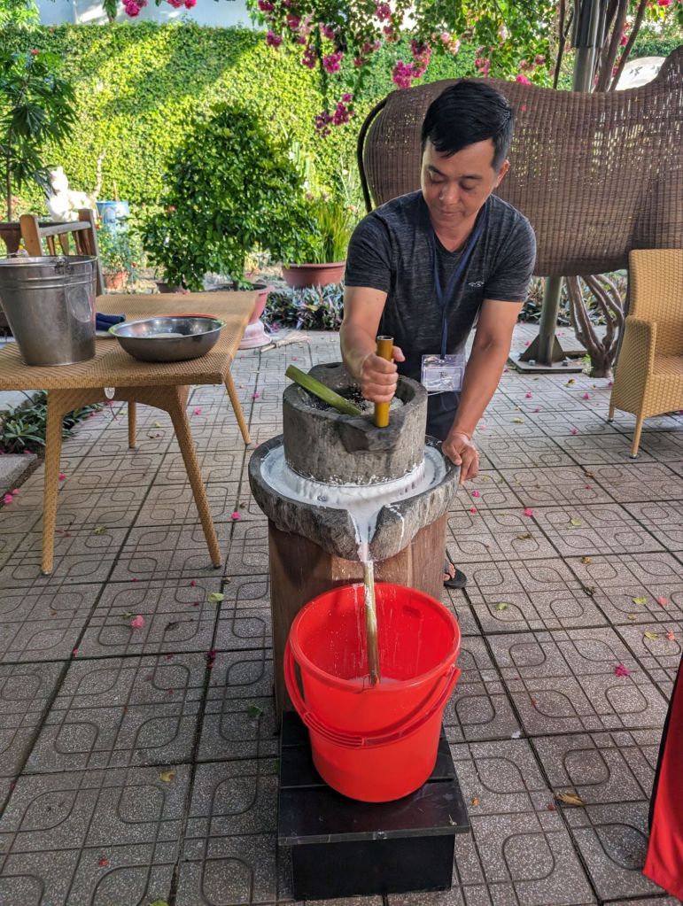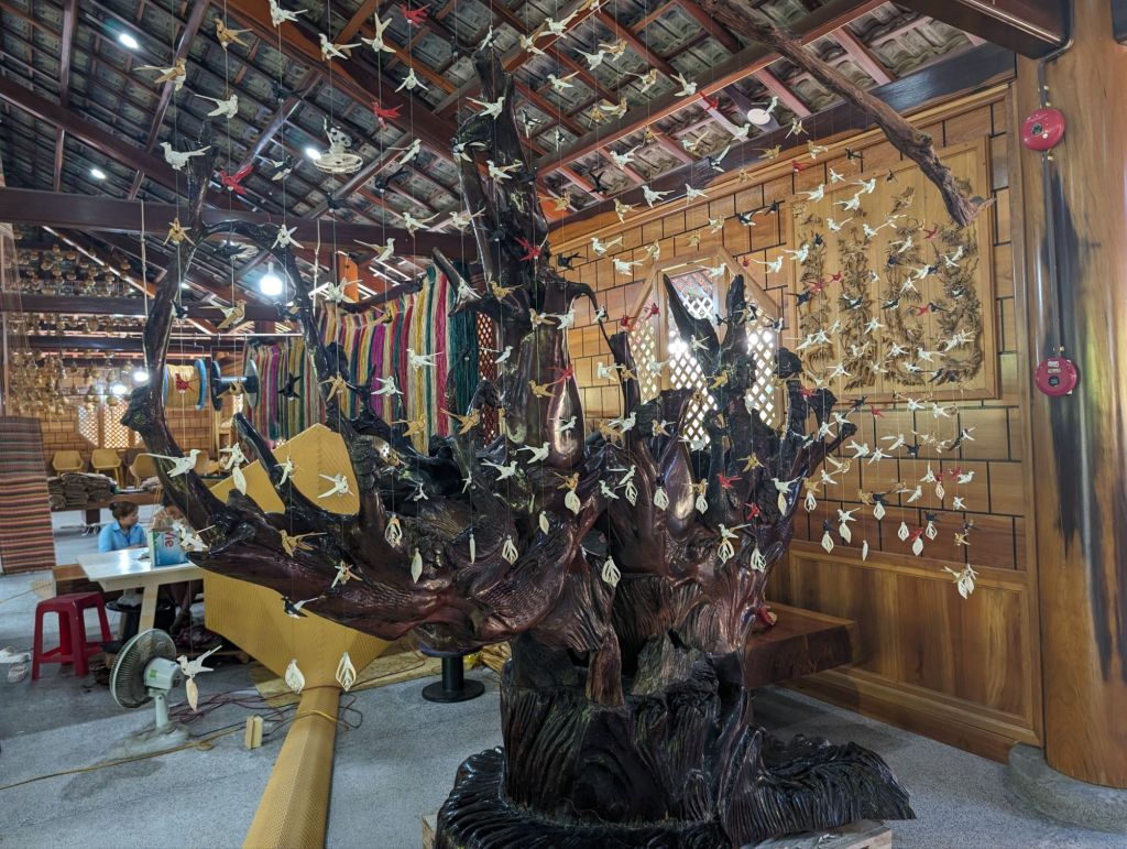 We were told the Truong Son Workshop was a crafts shop and were expecting a typical shopping stop. We were were surprised and delighted by this unique and beautiful garden spot. There one elegant hall after another with people demonstrating traditional crafts and art forms–rattan weaving, conical hat making, clay toy kneading, embroidery and much more. Lovely people played music on traditional instruments, danced between bamboo sticks, (Joel joined them), made rice milk and showed us fine artistic creations. And the gardens! Not only were they lush and beautiful, but they were decorated with the intricate bamboo figures created locally.