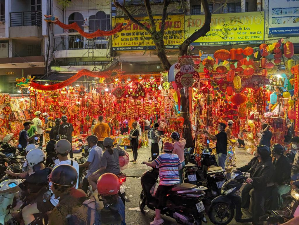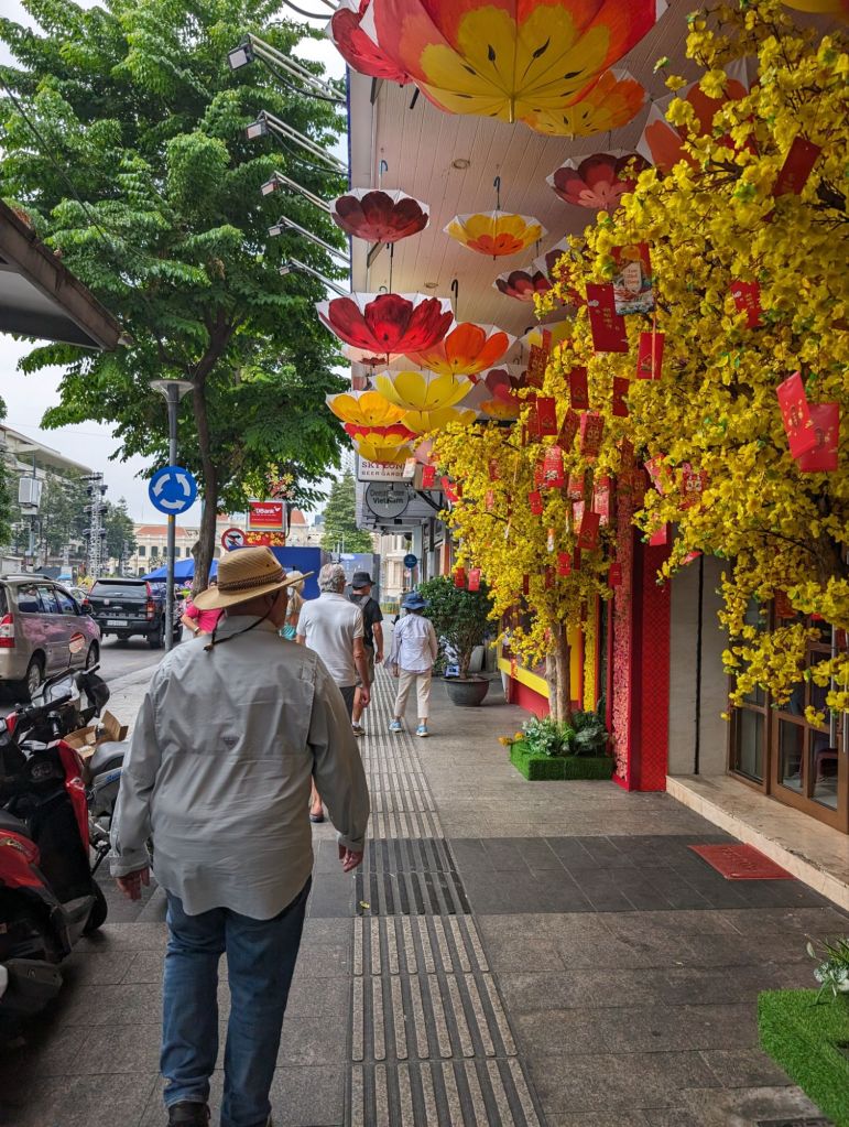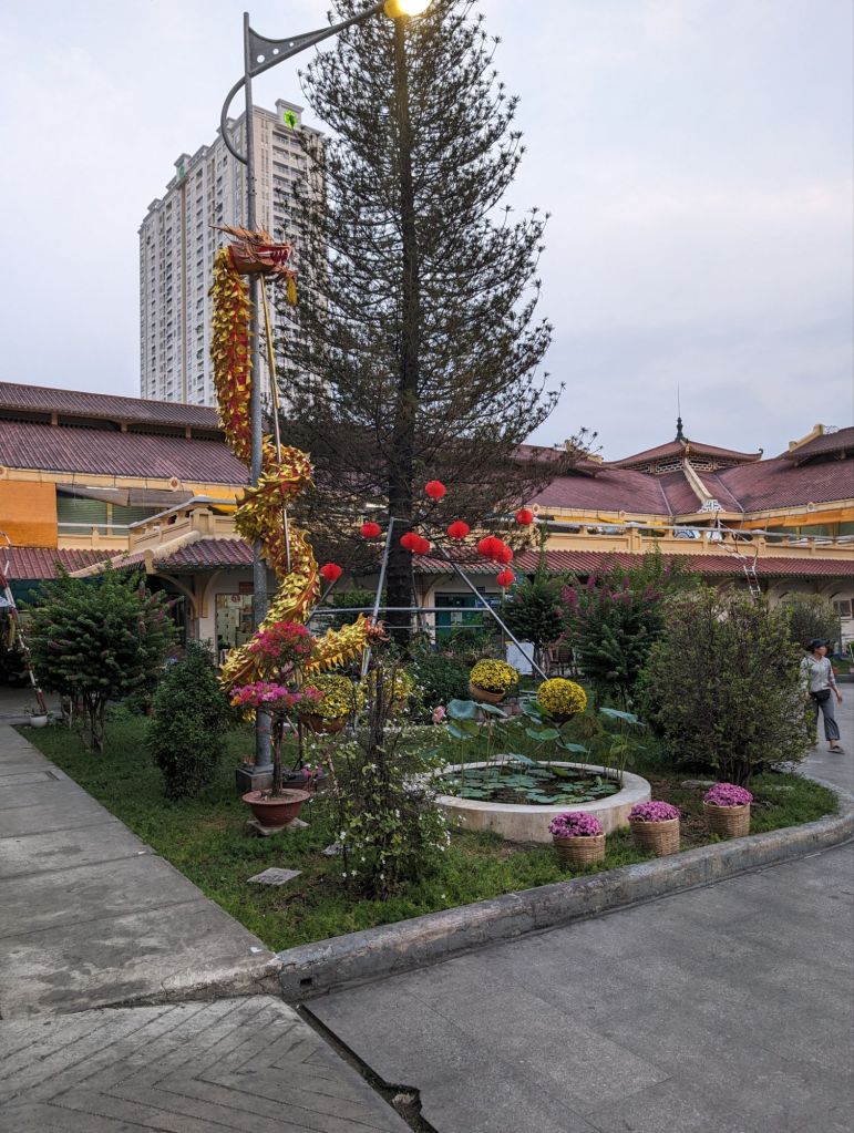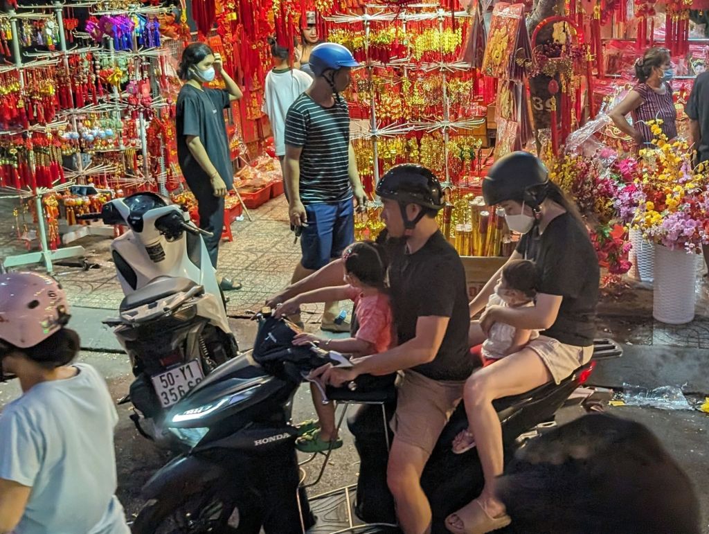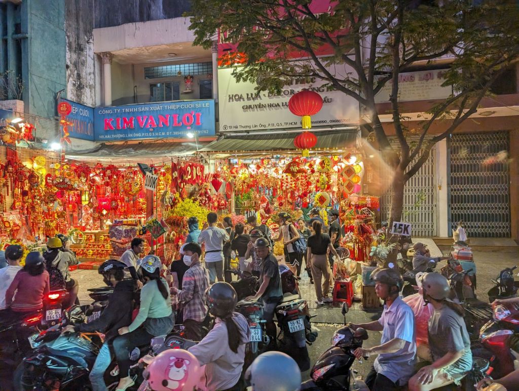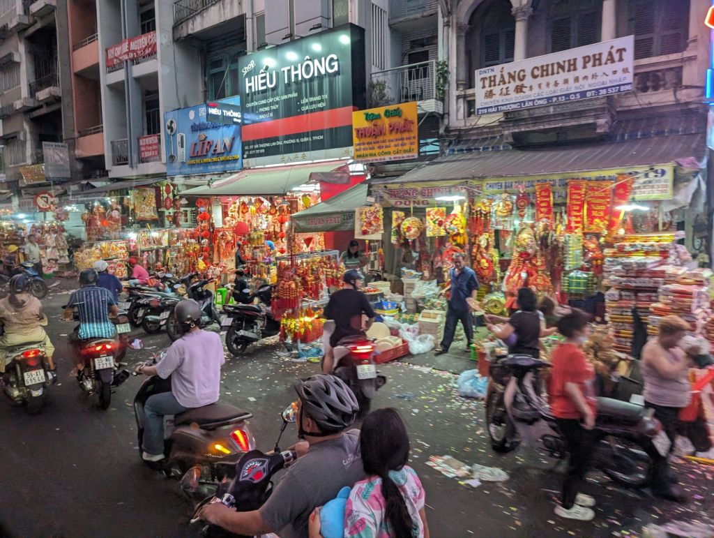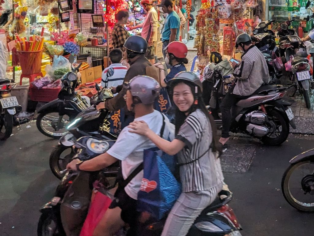 Night in the city…we ended our first day in Saigon as the city was coming alive with lights and New Year’s decorations and throngs of motorbikes were filling up the streets.