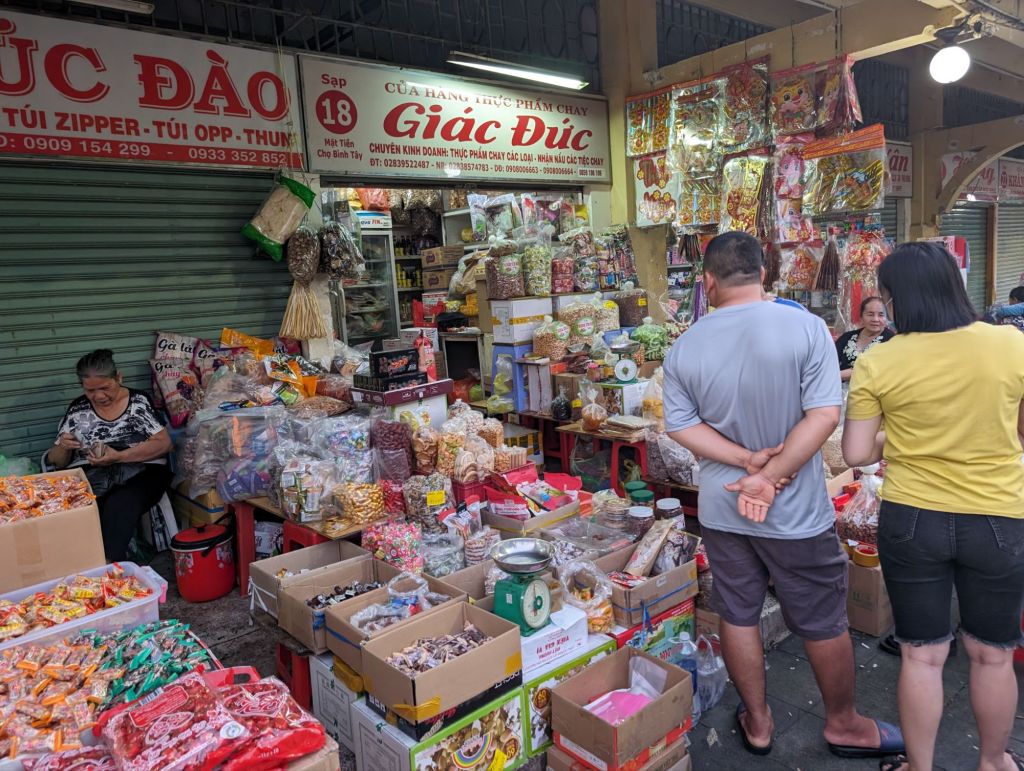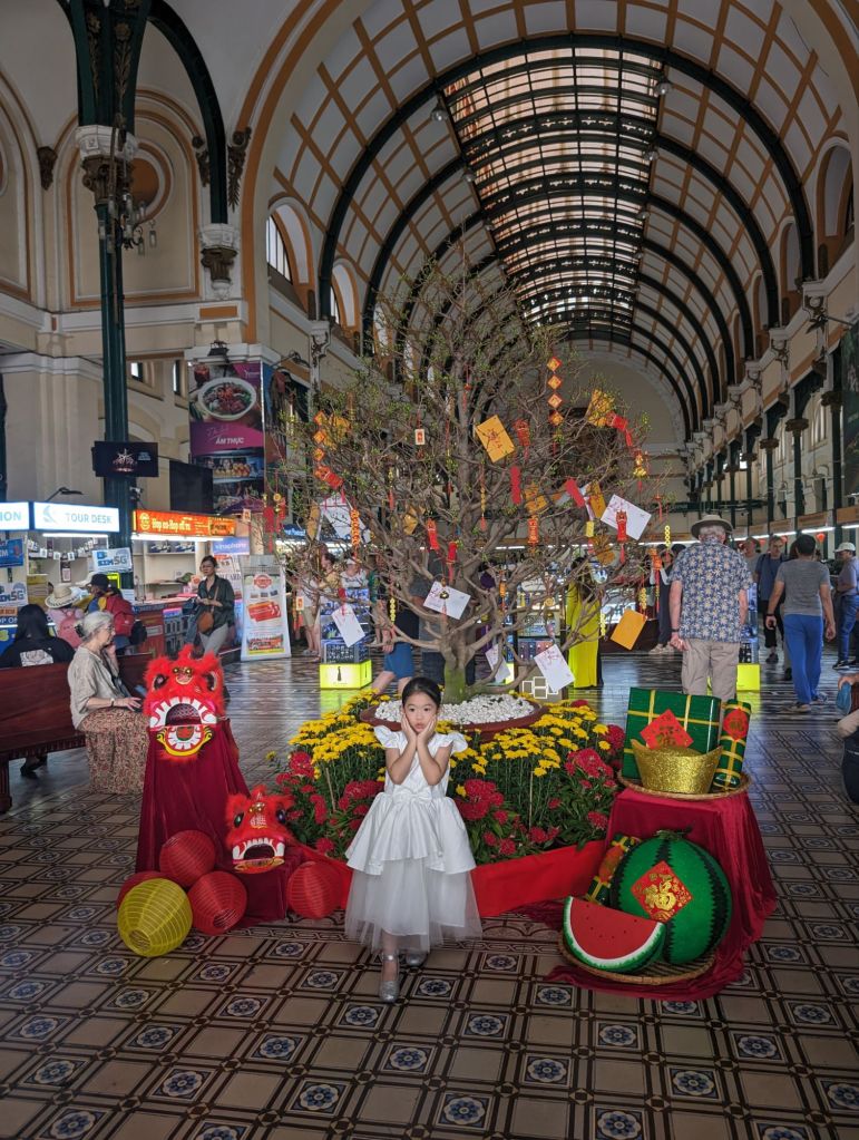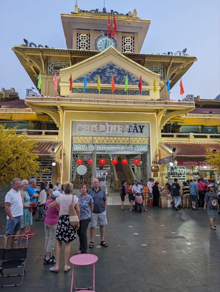 By the time we got to the Binh Tay market at the end of our day, most of the vendors were shutting down or gone. Our guide explained the vendors were leaving town early so they could get home for the Lunar New Year. This is a huge wholesale market mainly used by the locals and one of the oldest markets in Saigon. We did get to see the lights illuminate the front clock tower, below.