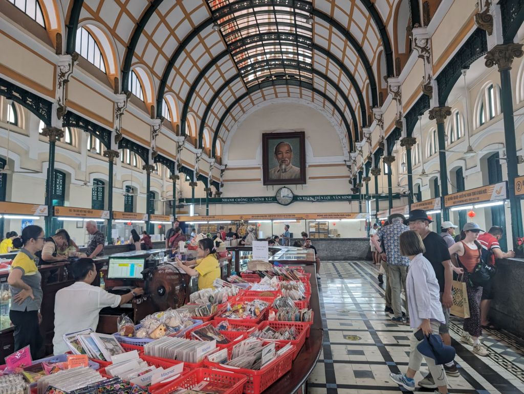 Inside, under the graceful domed ceiling, people are still doing their mail business as they have done for over a century. Of course a picture of Ho Chi Minh hangs prominently. There are also shopping opportunities in the center. Get your souvenir pictures and cards!