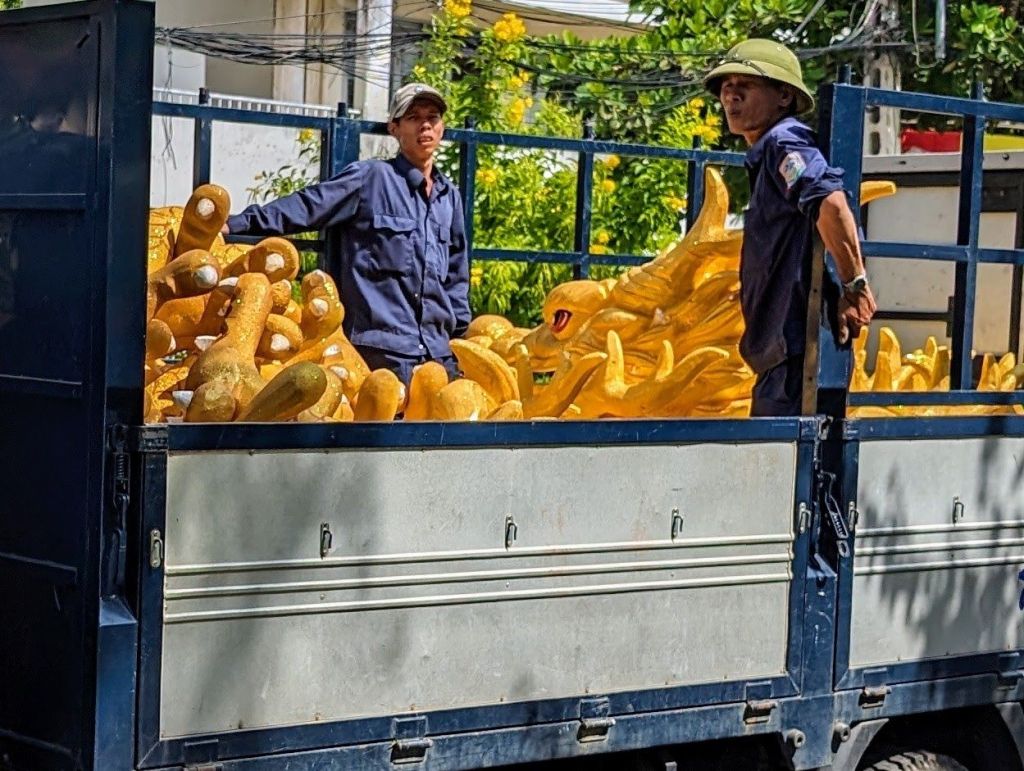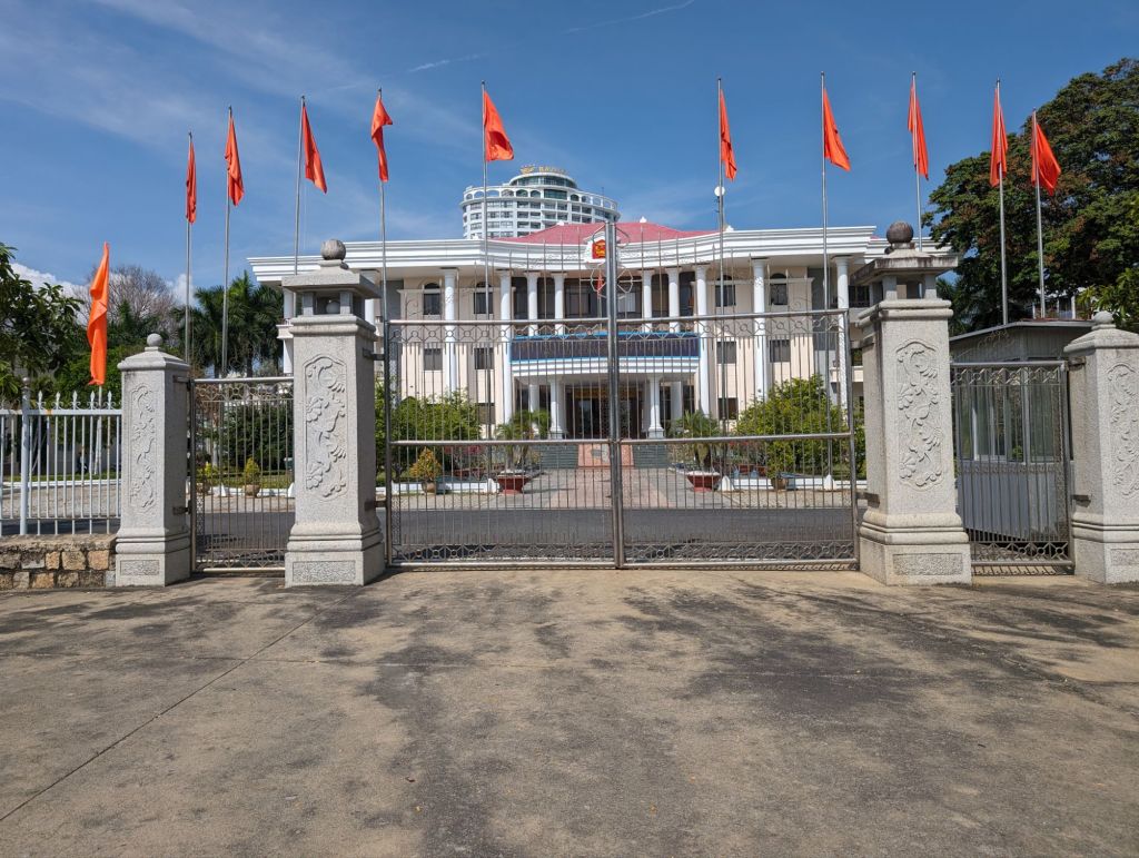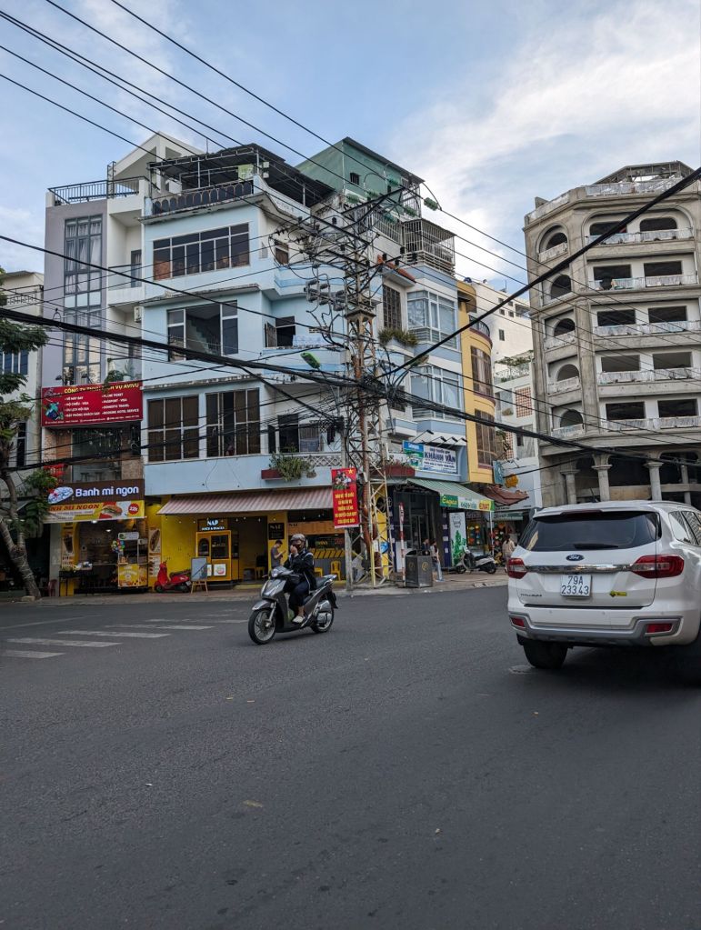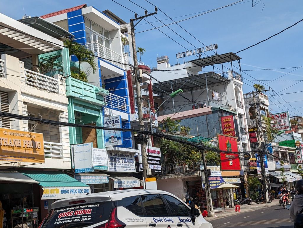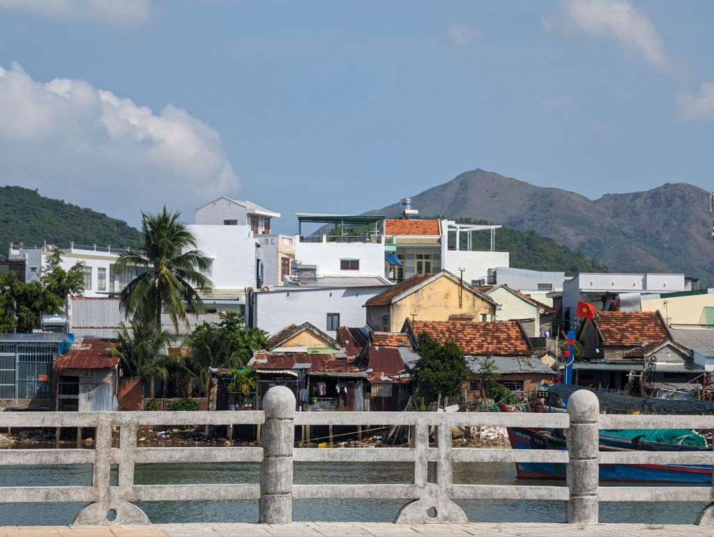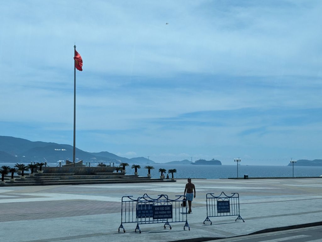 Nha Trang’s beautiful white beaches have made it an attractive tourist draw for decades. The building boom in this century quadrupled the population, but was toppled into crisis by COVID.Right next to the modern high rise hotels are still the older, traditional style buildings with their mass of jerry-rigged electrical wires snaking across the streets.Look closely at the French Colonial style building on the left and you can see the Buddha statue on the roof.Riverfront homes, often built on stilts, that are now slums are a feature of many of the cities we’ve visited.The hodgepodge of architectural styles from this city’s different phases and settlers is evident on this street.This is the local government building or, as the sign calls it, “The People’s Committee.”Nha Trang is known for its Disneyesque amusement park, the Vinpearl. We had a good view of it from our ship.Everyone loves a bargain, including these monks shopping at a local market.