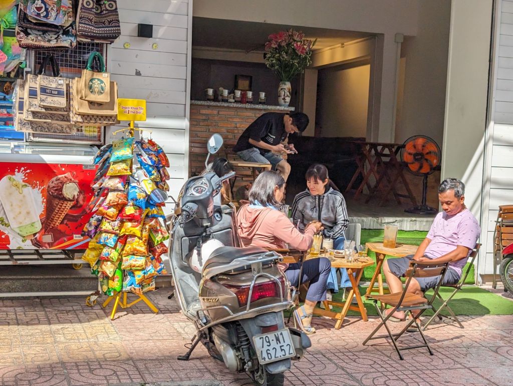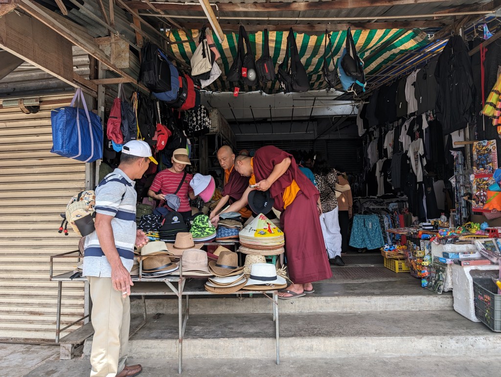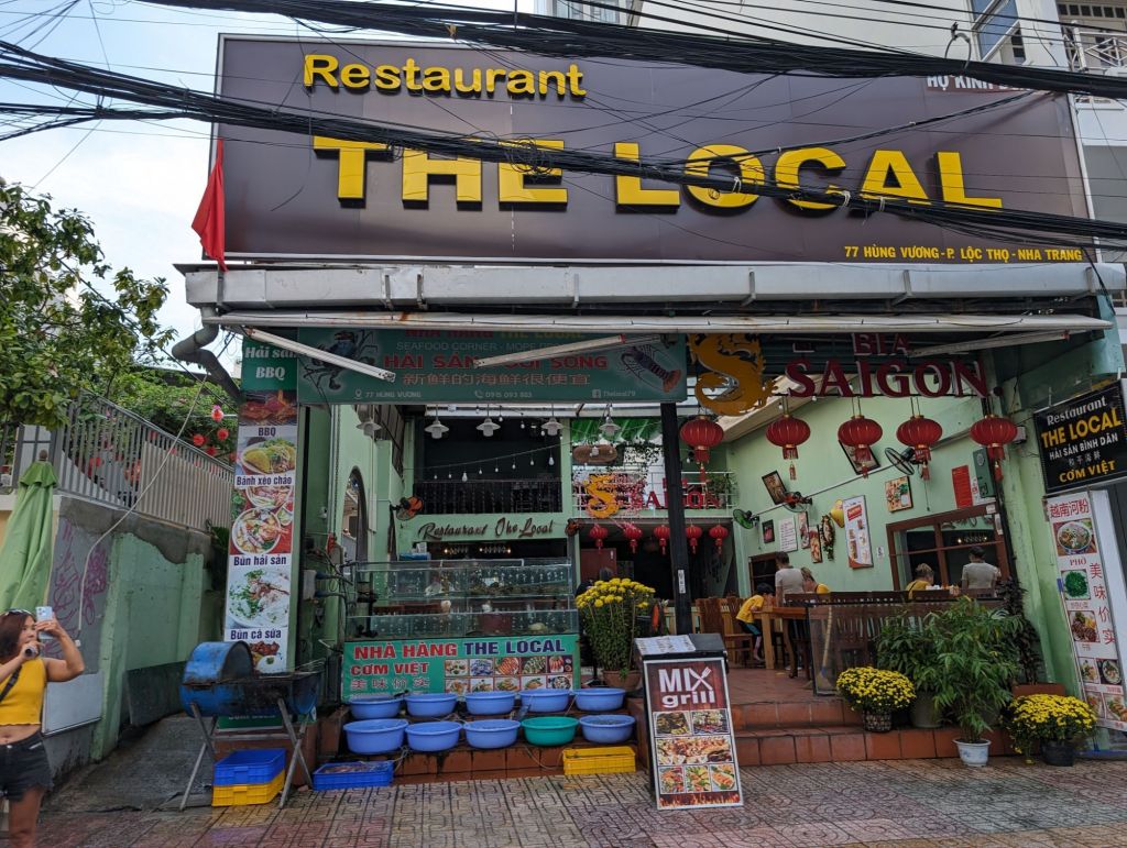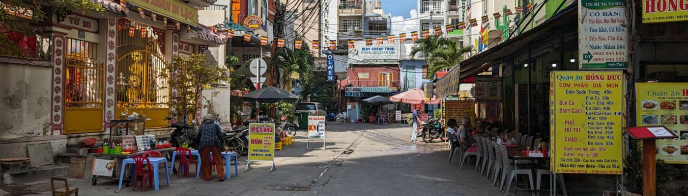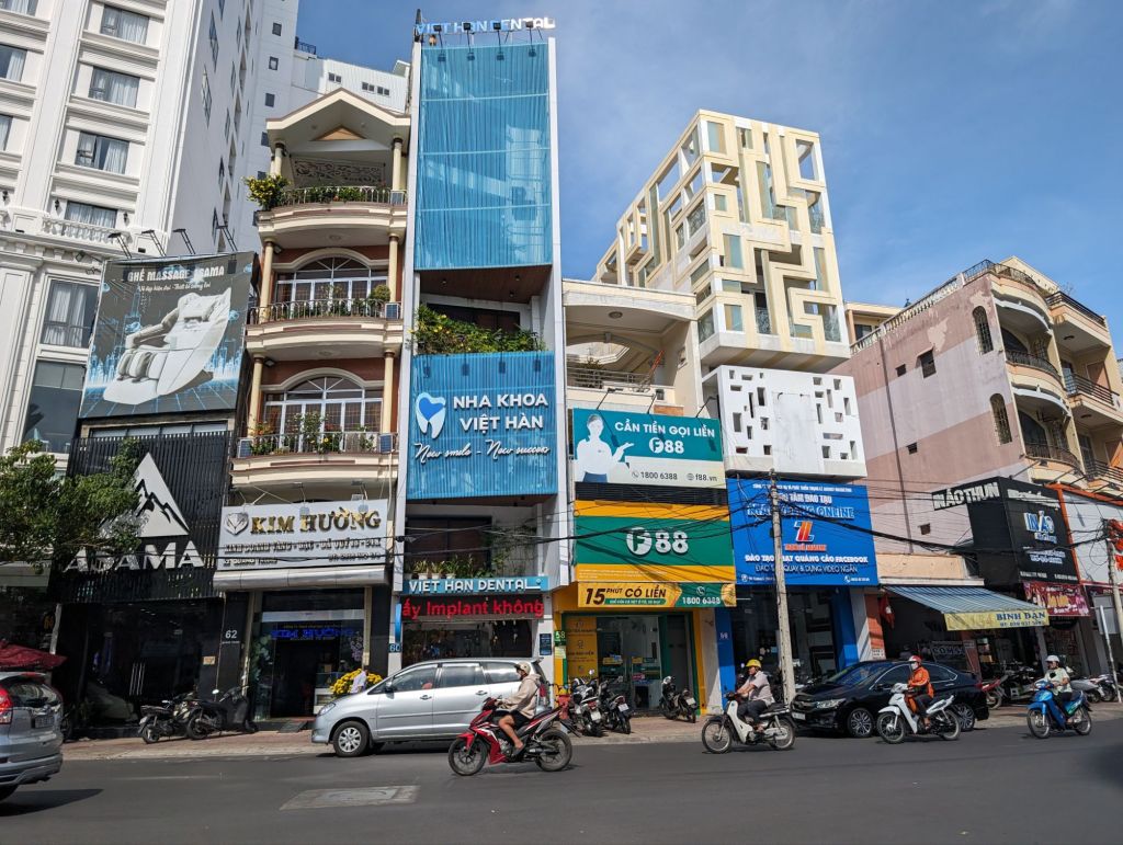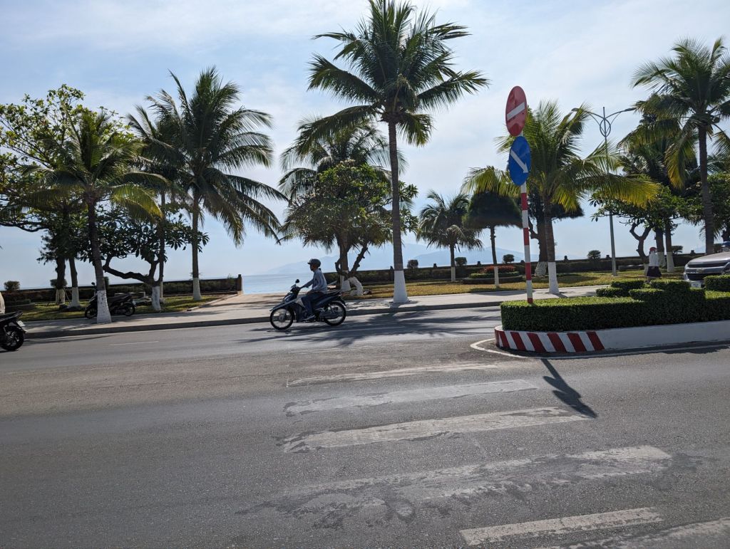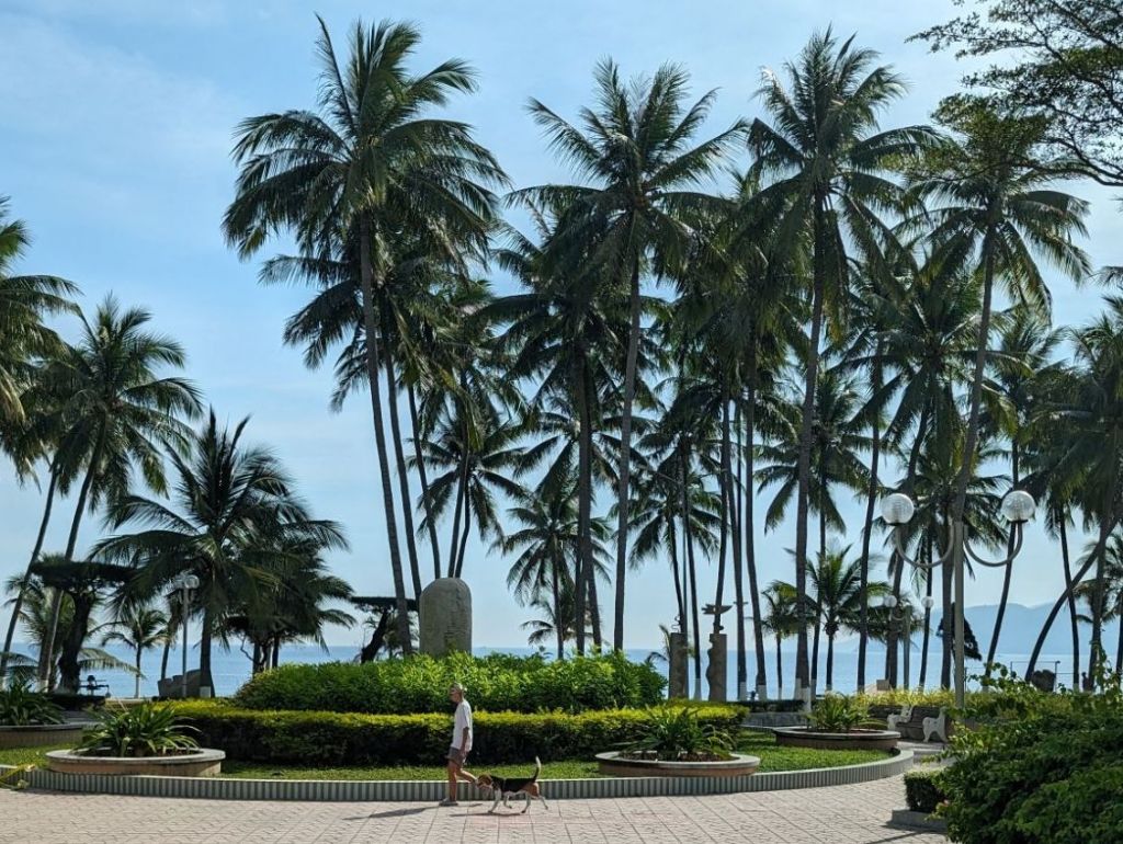 Nha Trang’s beautiful white beaches have made it an attractive tourist draw for decades. The building boom in this century quadrupled the population, but was toppled into crisis by COVID.Right next to the modern high rise hotels are still the older, traditional style buildings with their mass of jerry-rigged electrical wires snaking across the streets.Look closely at the French Colonial style building on the left and you can see the Buddha statue on the roof.Riverfront homes, often built on stilts, that are now slums are a feature of many of the cities we’ve visited.The hodgepodge of architectural styles from this city’s different phases and settlers is evident on this street.This is the local government building or, as the sign calls it, “The People’s Committee.”Nha Trang is known for its Disneyesque amusement park, the Vinpearl. We had a good view of it from our ship.Everyone loves a bargain, including these monks shopping at a local market.