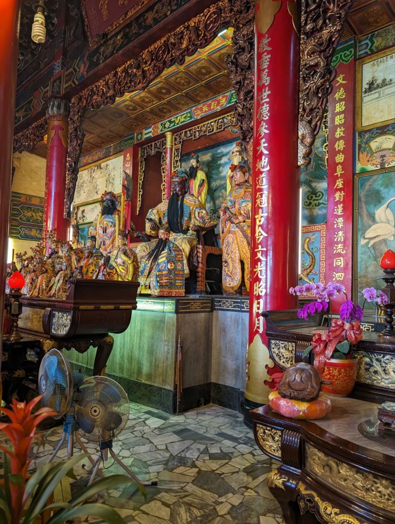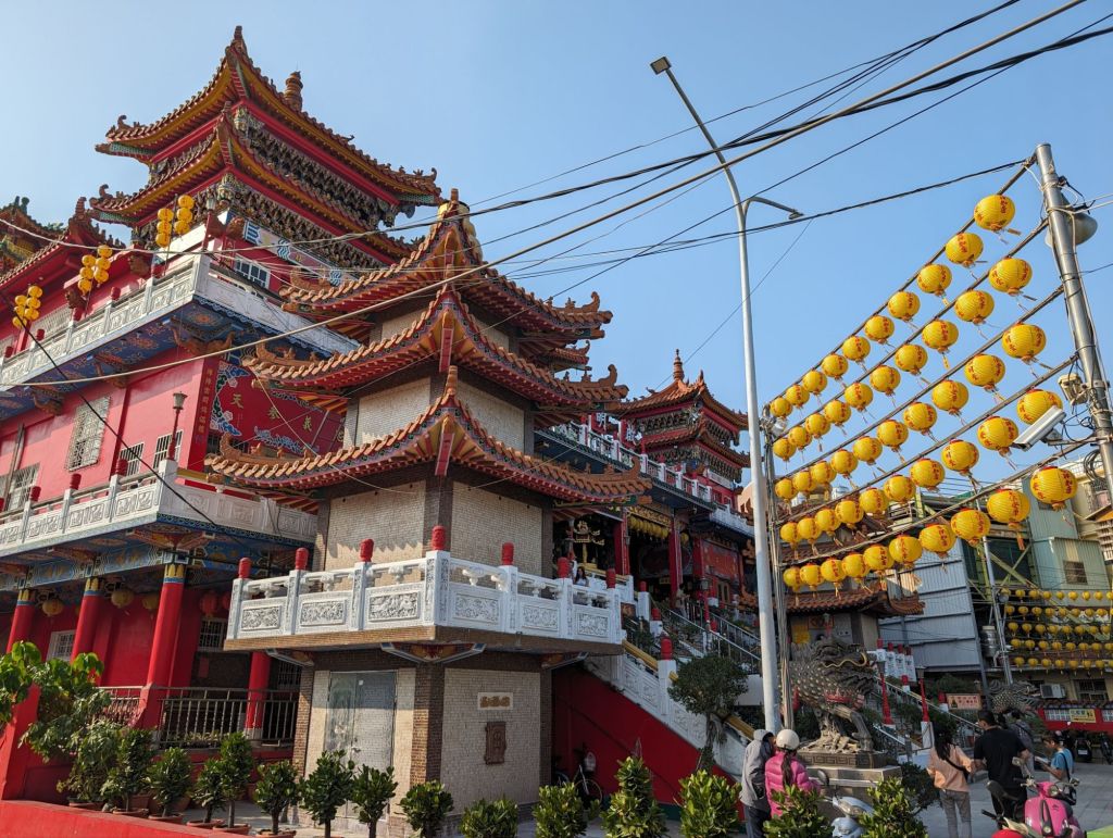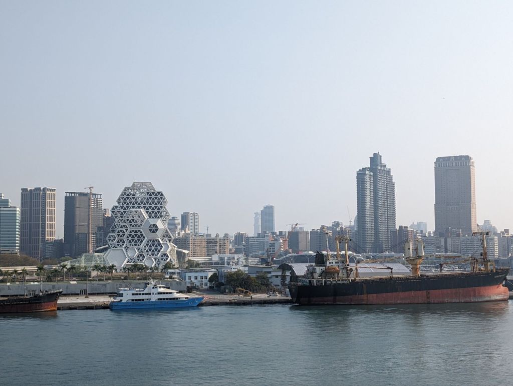 This major port city of 2.7 million was our first visit in Taiwan. Kaohsiung has changed massively in the last few years. Driving through, we could see the transition from a polluted industrial center to an attractive city with parks, waterfront sports and temples. Below is an example of the city’s two faces–a commercial vessel docked near the city’s new, unusual looking music center.