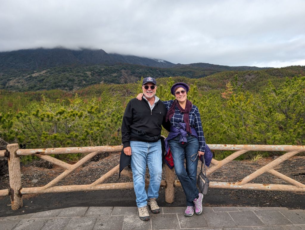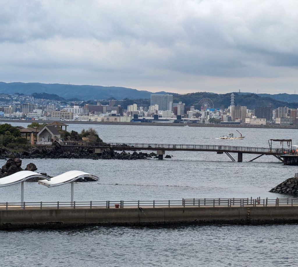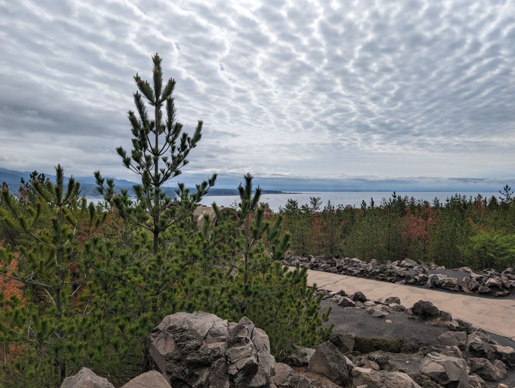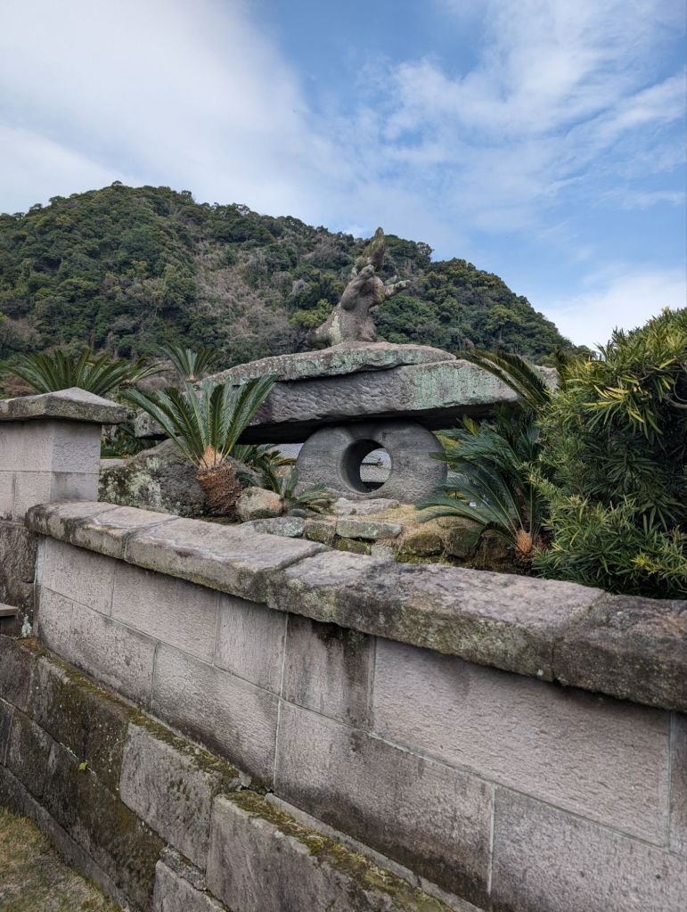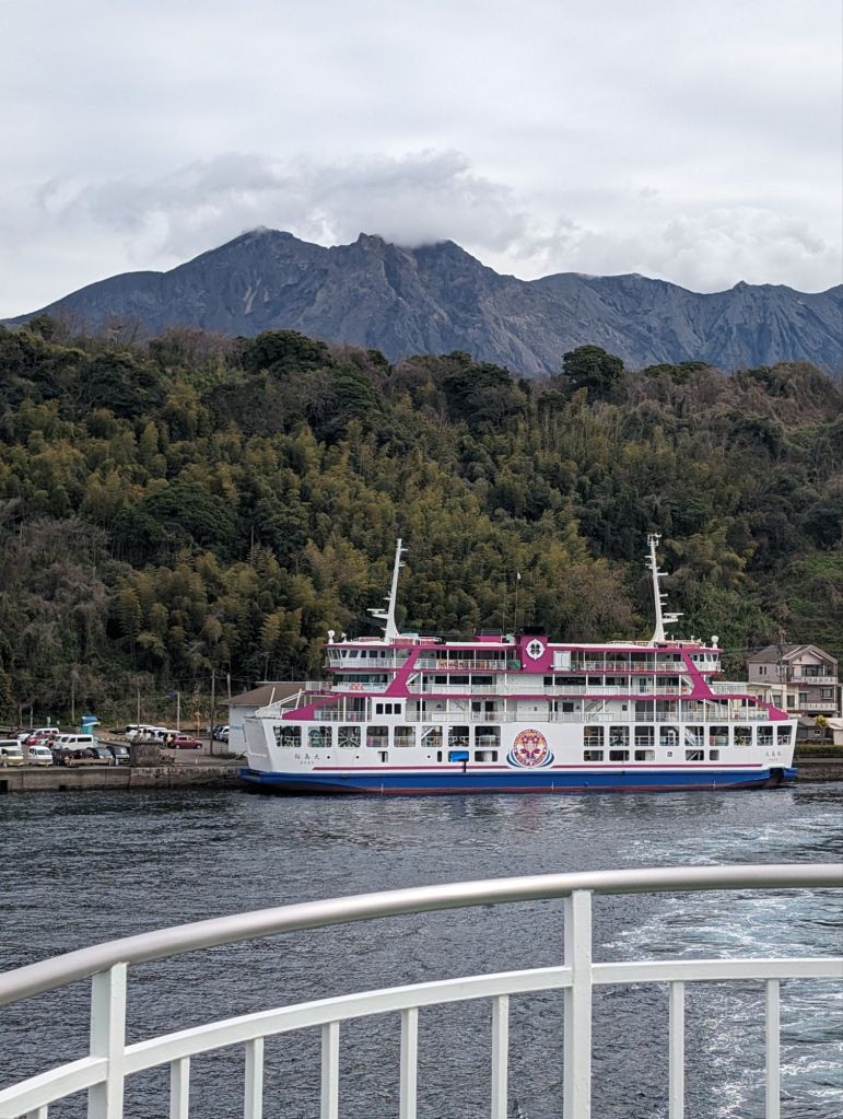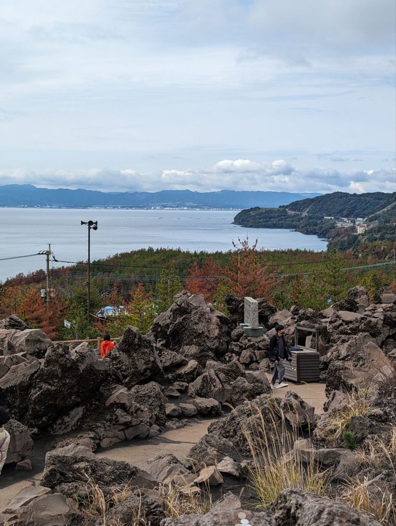 We’re on the ferry on the way to see Sakurajima. You can see it shrouded in clouds behind us.On the ride back we could see the beautiful mountain clearly.We walked up the Nagisa Lava Trail, winding through huge boulders of lava rocks.This monument at the observation area for the volcano tells you we were there, our guide says. The inscription is a haiku poem by the famous Japanese poet, Takano Soju. Google translates the poem as, ” First butterfly, hitting the rock, I hit it!” I don’t think Google translate really understands poetry.People leave coins for good luck on the lava rocks near the monument. What’s amazing is that the coins just sit there and no one takes them.This is a city view of Kagoshima from the ferry. On the right you can see the city’s popular large Ferris wheel. We didn’t get a chance to ride on it.