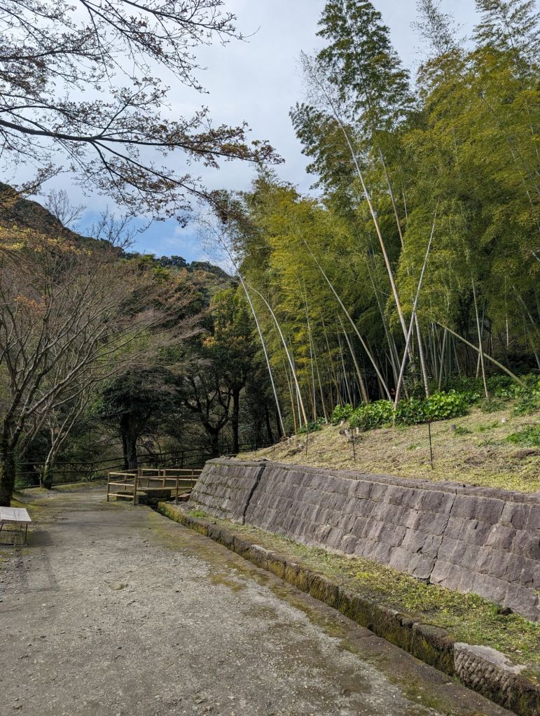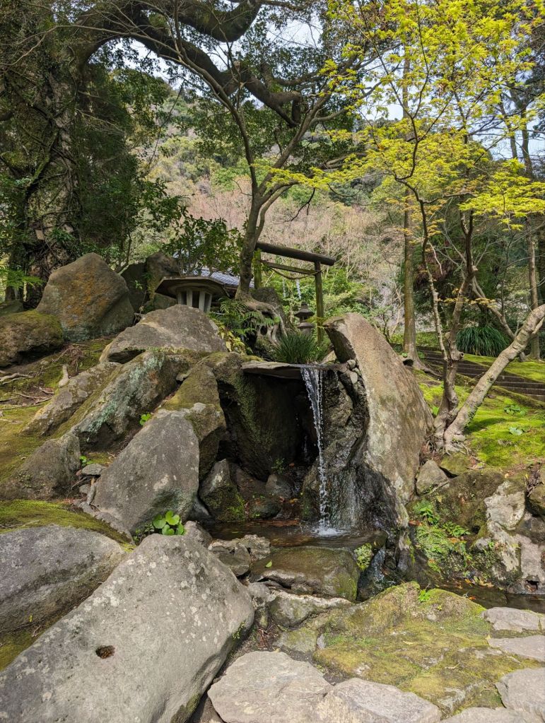 This is the original man gate to the gardens and features a roof made of Kagoshima tin. Only the Lord of the house and his first son were allowed to use this gate.The Oniwa shrine is considered the luckiest in this garden. The 13 different gods enshrined here will answer prayers for marital bliss, school success, safety in travel and more.The tall bamboos growing along this embankment gracefully bend over the creek.