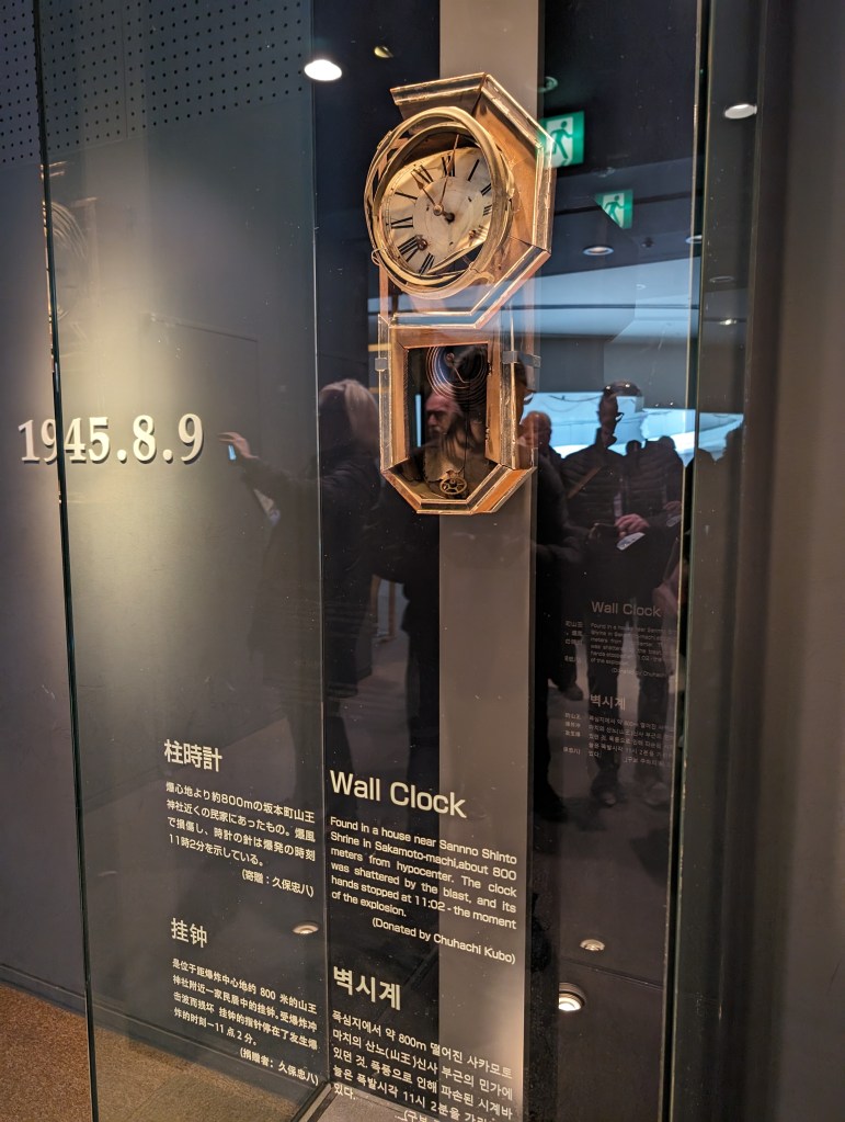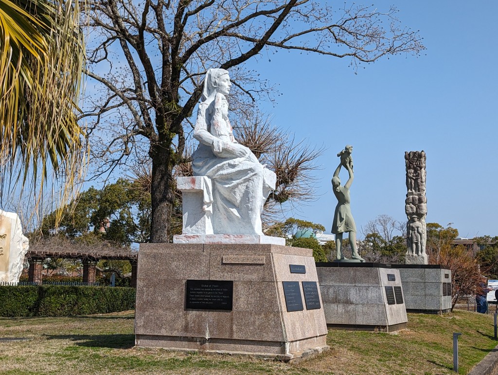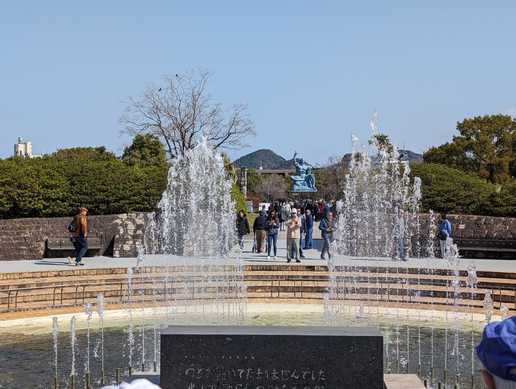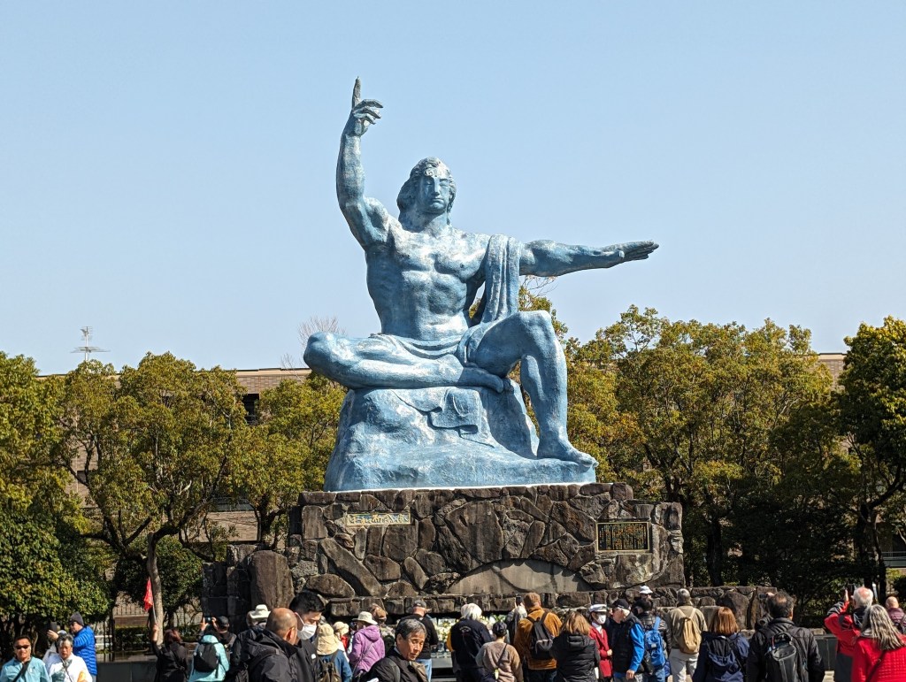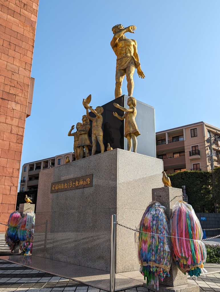 The Nagasaki Atomic Bomb Museum takes visitors through the city’s horrific experience and ends with a call for peace.The gold peace statue outside the museum is dedicated to children. These colorful strings of origami paper cranes are made by schoolchildren and donated to the museum. The crane symbolizes peace and longevity. Each string has 1,000 cranes in honor of a child who got cancer after exposure to the bomb’s radiation. She folded her medication paper into cranes each day hoping 1,000 cranes would give her long life. Sadly, she did not survive.As you go down a long, curved ramp, the first exhibit that greets you is this gold clock. It was found about 800 meters from the blast explosion. It was shattered by the explosion and its hands had stopped at 11:02, the moment of the blast.On one side of a huge exhibition room is a fragment of the wall of the destroyed Urakami Cathedral. Until that time, The Urakami Cathedral was the grandest church in east Asia.On one side of a huge exhibition room is a fragment of the wall of the destroyed Urakami Cathedral.There are rows of beautiful statues in the Peace Park donated by countries from around the world. All of them speak to the hope of peace.These memorial monuments, above and below, are at the exact ground zero of the blast.A view of the Peace Park.The large fountain in the park symbolizes the calls for water by the victims of the bomb. It frames the Peace Statue in the distance.The 10-meter tall Peace Statue is a centerpiece of the park. Its right hand points up to the sky towards the threat of nuclear weapons. The left arm is extended out in a gesture of peace. The eyes are closed in prayer for the bomb’s victims.This mother and child memorial is inscribed with the date of the explosion.This monument, called the Nagasaki Peace Bell, displays the bell from the Urakami Cathedral. The nearby cathedral was mostly destroyed in the blast. The placards on the posts give moving stories from survivors.