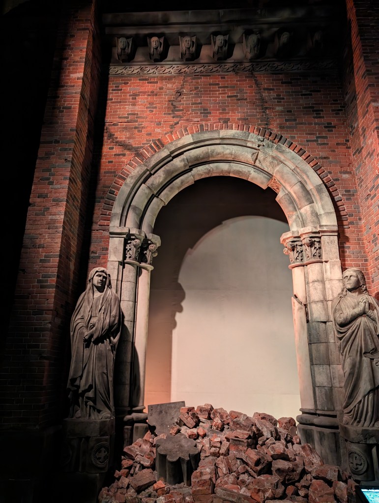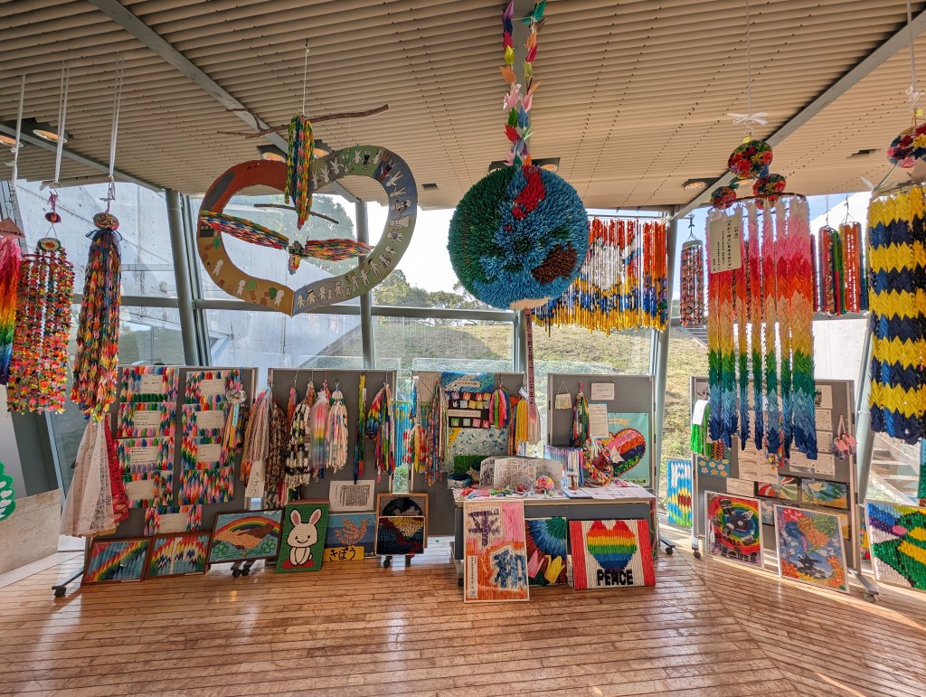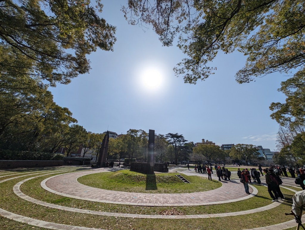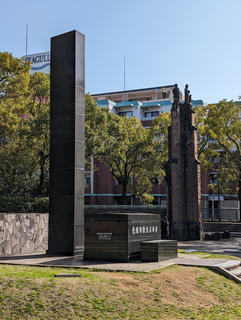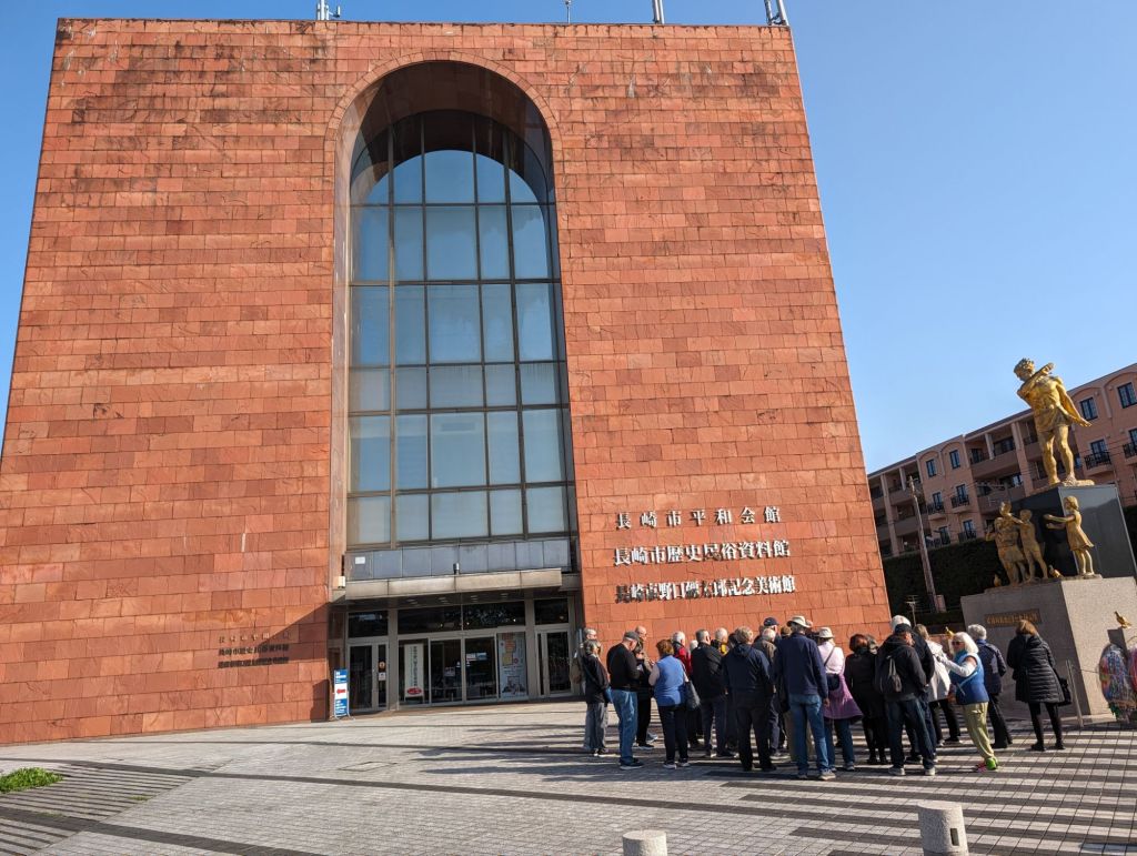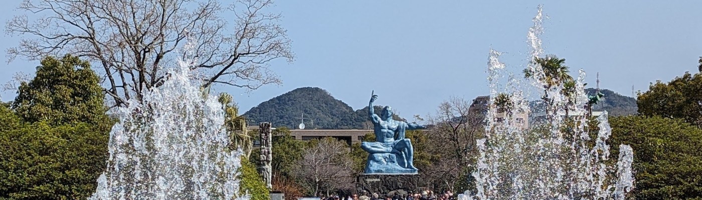 The Nagasaki Atomic Bomb Museum takes visitors through the city’s horrific experience and ends with a call for peace.The gold peace statue outside the museum is dedicated to children. These colorful strings of origami paper cranes are made by schoolchildren and donated to the museum. The crane symbolizes peace and longevity. Each string has 1,000 cranes in honor of a child who got cancer after exposure to the bomb’s radiation. She folded her medication paper into cranes each day hoping 1,000 cranes would give her long life. Sadly, she did not survive.As you go down a long, curved ramp, the first exhibit that greets you is this gold clock. It was found about 800 meters from the blast explosion. It was shattered by the explosion and its hands had stopped at 11:02, the moment of the blast.On one side of a huge exhibition room is a fragment of the wall of the destroyed Urakami Cathedral. Until that time, The Urakami Cathedral was the grandest church in east Asia.On one side of a huge exhibition room is a fragment of the wall of the destroyed Urakami Cathedral.There are rows of beautiful statues in the Peace Park donated by countries from around the world. All of them speak to the hope of peace.These memorial monuments, above and below, are at the exact ground zero of the blast.A view of the Peace Park.The large fountain in the park symbolizes the calls for water by the victims of the bomb. It frames the Peace Statue in the distance.The 10-meter tall Peace Statue is a centerpiece of the park. Its right hand points up to the sky towards the threat of nuclear weapons. The left arm is extended out in a gesture of peace. The eyes are closed in prayer for the bomb’s victims.This mother and child memorial is inscribed with the date of the explosion.This monument, called the Nagasaki Peace Bell, displays the bell from the Urakami Cathedral. The nearby cathedral was mostly destroyed in the blast. The placards on the posts give moving stories from survivors.