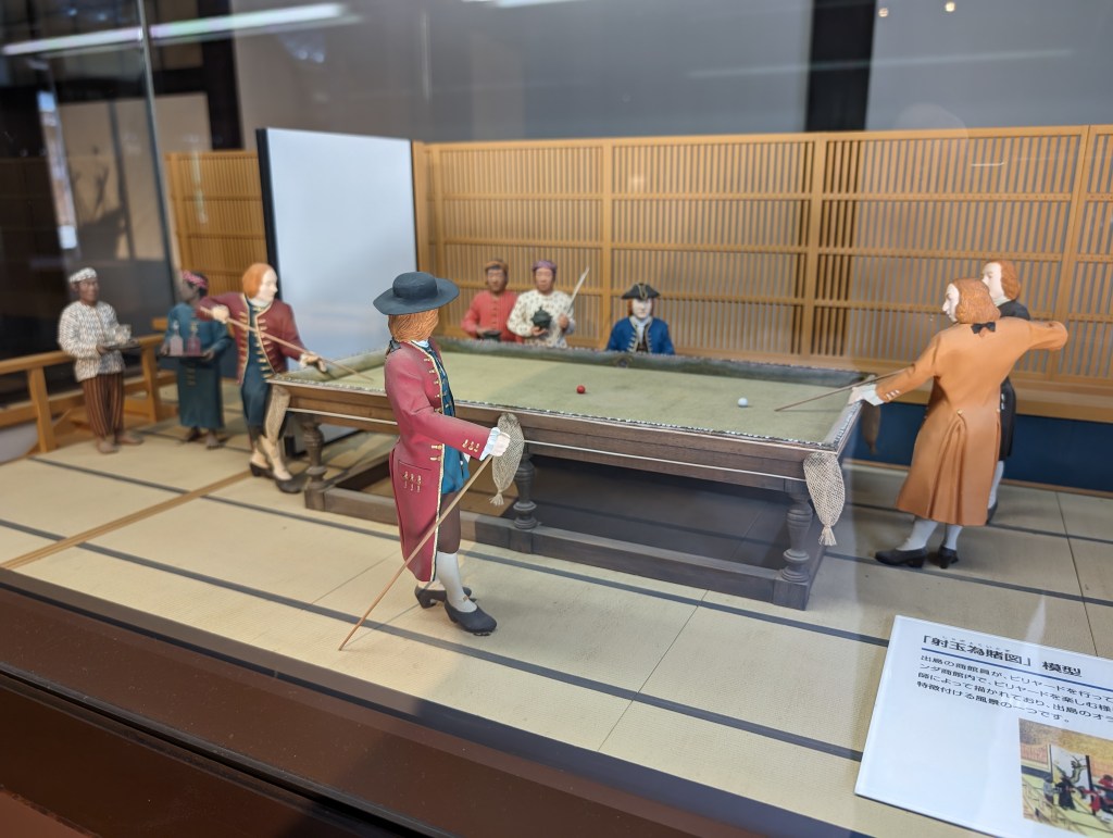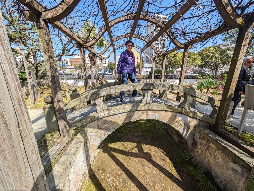 We left the Peace Park and visited a totally different era in Nagasaki’s history. The Dejima settlement began in 1636 as a place for the Portuguese to live and trade in Japan. But they were soon evicted by the local shogun, partly for their efforts to bring Catholicism to the area. The Dutch, who were Protestant and less threatening culturally, were allowed to move there. This became the Japan’s only trading port with Europe during its 200-year isolation period and its source of information for becoming a modern nation. Today the settlement has been restored and recreated to showcase its contributions to Japan.