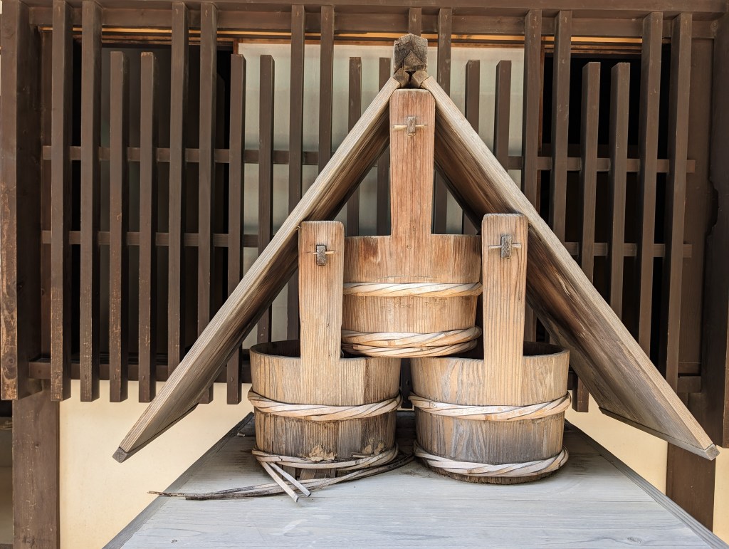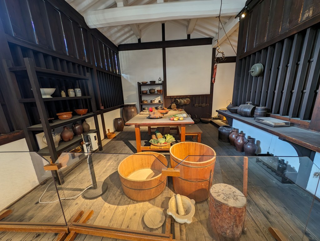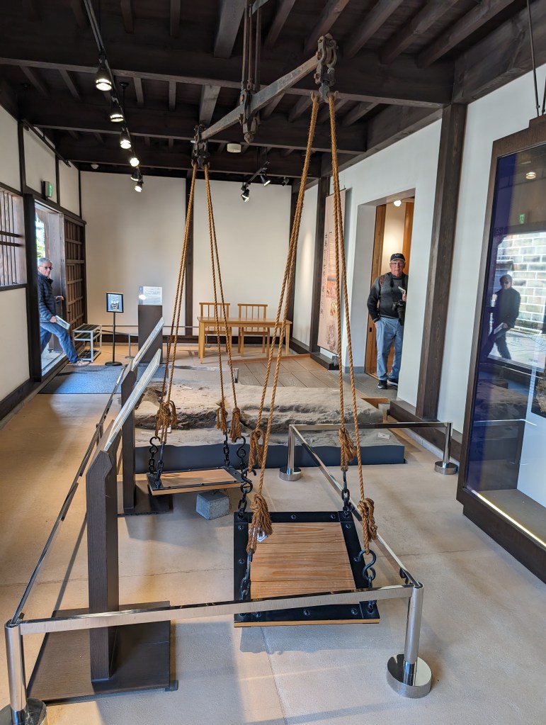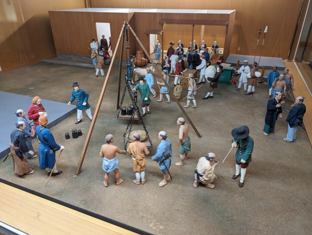 Jeanne is crossing the bridge over to the Dejima settlement.This model depicts the busy trading port.There were people in period dress available to show us the displays.More than half a century went into excavating and researching the original Dejima. This is a model of the Dejima is an exact recreation. It included homes, warehouses and offices.There were spaces for socializing and entertaining.This pulley system was used for moving and measuring goods.This building was the area’s first private club.A kitchen area shows how the people lived and ate. Note the settlement’s combination of Japanese and western architecture. The major restoration project has brought 16 buildings from the early 19th century back to life.