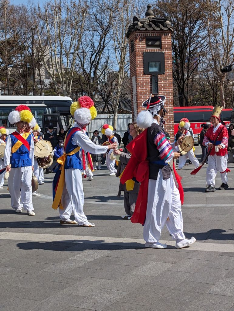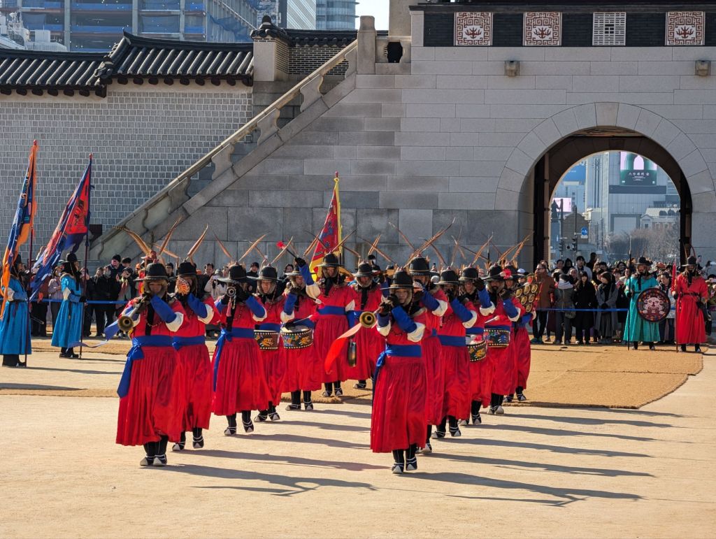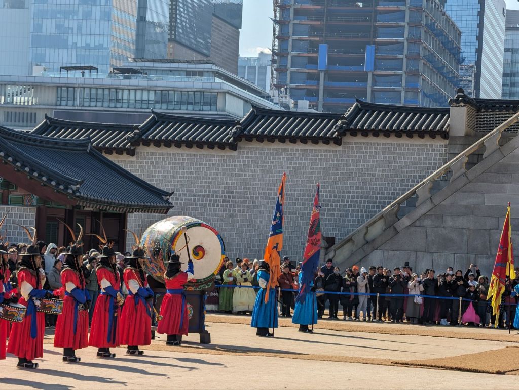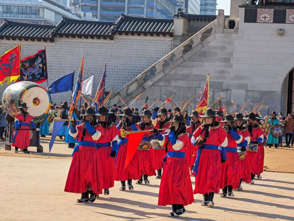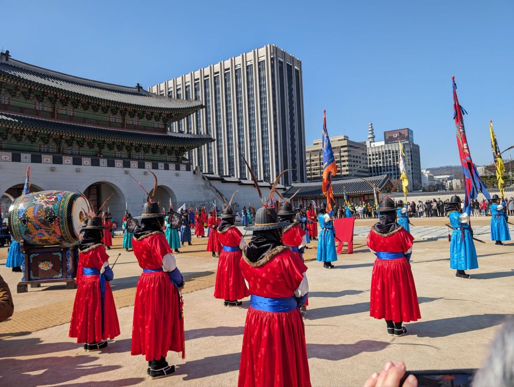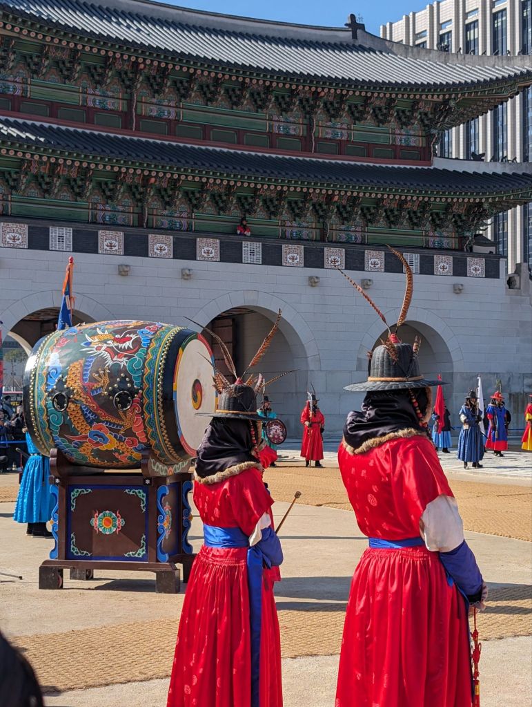 Our first visit in Seoul was to the Gyeongbokgung Palace where we watched the changing of the royal guards’ ceremony. Korea no longer has a monarchy, but the ceremony reenacts the custom of the royal court during the Joseon Dynasty, beginning in the 14th century, to ensure the security of the king and his court. Traditional costumes are worn, drums echo and music plays at this faithful reenactment. It begins at the Gwanghwamun Gate, below, the main entrance to the palace.