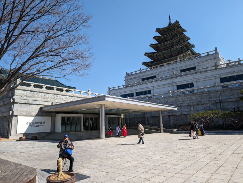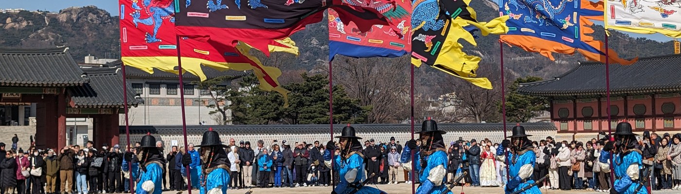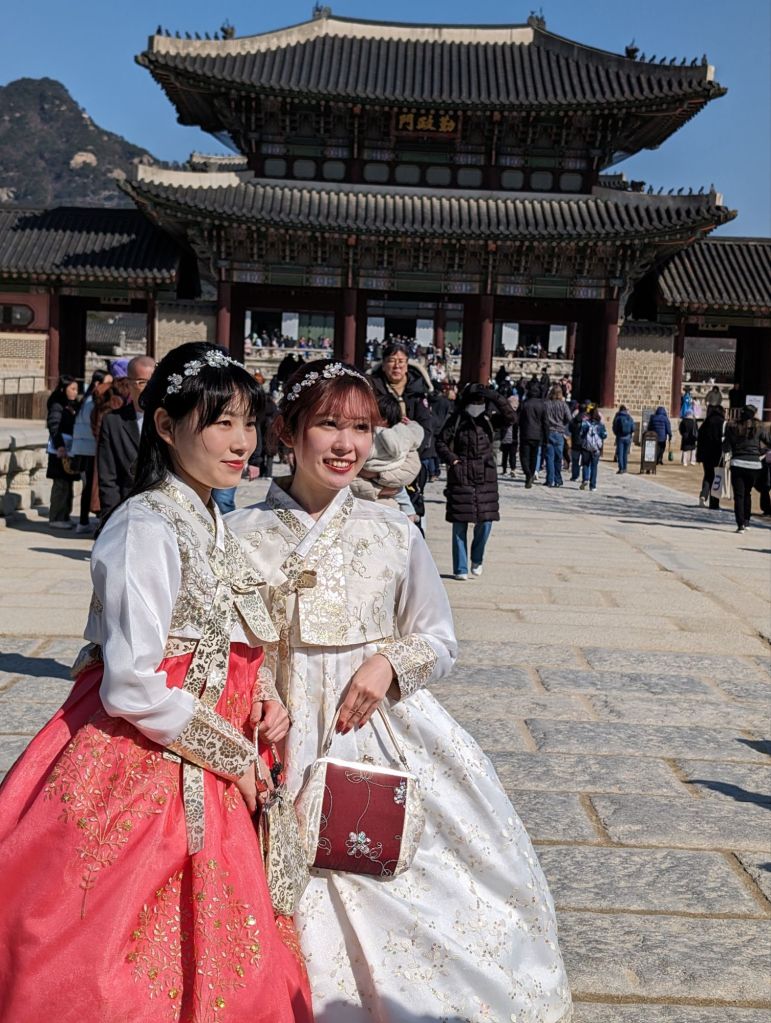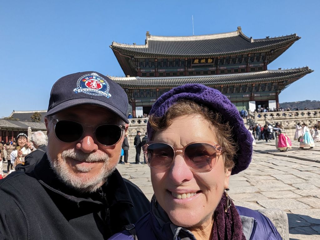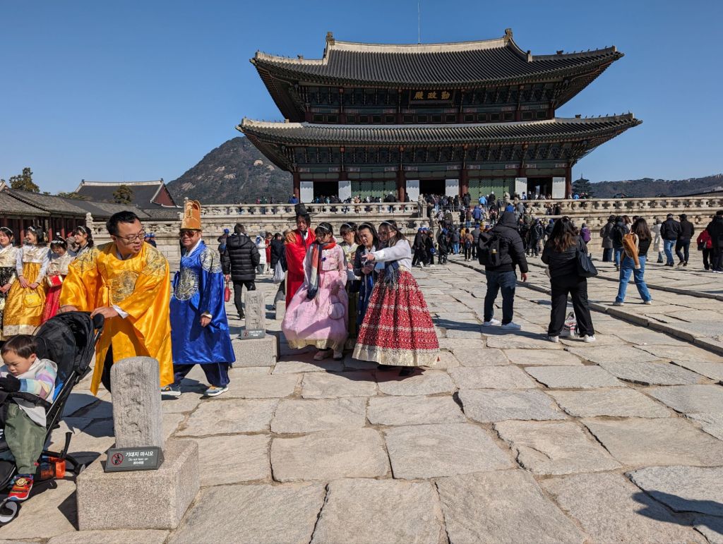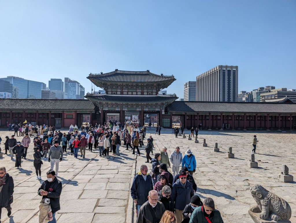 Our first visit in Seoul was to the Gyeongbokgung Palace where we watched the changing of the royal guards’ ceremony. Korea no longer has a monarchy, but the ceremony reenacts the custom of the royal court during the Joseon Dynasty, beginning in the 14th century, to ensure the security of the king and his court. Traditional costumes are worn, drums echo and music plays at this faithful reenactment. It begins at the Gwanghwamun Gate, below, the main entrance to the palace.
