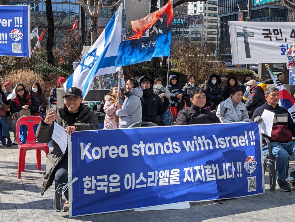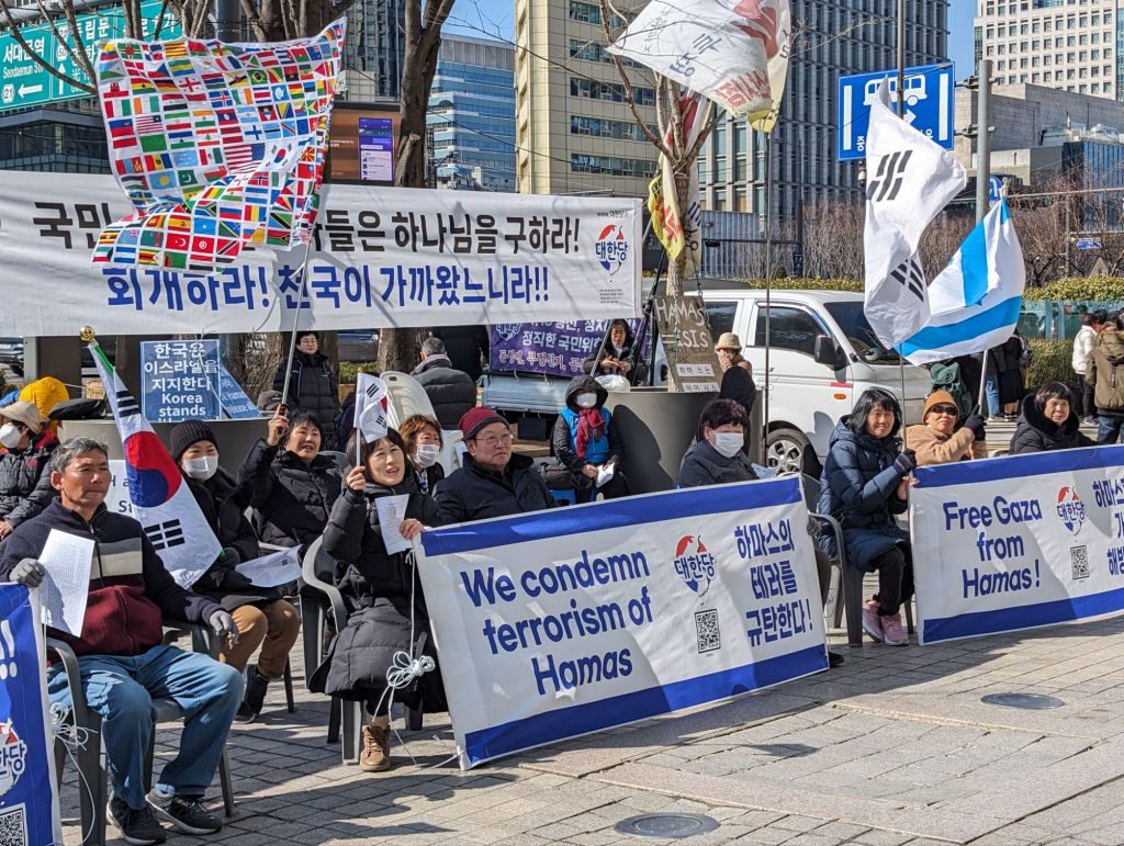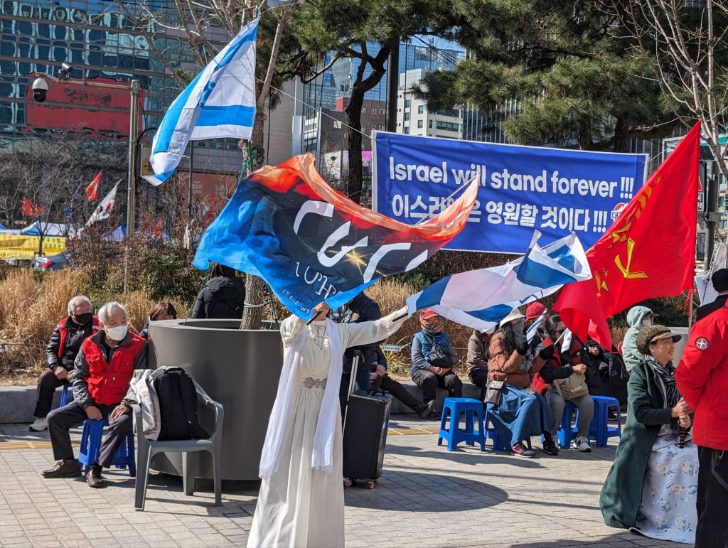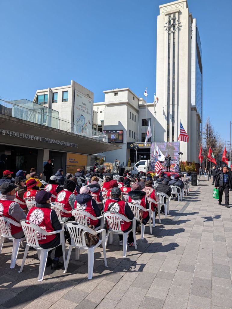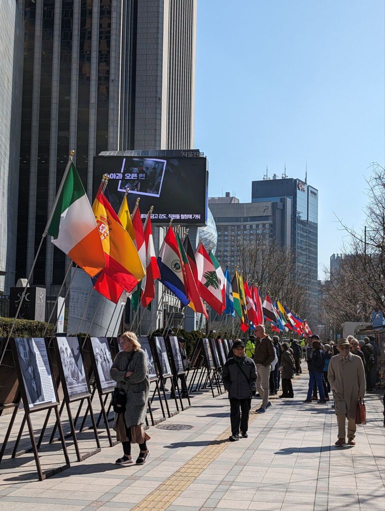 In a very different vein, on this busy downtown street, there were people listening to an anti communist speech. Below that are posters and flags depicting the dangers of communism and supporting the Korean and American alliance.