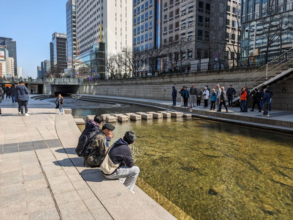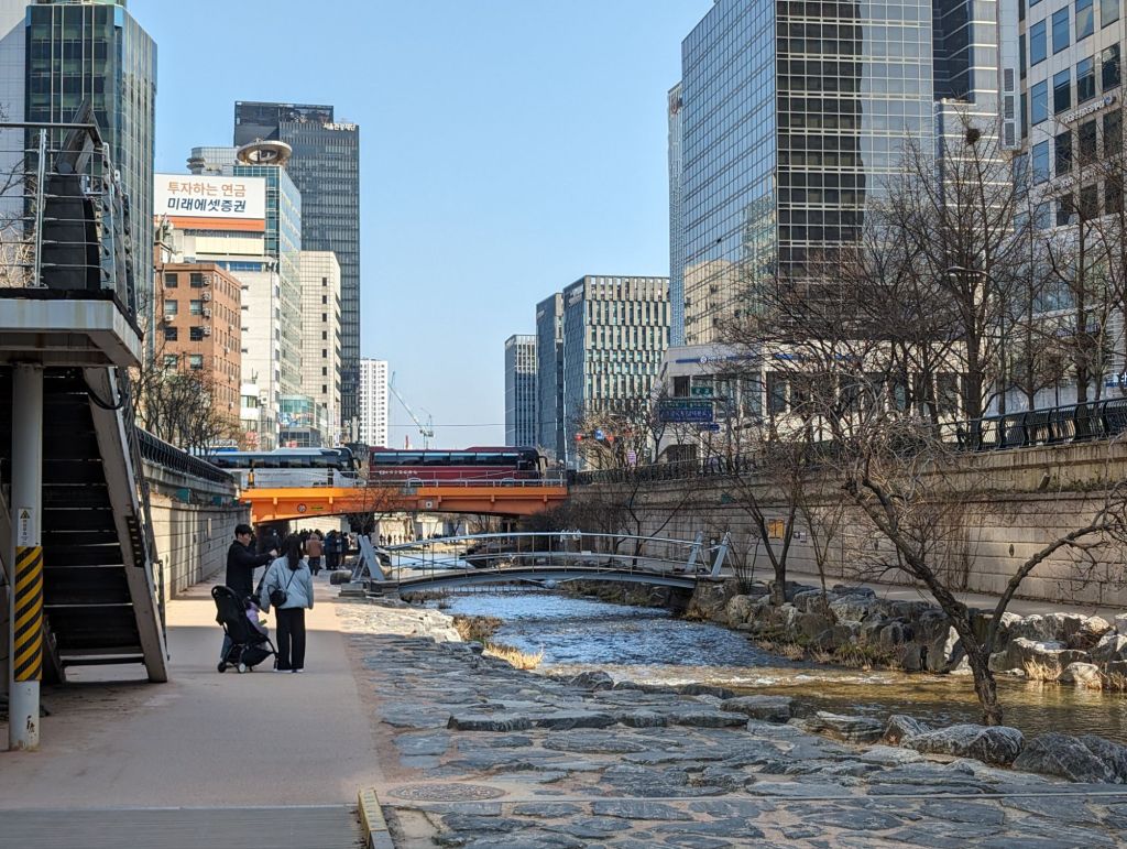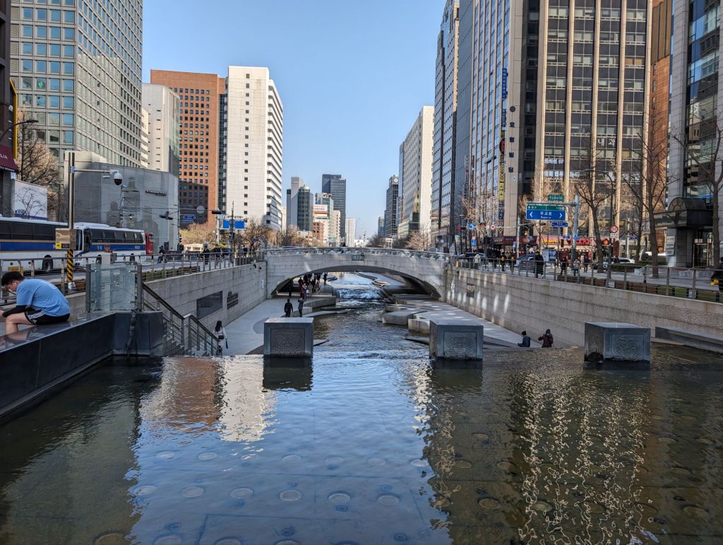 Cheonggyecheon is an innovative urban renewal project that first attracted a lot of criticism, but now is quite popular. Originally, it was a natural stream handling sewerage. After the Korean war, deteriorating conditions led to it being cemented over. A freeway overpass was built over the stream. In 2003, the government disassembled the expressway and restored the stream, creating a 6.8 mile riverwalk and public space through the heart of downtown Seoul.