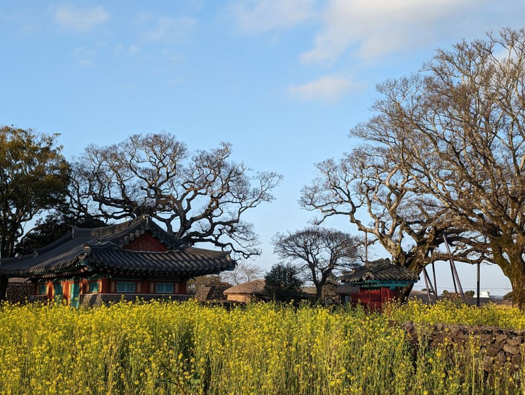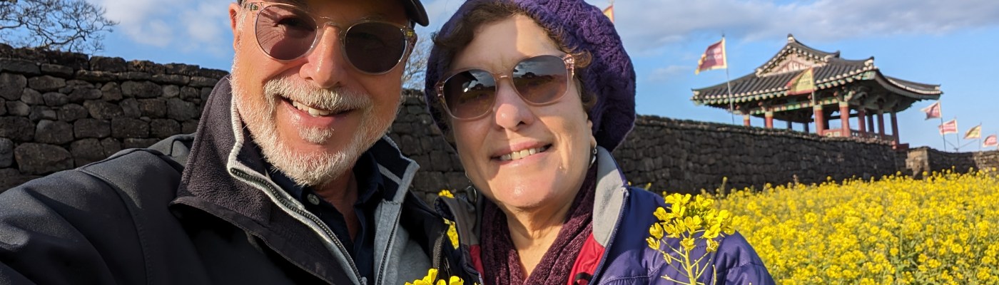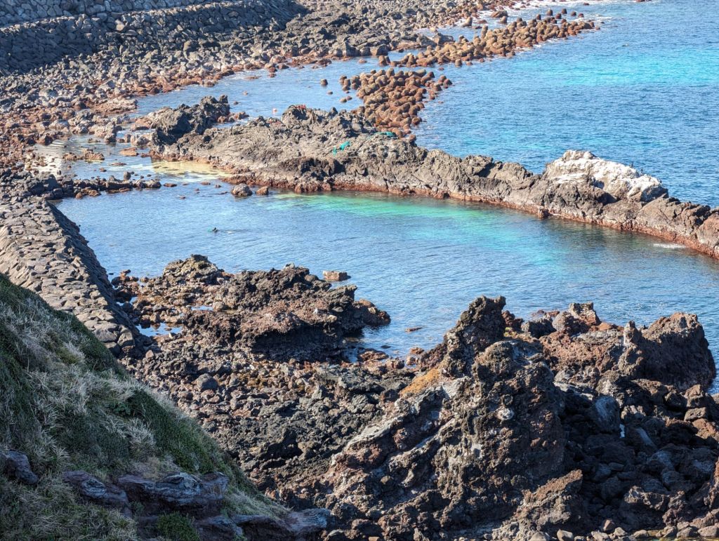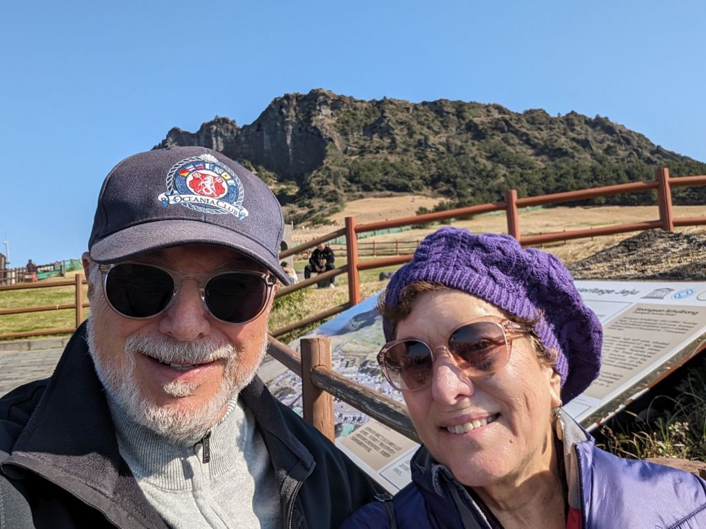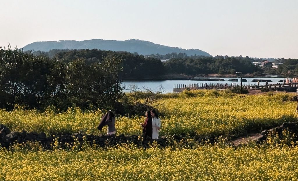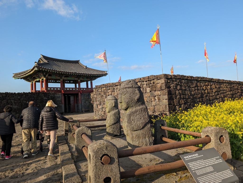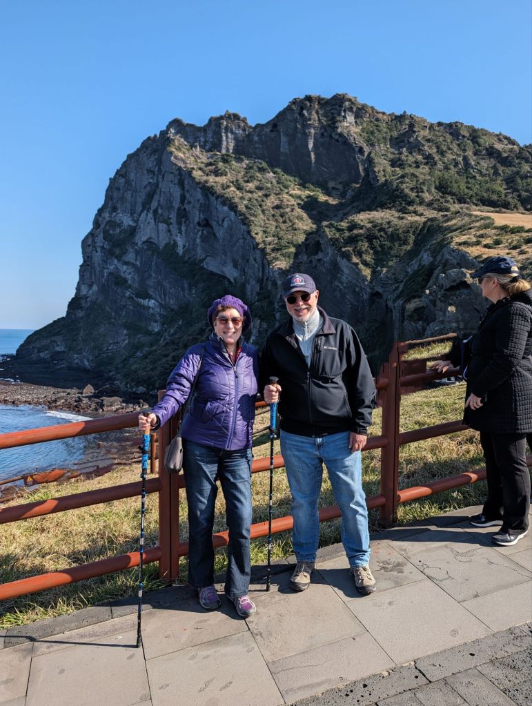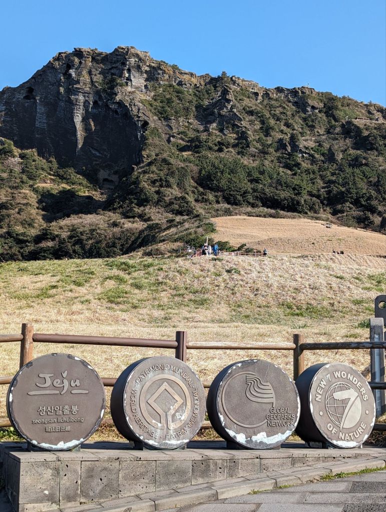 These stone medallions proudly advertise that Jeju’s Sunrise Peak was included in the list of the seven new nature wonders of the world.These Harubang statues, made with local volcanic stone, are an ancient feature of Jeju. Pairs of these “grandpa statues” guard the entrances of homes If you look closely at the center of this volcanic cove, you’ll see a tiny head. That is one of the famous women divers of Jeju. These amazingly strong women, the oldest of whom is 92, have been fishing by free diving (no scuba gear) for generations.We didn’t hike to the top of the mountain, but we enjoyed this nature trail.There are more than 600 hills like these in Jeju, all with volcano craters.Local people enjoy walking through these flower fields and taking pictures when they are in bloom. The plant is the same one that produces canola oil.