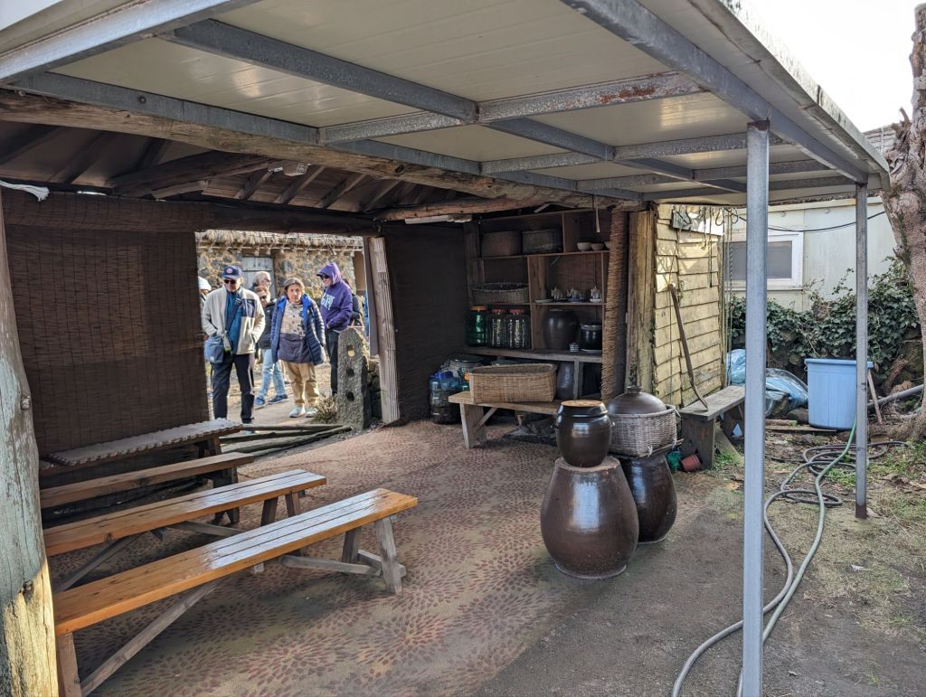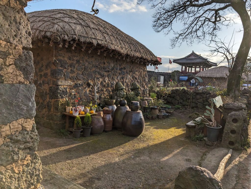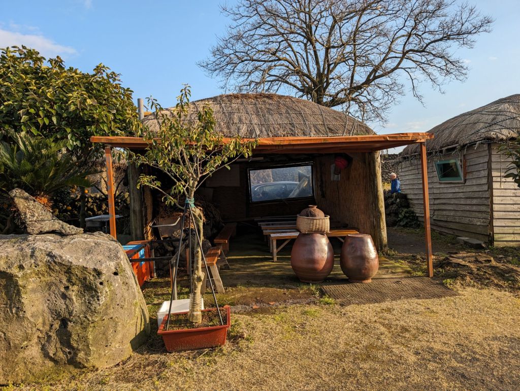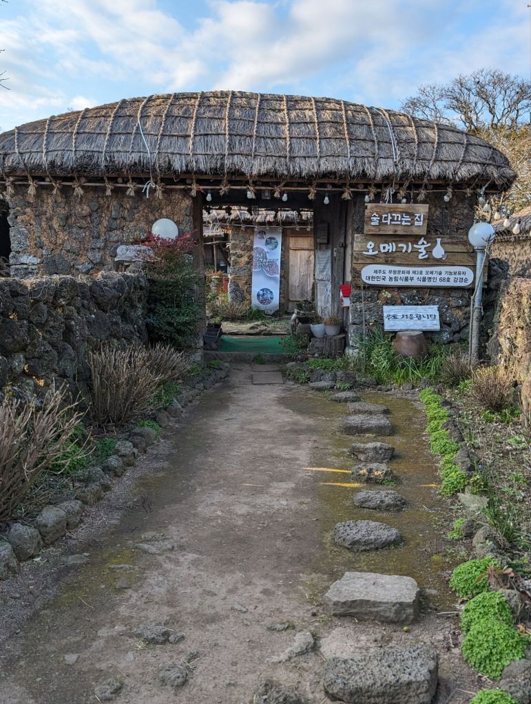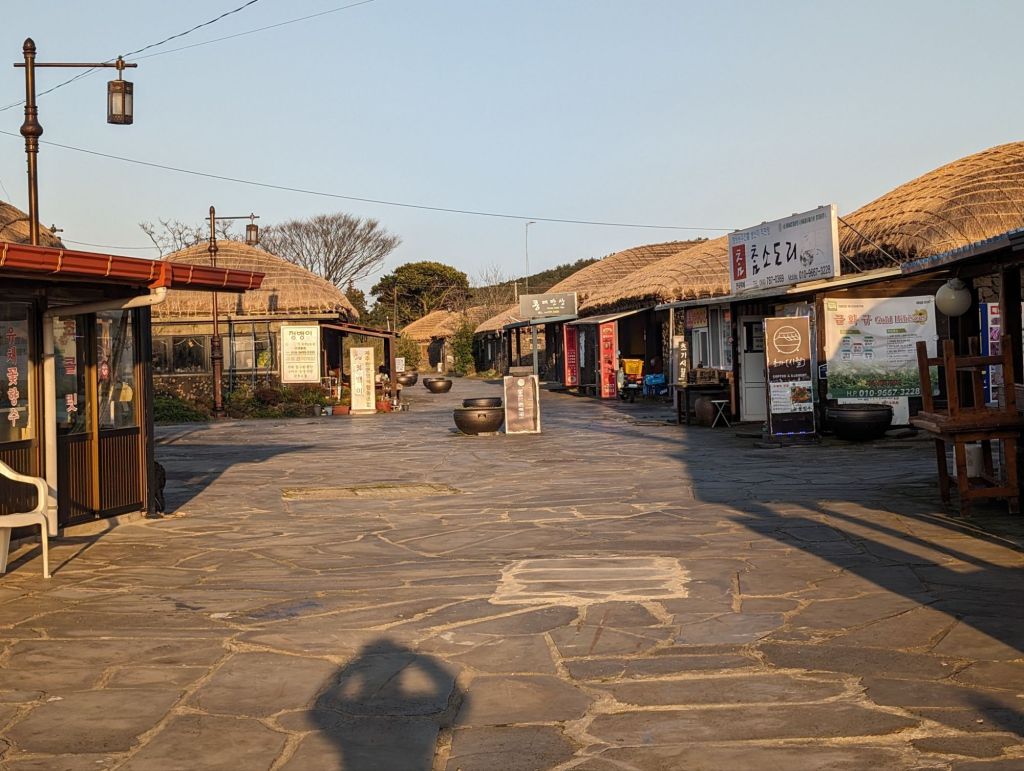 The hurabang here to guard the gate.The homes all have these mushroom-shaped thatched roofs.The local villagers keep this garden and eat and sell the produce. The cabbage is used to make their own kimchi.One part of the village has these shops which include restaurants selling local specialties, such as the black pig, which is only farmed here.The grinding stone is part of the original equipment that was used to produce grain and flour.