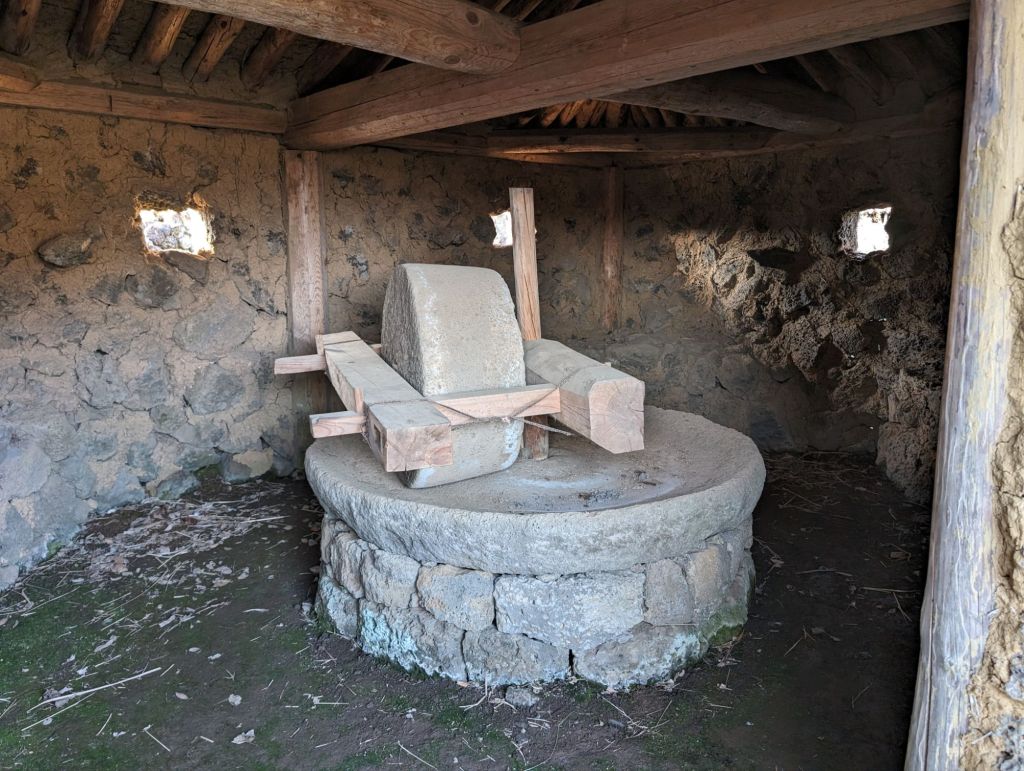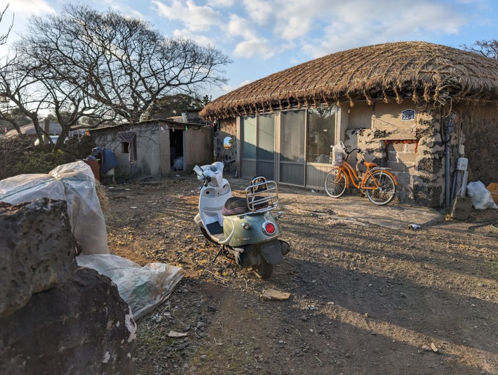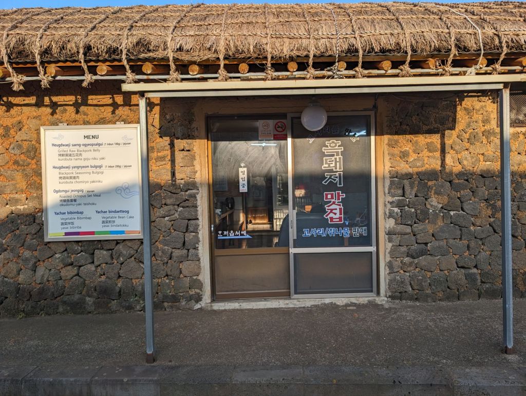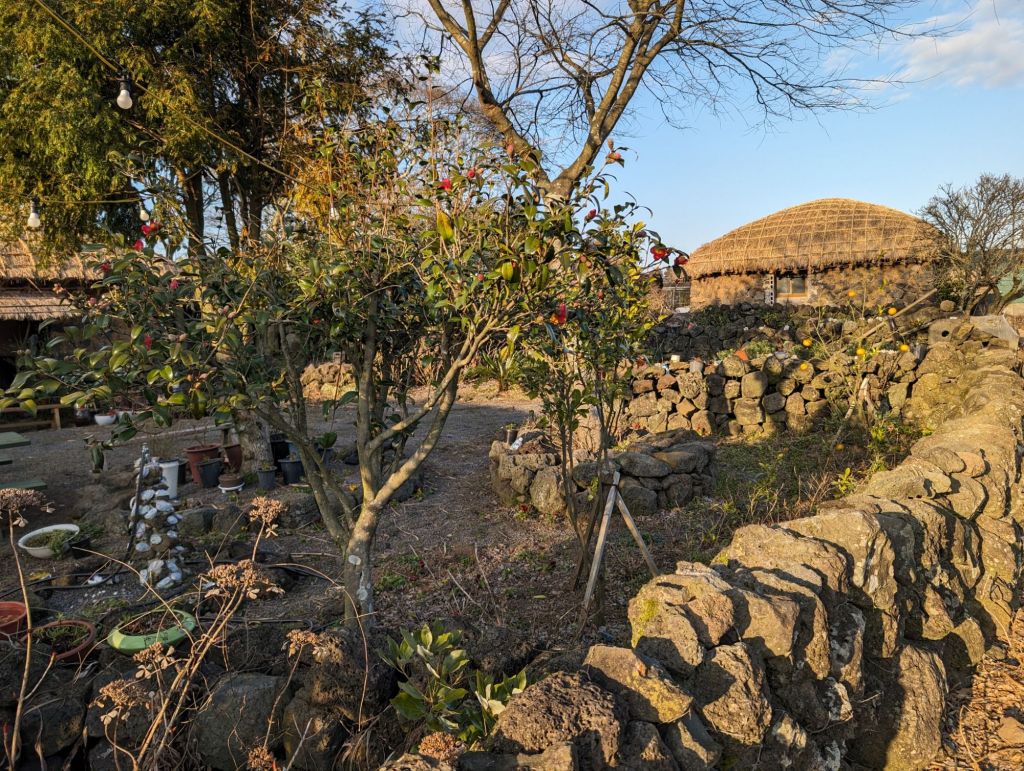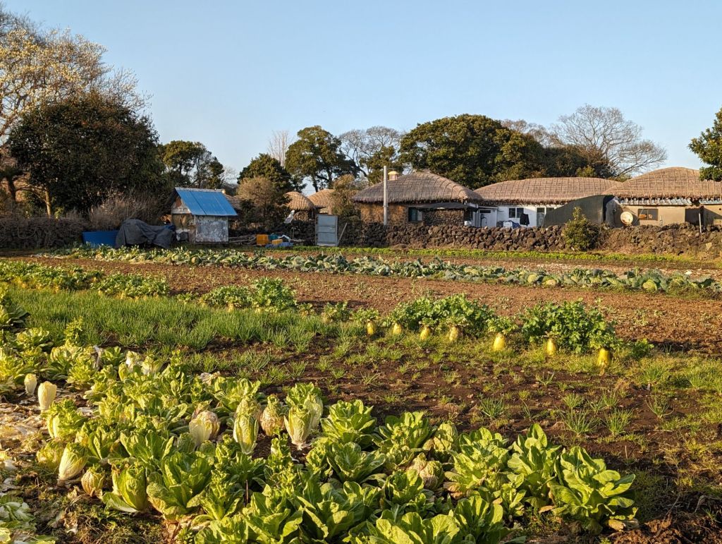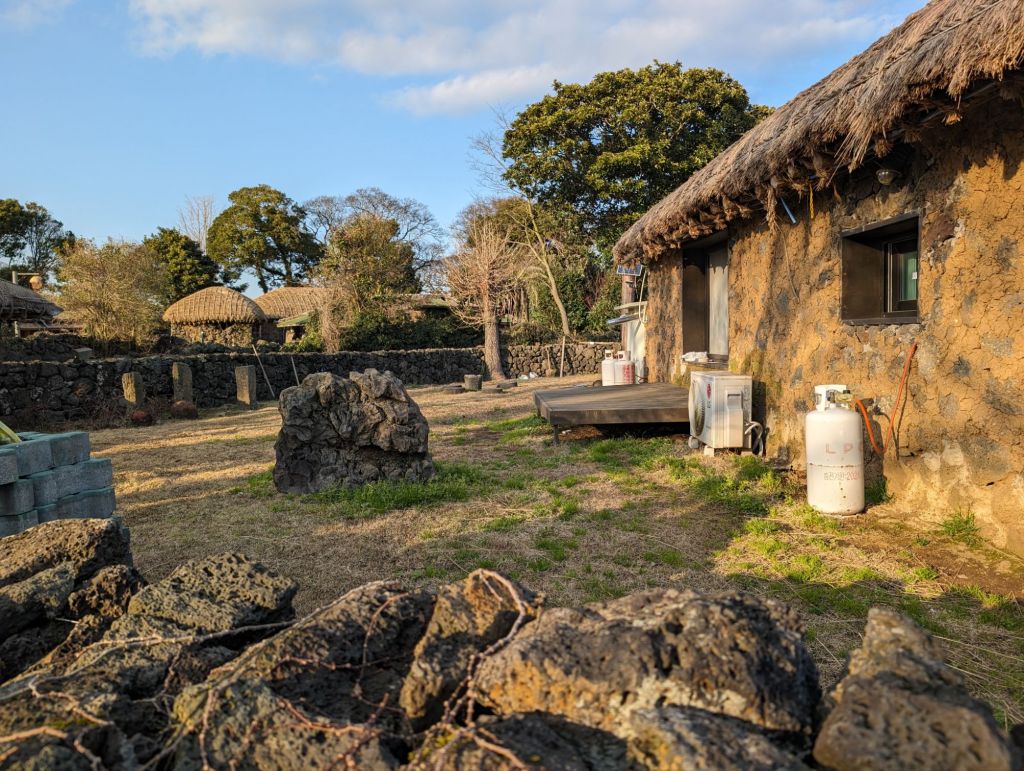 The hurabang here to guard the gate.The homes all have these mushroom-shaped thatched roofs.The local villagers keep this garden and eat and sell the produce. The cabbage is used to make their own kimchi.One part of the village has these shops which include restaurants selling local specialties, such as the black pig, which is only farmed here.The grinding stone is part of the original equipment that was used to produce grain and flour.