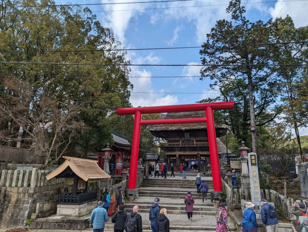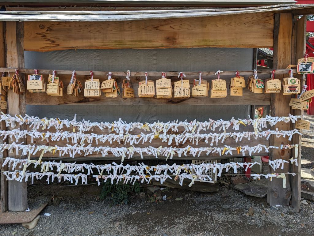 This is called the purity bridge, as it crosses the river over to the shrine where one can achieve purification.The red Torii, or gate marks the journey from the secular world to the sacred.These Shochu bowls, which are the special local alcohol drink, are gifts for the gods. Manufacturers donate the first bowl of each year’s new batch to the shrine. You find them in Shinto, but not Buddhist shrines. The majority of Japanese worship both religions, which are compatible with each other.Both the paper messages tied to these strings and the wooden plaques above are wishes worshipers ask the gods to fulfill.