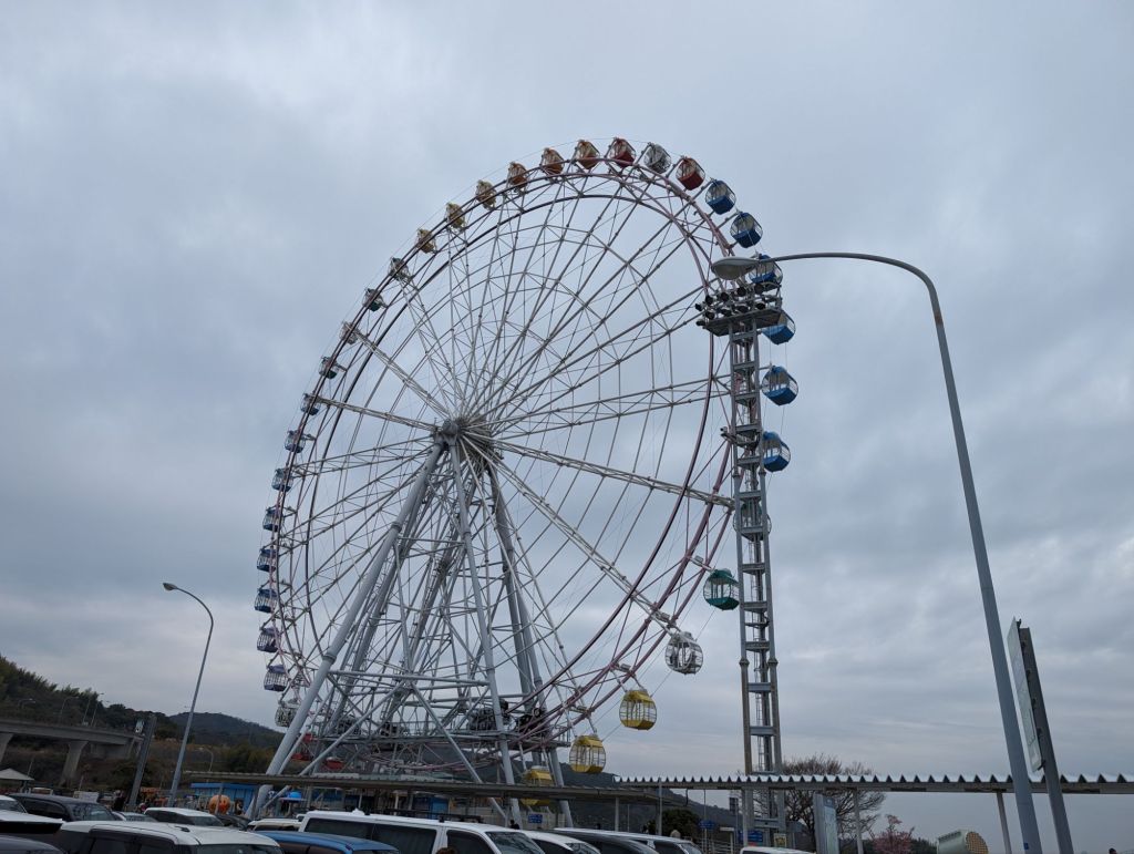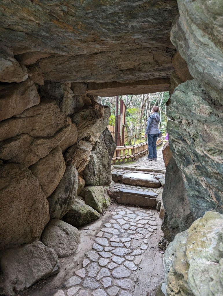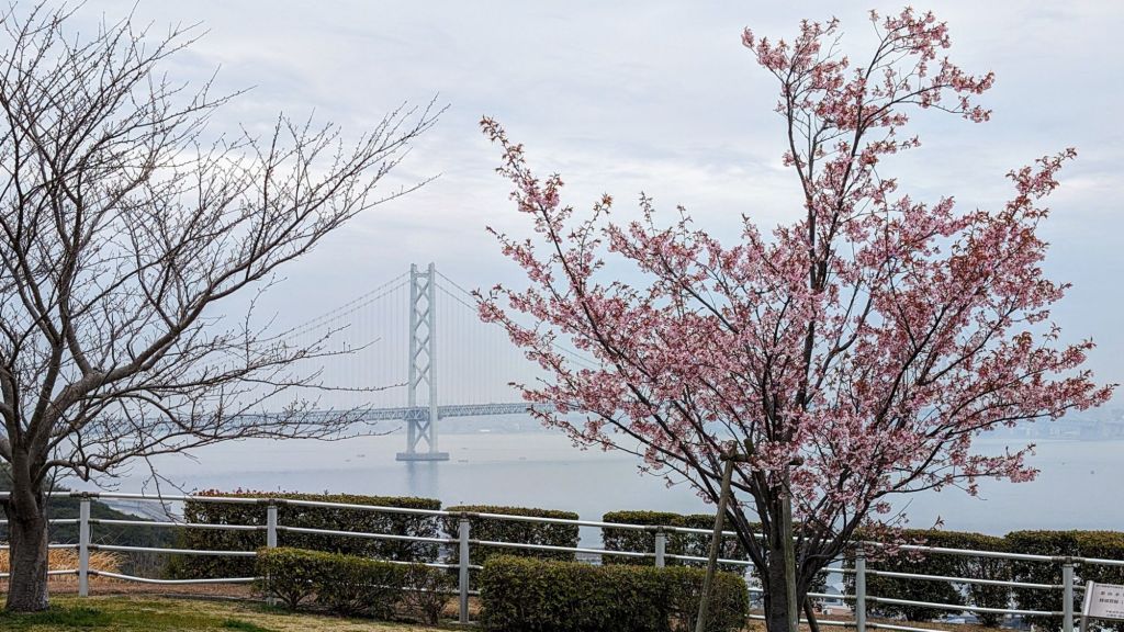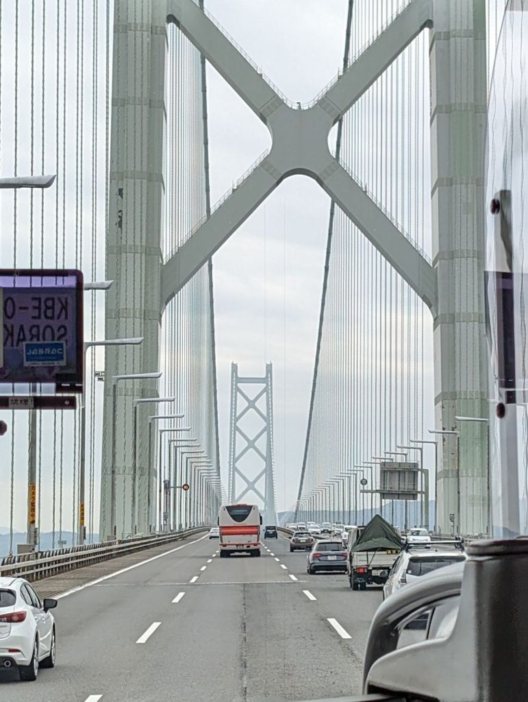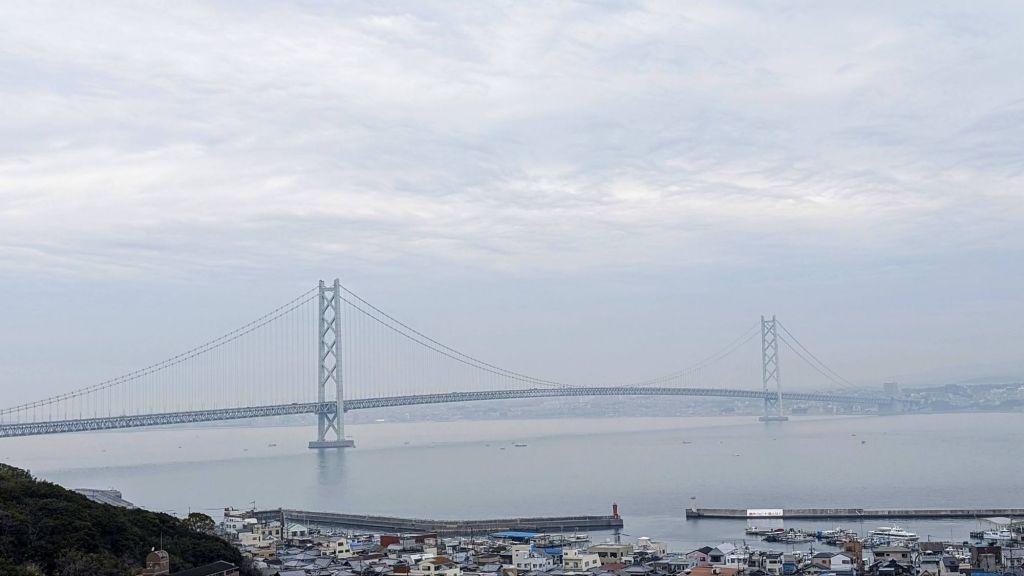 The AkashiKaikyo Bridge was, until 2 years ago, the longest suspension bridge in the world. The 4 km bridge links the city of Kobe with the island of Awaji. It was getting misty as we drove across, so the views from the bridge were shrouded in haze. We looked back on the bridge from a viewing platform on Awaji.