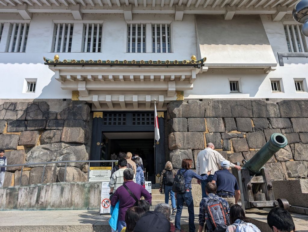 The eight-story main tower was last destroyed in World War II, but it was rebuilt to look exactly like the original 16th century Tower.The stone on the main gate, above and below, never burned with the rest of the rest of the castle. The huge stones go back to the 16th century and were put together without mortar.The castle has an inner and outer moat.The food sellers on the way in were tempting.This cannon was manufactured in the 19th century when the castle area was a munitions making factory. That was why the Osaka Castle was a target for bombing in World War II.