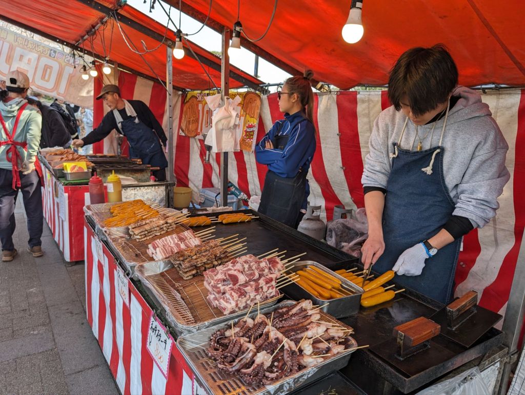 There was one lone cherry tree in full bloom and everyone had to get a picture of it.The bridge viewing area had a festive feel to it. There were food sellers and this Ferris wheel.
