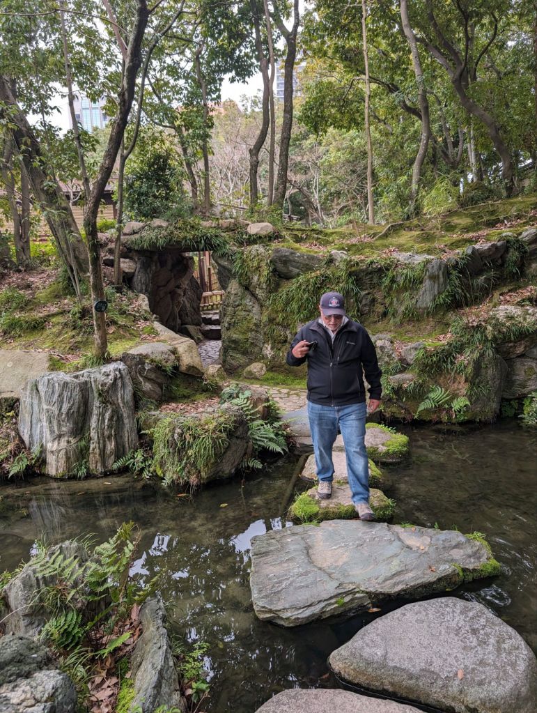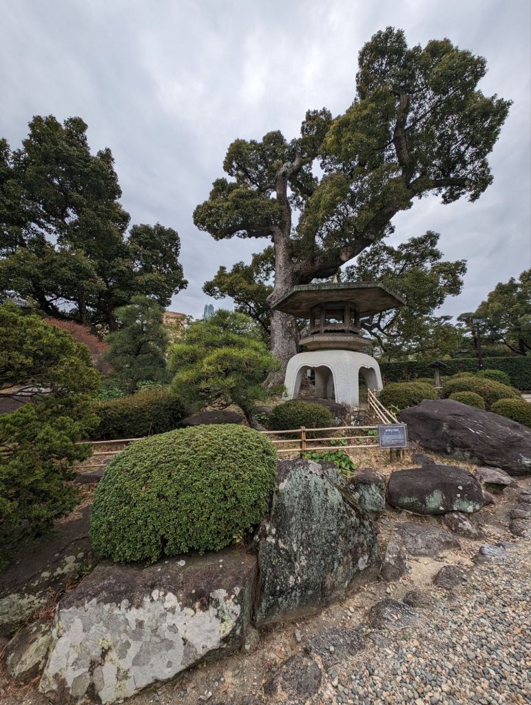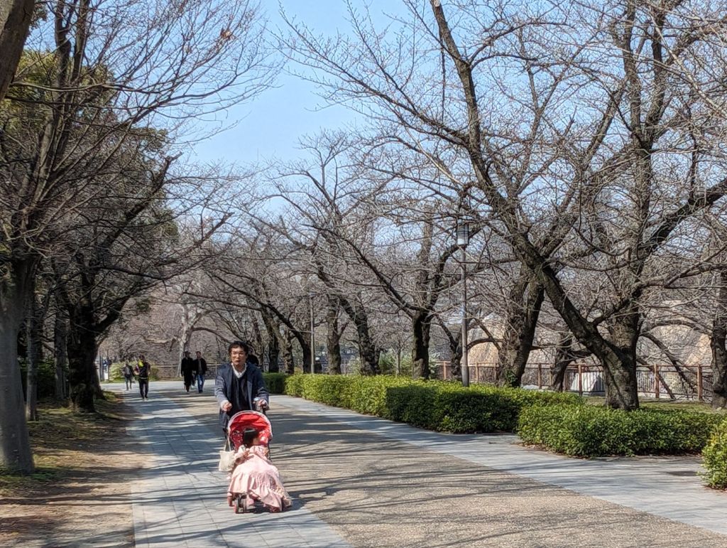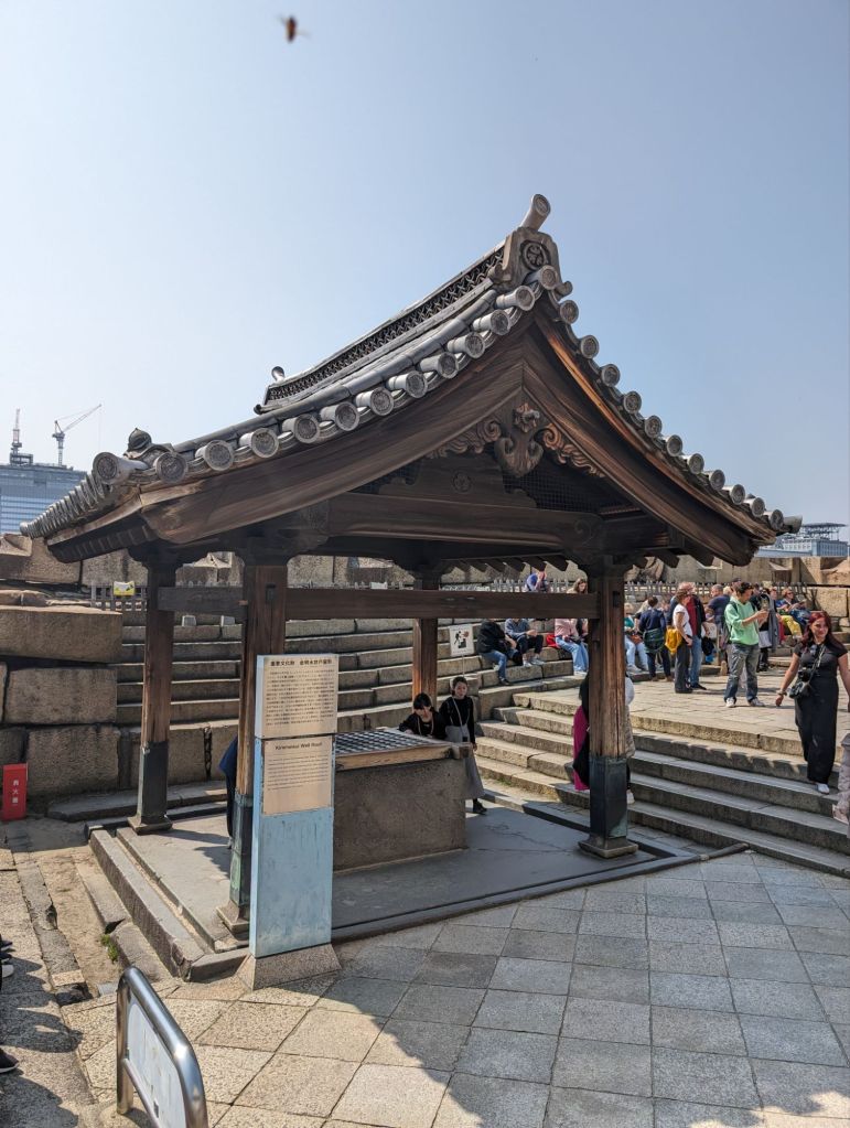 Excursion boats float on the moat.The dome-shaped building above is an arena. Concerts and sports events are held there.This is the castle’s original well. The roof is one of the few structures that actually came from that period.This lovely walk lined with cherry trees will bloom in about a week after we leave. Then it will be filled with people having hanami, or flower viewing parties. They will bring food and drinks and socialize under the trees.