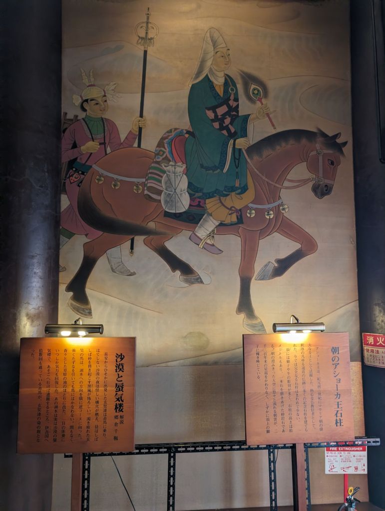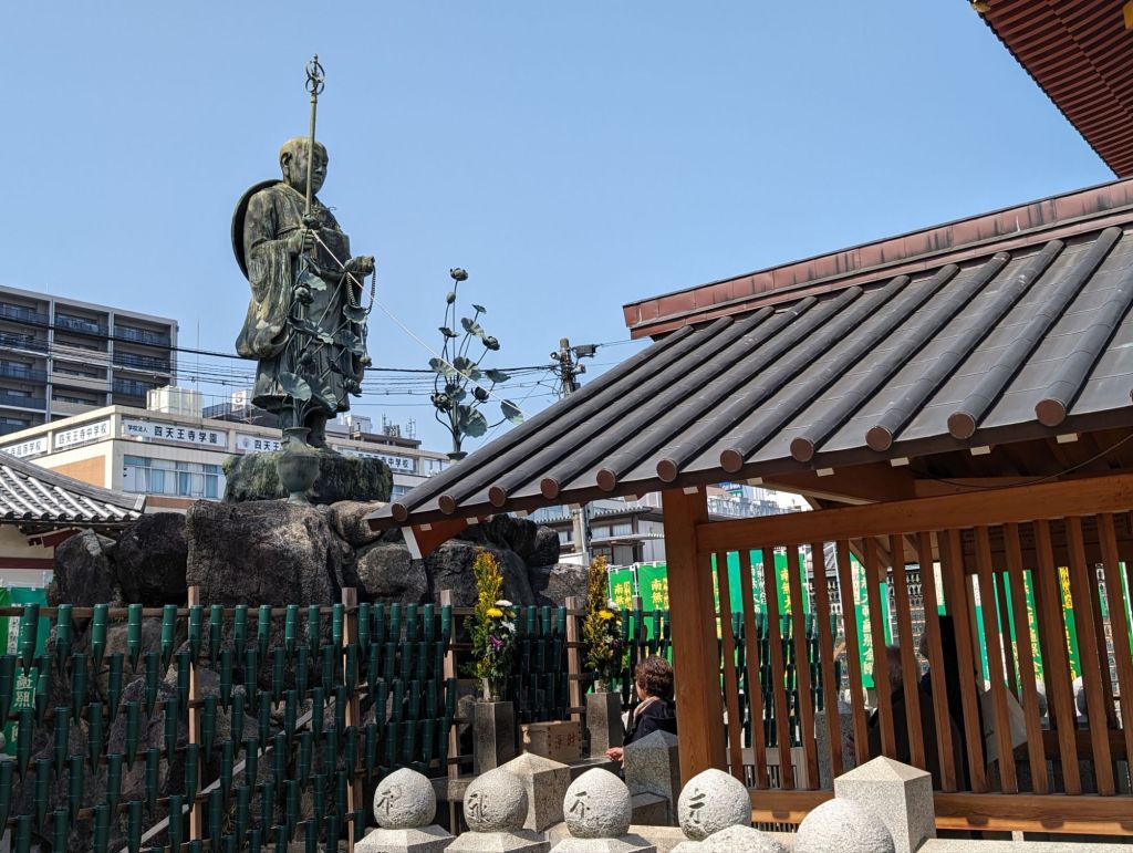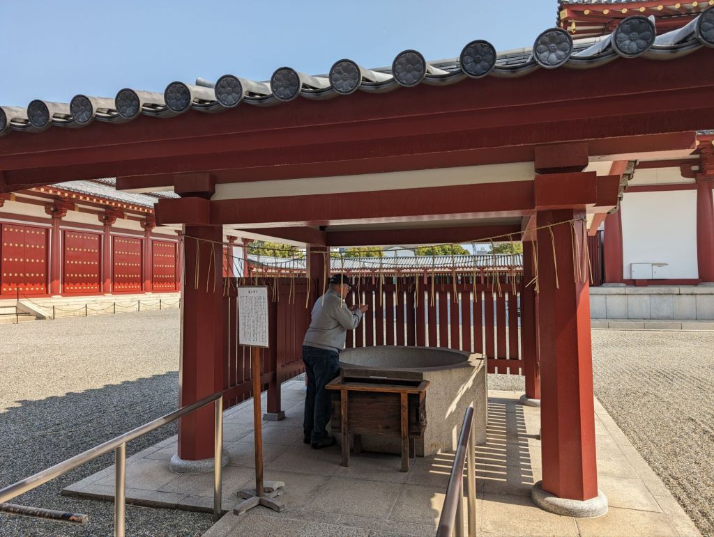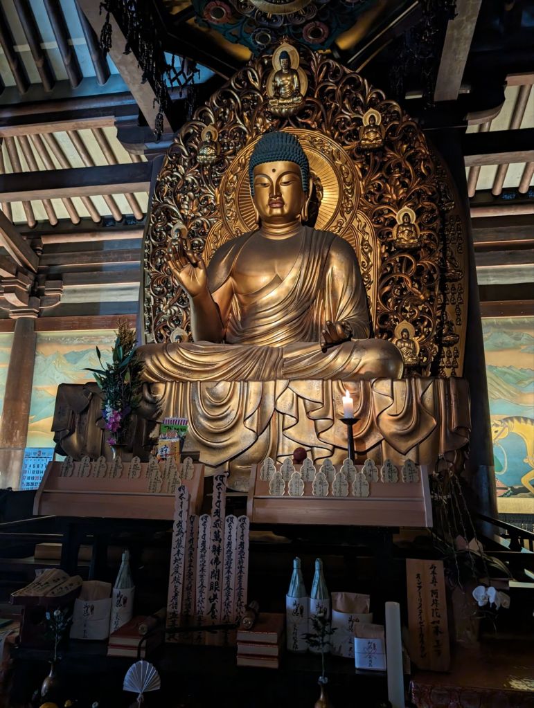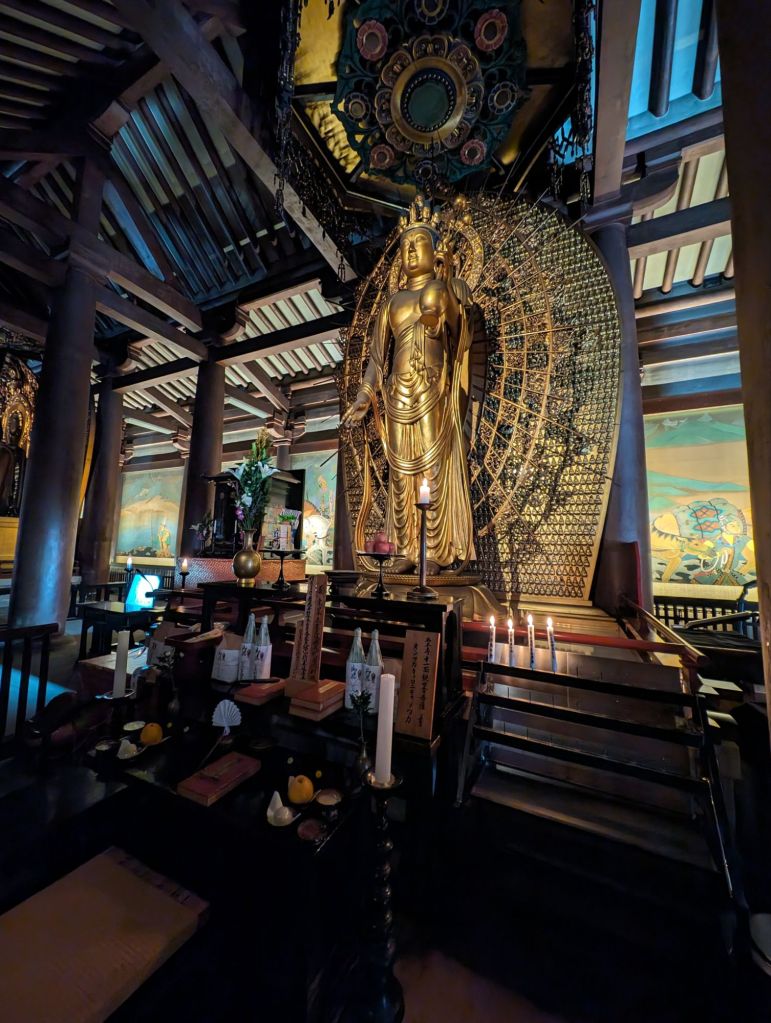 These lanterns hanging from the rafters of this corridor are inscribed with the names of temple contributors. Prince Shotoku, who founded the temple in 593, is enshrined in the main hall, of the temple.In the main hall is also this beautiful gold Buddha statue.The back wall of the main hall has these hundreds of little Buddha statues.The paintings, above and below, tell the story of the Buddha’s life.On the outside of the main courtyard are several shrines.A worshiper prays at this shrine, which promises help with illness, success and other life endeavors.This is the prayer wheel of the temple, which is used as a way to meditate and pray and gain wisdom and compassion.