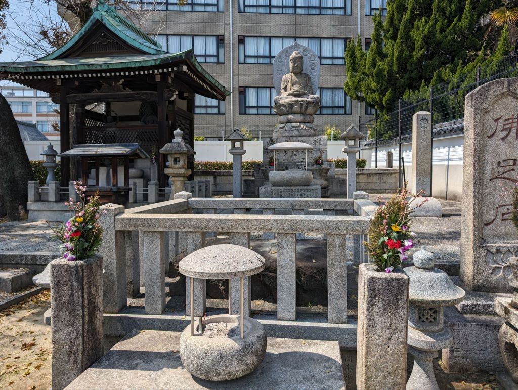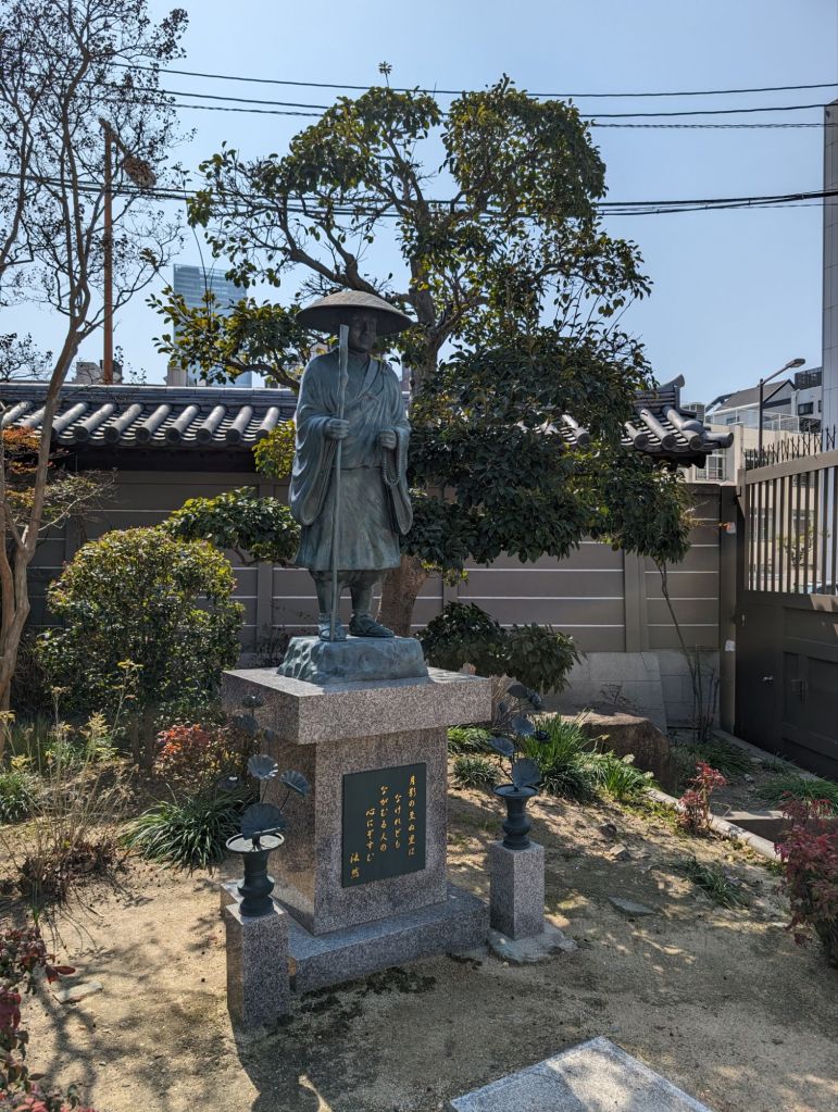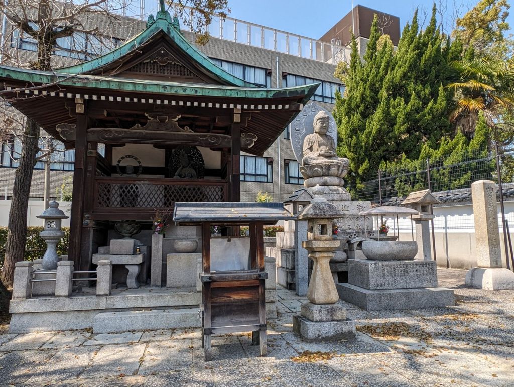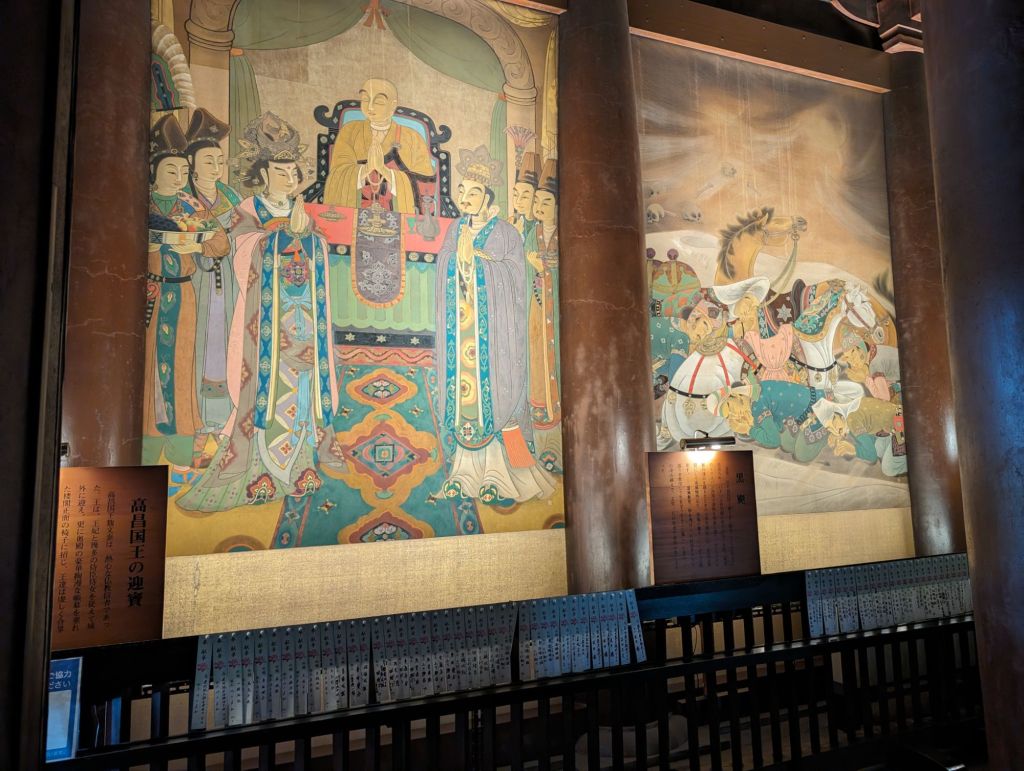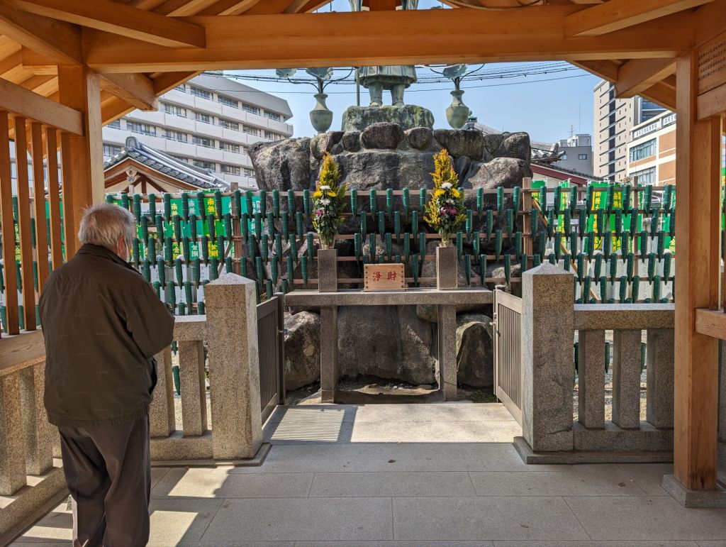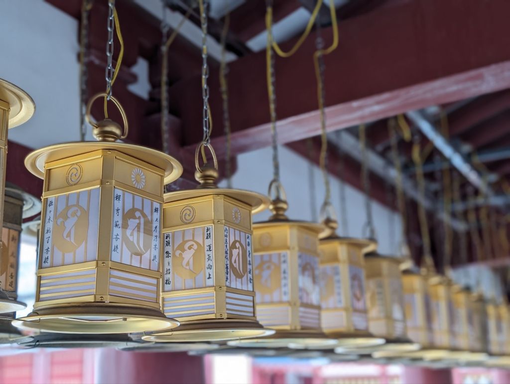 These lanterns hanging from the rafters of this corridor are inscribed with the names of temple contributors. Prince Shotoku, who founded the temple in 593, is enshrined in the main hall, of the temple.In the main hall is also this beautiful gold Buddha statue.The back wall of the main hall has these hundreds of little Buddha statues.The paintings, above and below, tell the story of the Buddha’s life.On the outside of the main courtyard are several shrines.A worshiper prays at this shrine, which promises help with illness, success and other life endeavors.This is the prayer wheel of the temple, which is used as a way to meditate and pray and gain wisdom and compassion.