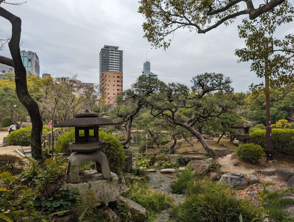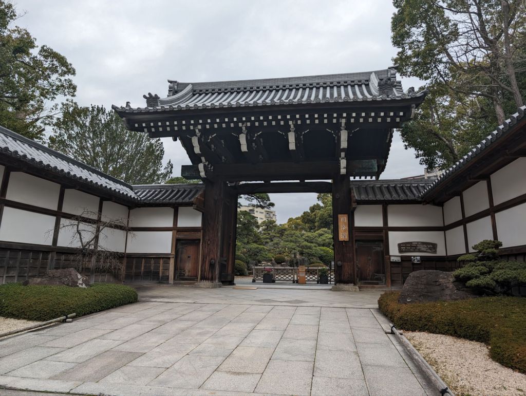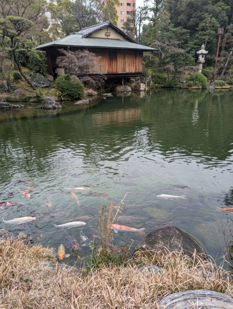 This traditional gate opens the way to the garden.Although the urban environment still surrounds you, the garden has a very calming effect.Like most formal Japanese gardens, there is a koi pond. A teahouse sits on the edge of the pond.