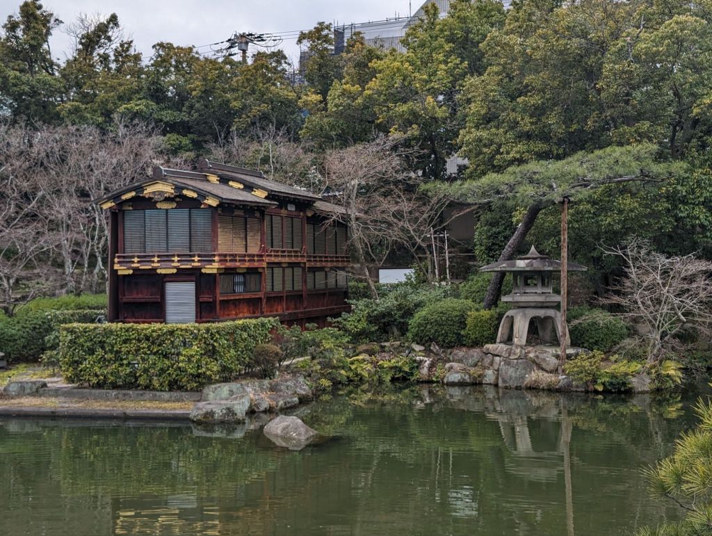 The two pictures below show the Funeyakata building, which was previously a houseboat used by a clan lord during the Edo period. Its Japanese lacquered exterior with gold trim gives the garden an elegant look..