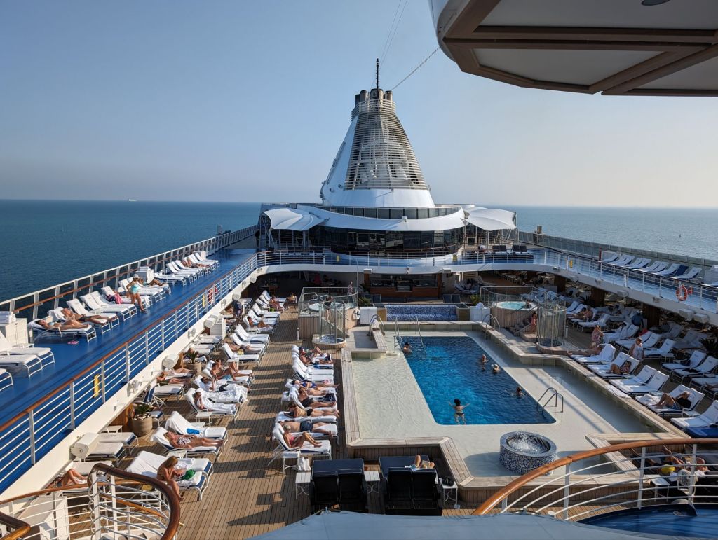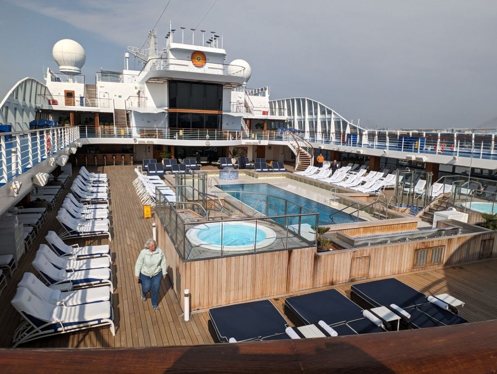 At the beginning of our voyage when the weather was hot and humid, the pool deck was often full. You can see the difference, below, after we got to Korea and Japan and the temperature swiftly dropped.