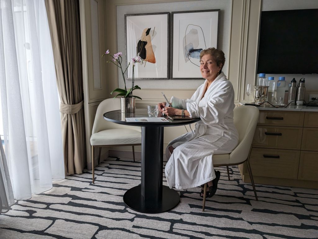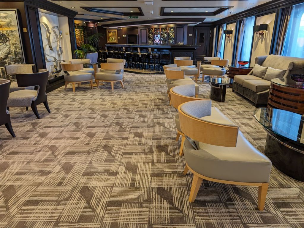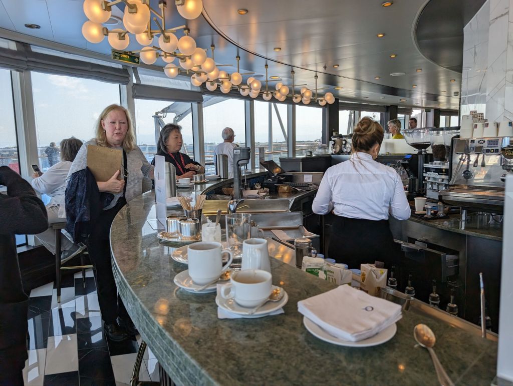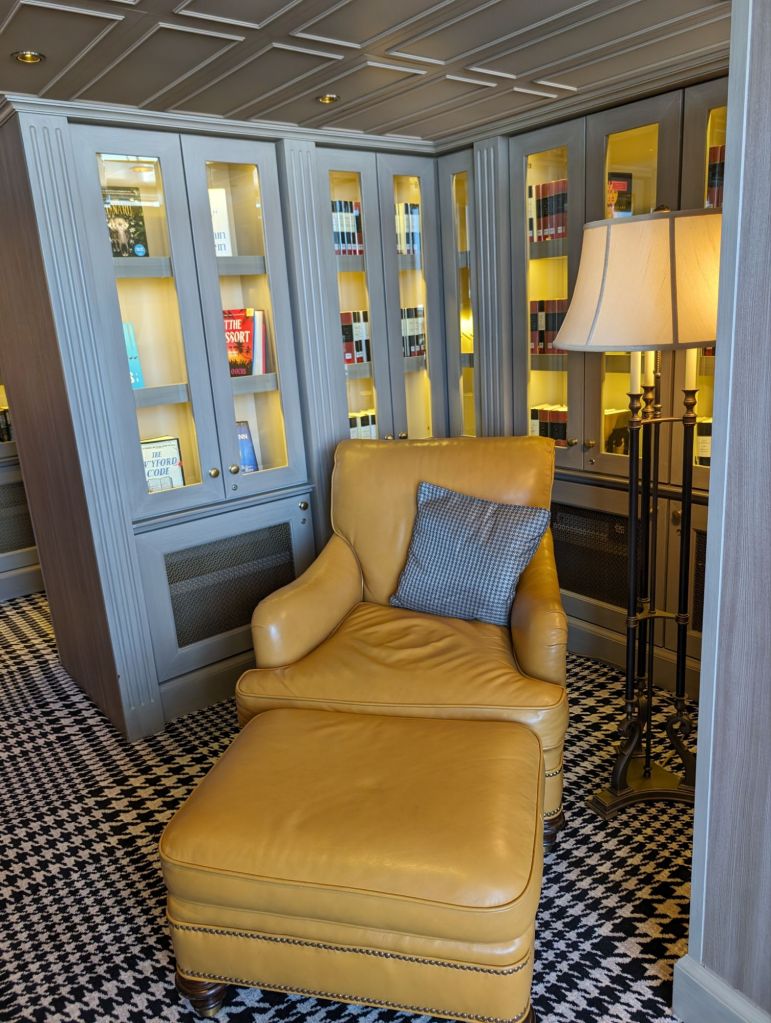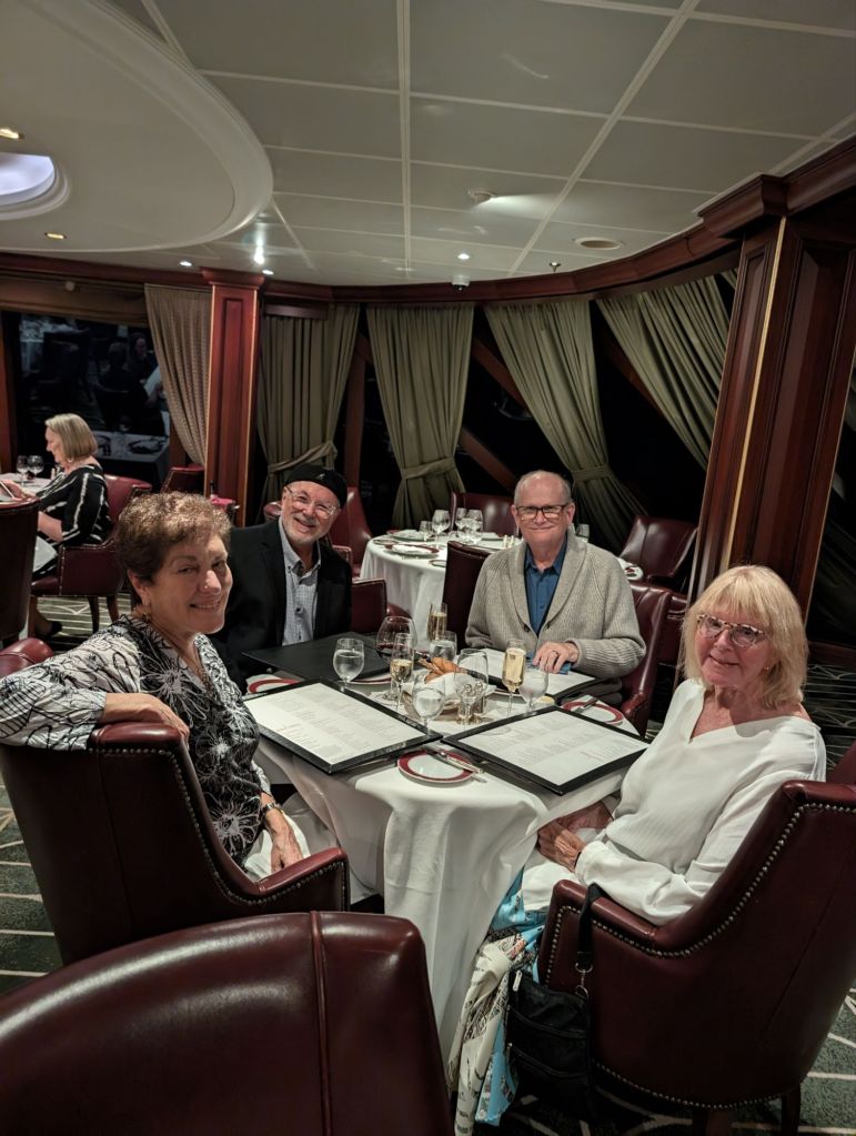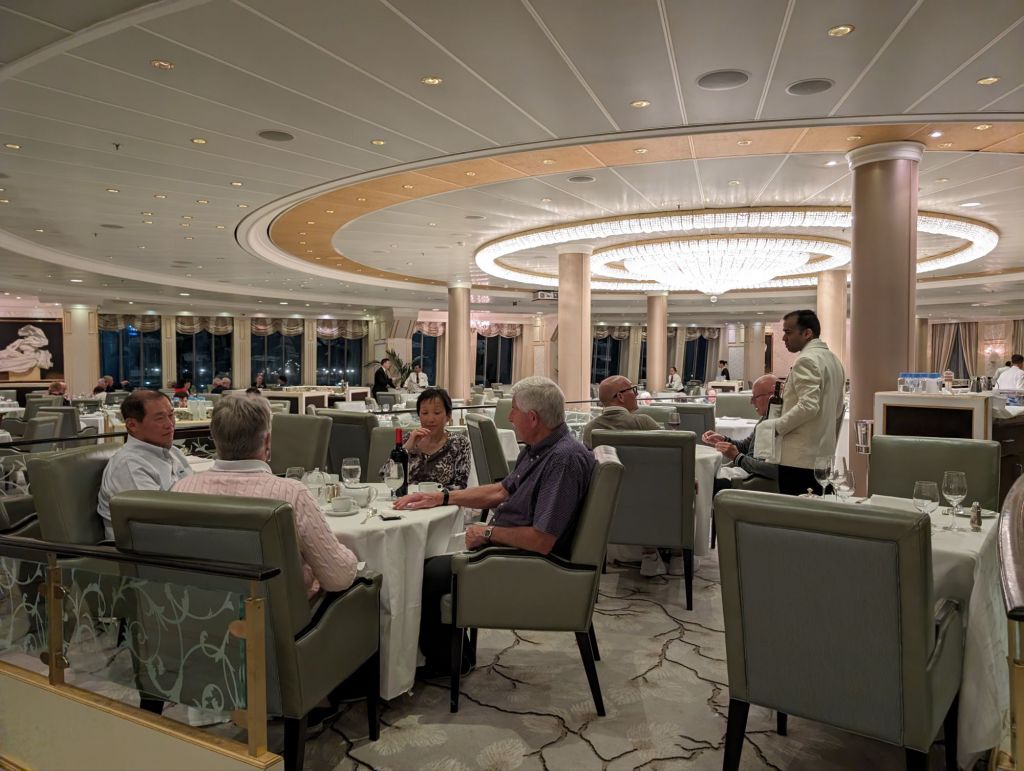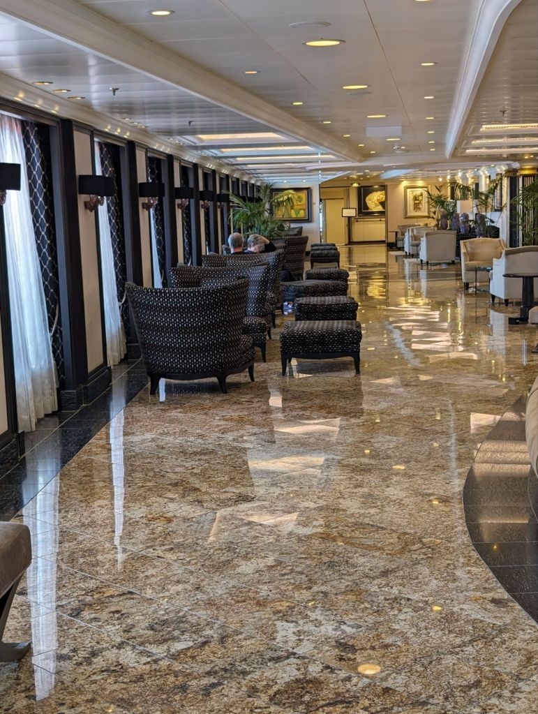 We’ve never found it hard to enjoy living on a cruise ship. Having this lengthy a cruise gave us more time to make friends among both passengers and crew. Everyone has an interesting story to tell. We’ve loved the comforts cruise ship offers– fine dining, nightly entertainment, a stateroom that’s always kept beautifully for us. There are plenty of onboard activities, most of which we did not participate in, because we treasured our time on sea days or when we were back on board early. There are wonderful places on the ship to chill out and relax and we did plenty of that, as well as using our time to exercise or meet with friends. I’m ending this blog, or at least this portion of it, with some pictures of life aboard the Riviera.