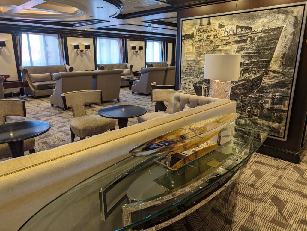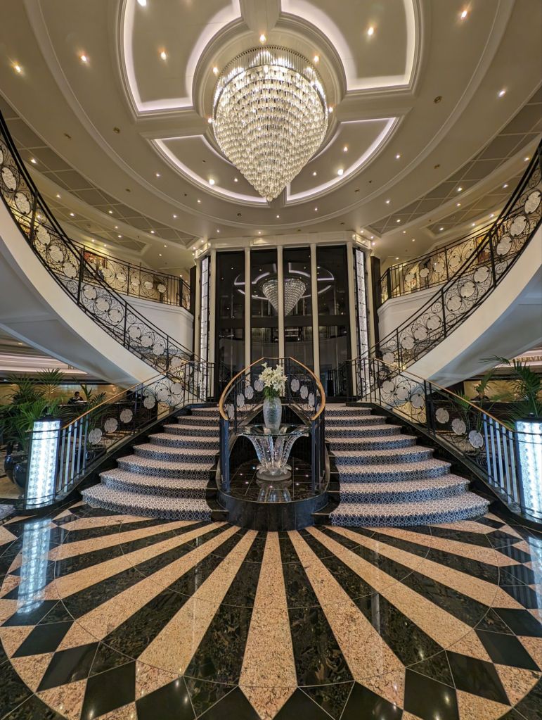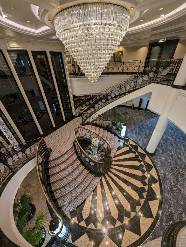The ship’s atrium with its crystal chandelier and sculpture and marble floor has dramatic views from both above and below.