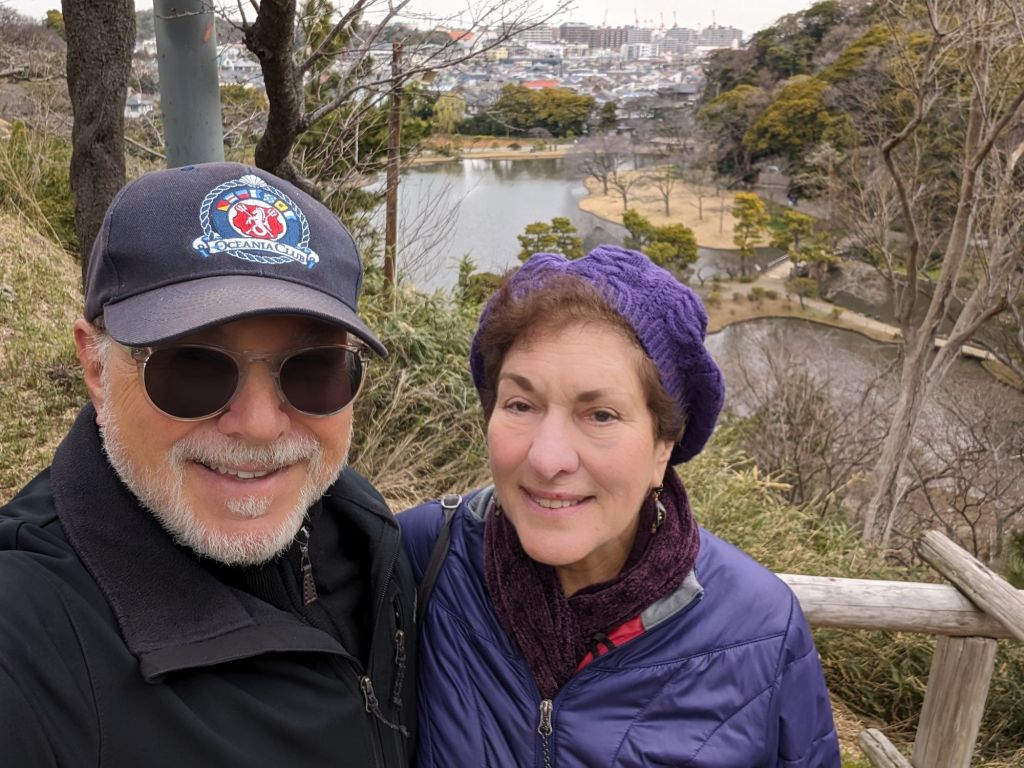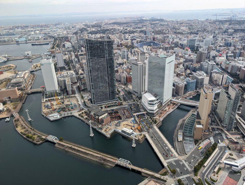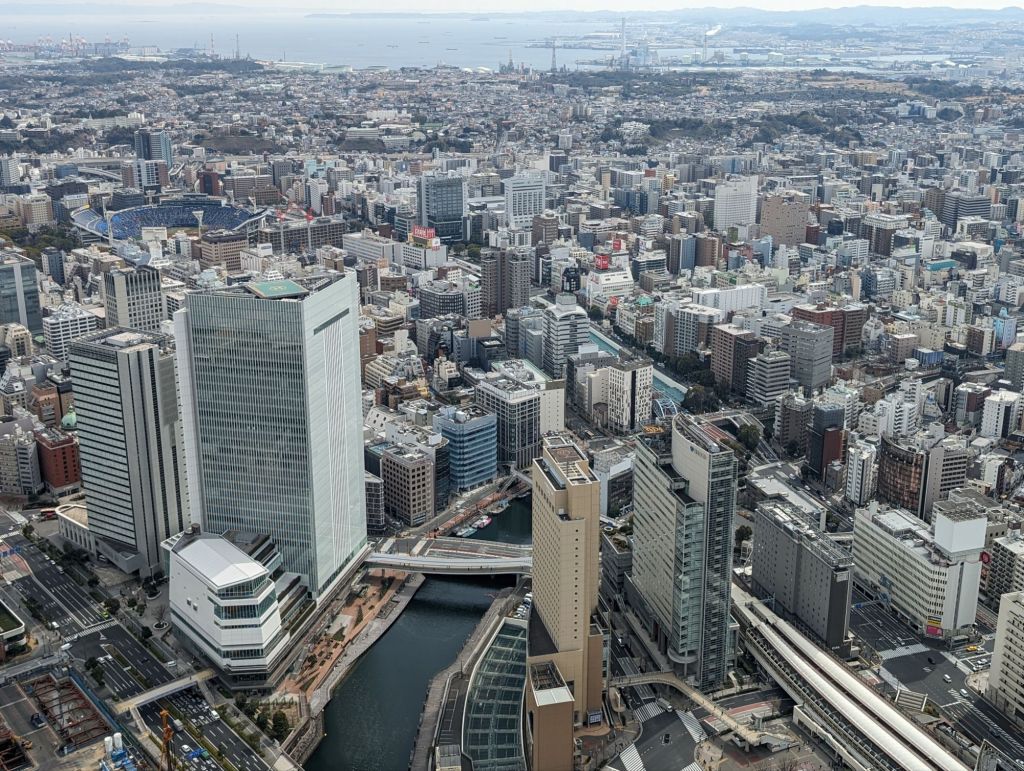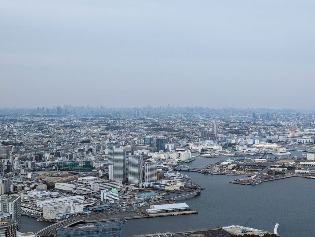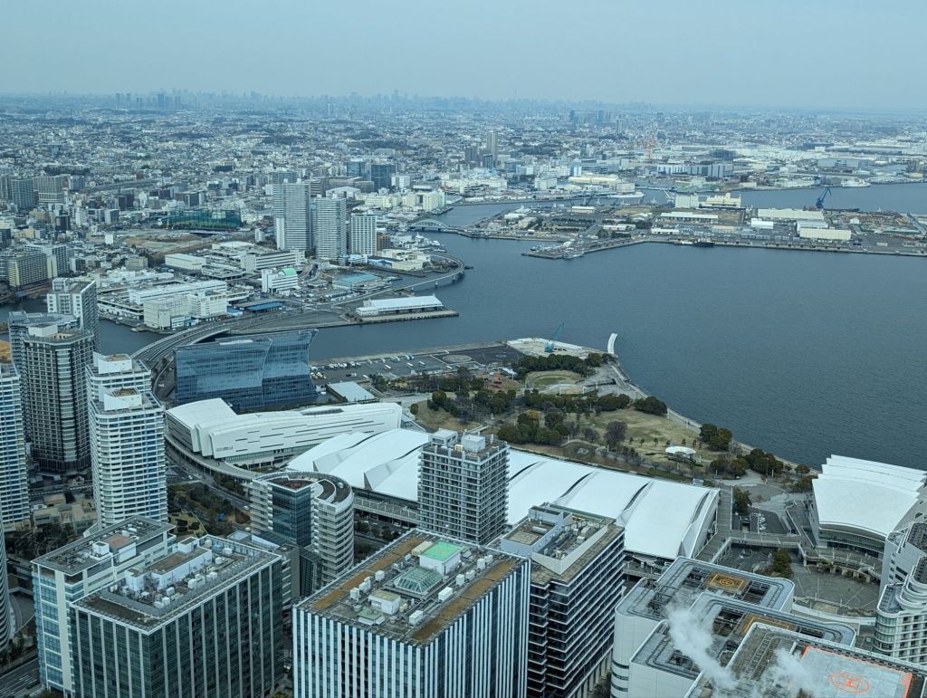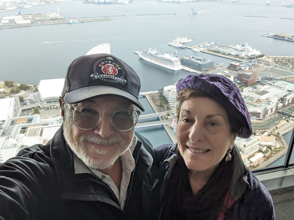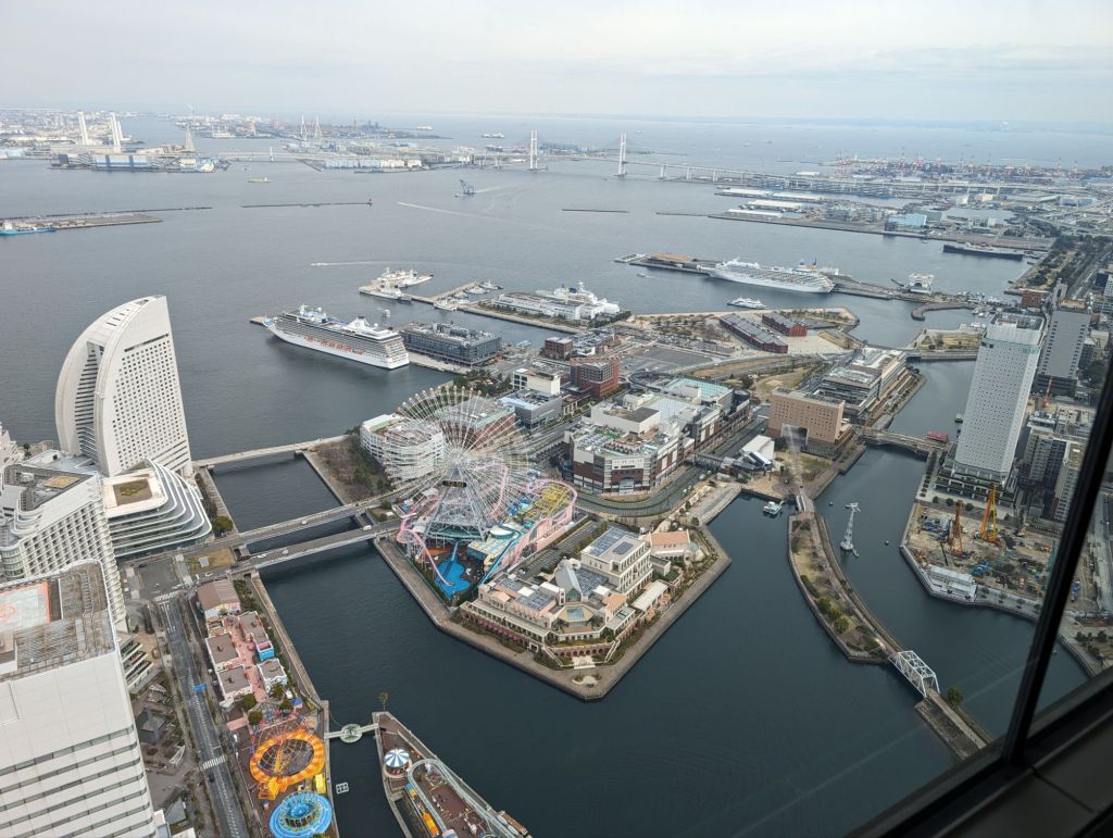 The Yokohama Landmark Tower is the third tallest building in Japan and a hub of activity for Yokohama. It’s surrounded by a tony mall, a hotel, an entertainment area, and of course there is an observation deck on its 69th floor. We went up to what is called the Sky Garden and enjoyed the view.