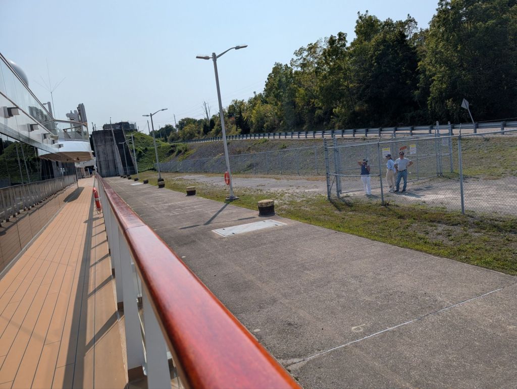 Our ship was built to fit through the narrow locks of the canal, but with only one foot to spare on each side. It was a tight squeeze! We were so close to land in some places, we could chat with the locals as we waited for our ship to take its turn in the locks. The people below were curious about our itinerary.Waiting on the bow and looking up at the giant concrete gate protecting us from a mountain of water was an imposing experience. Below the brief video shows the water rush in to allow our boat to rise to the next level.