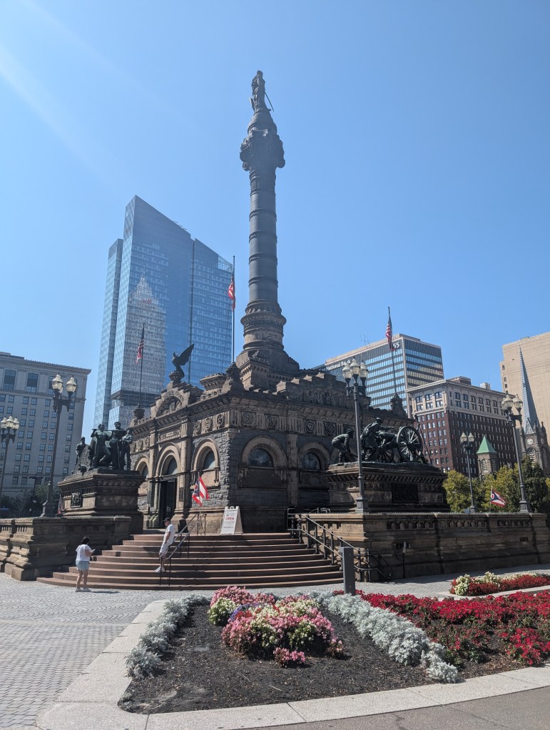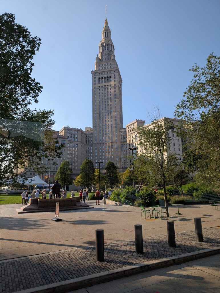 Cleveland’s Public Square is a 5-acre plaza in the heart of the downtown. Below the view looks across the square to the hundred year old Terminal Tower, the city’s signature skyscaper.