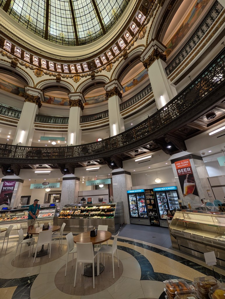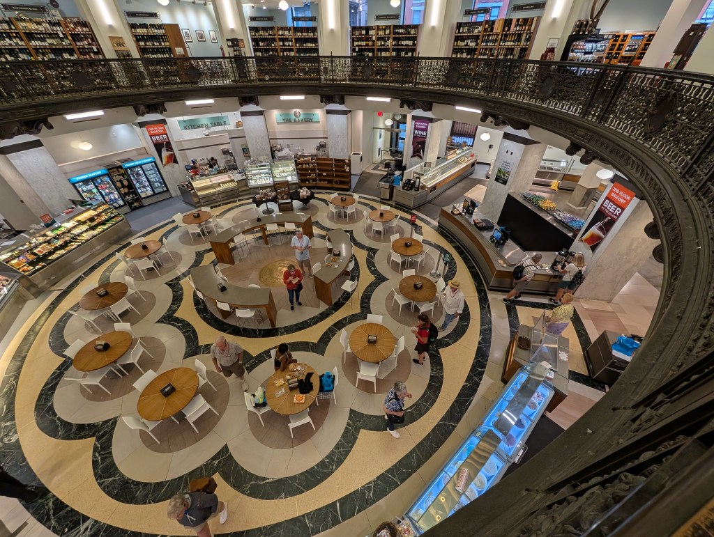 The century old Heinen’s grocery chain, still run by the family, took over this palace-like abandoned bank building and, partnering with the city, restored it and made it a beautiful downtown grocery and destination.