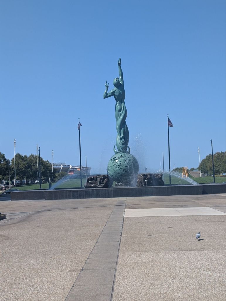 The Cleveland Fountain of Eternal Life was built as a peace statue, representing man rising from the flames and reaching up toward peace. It sits at the top of the Cleveland Mall, a huge landscaped public park reaching down to the lake.