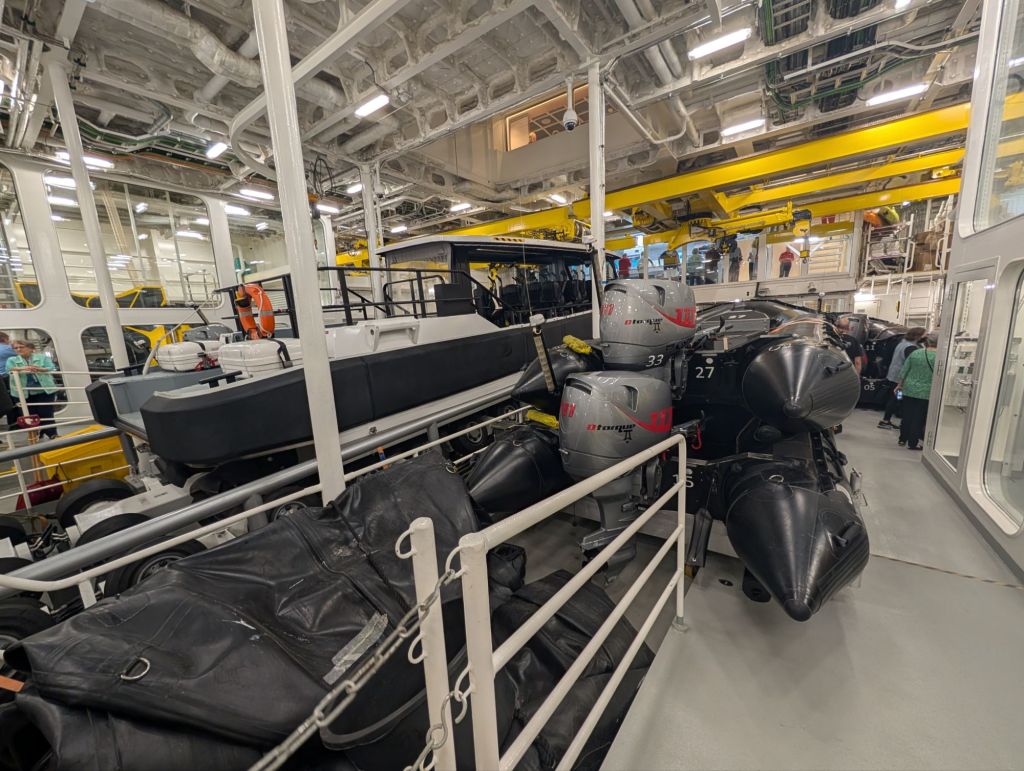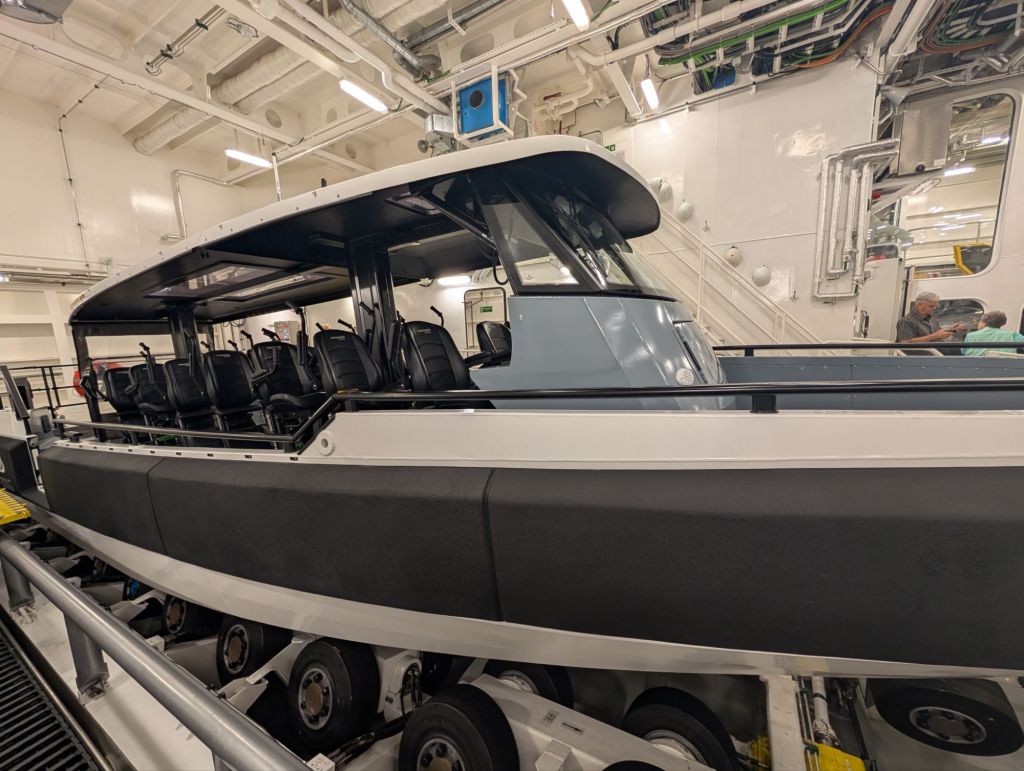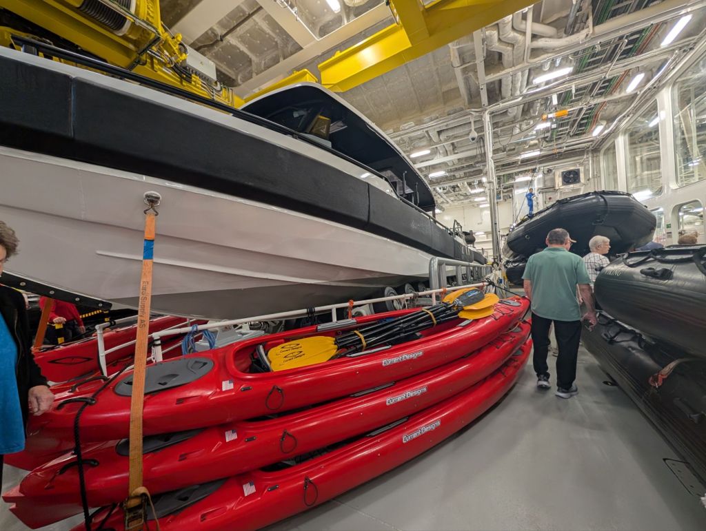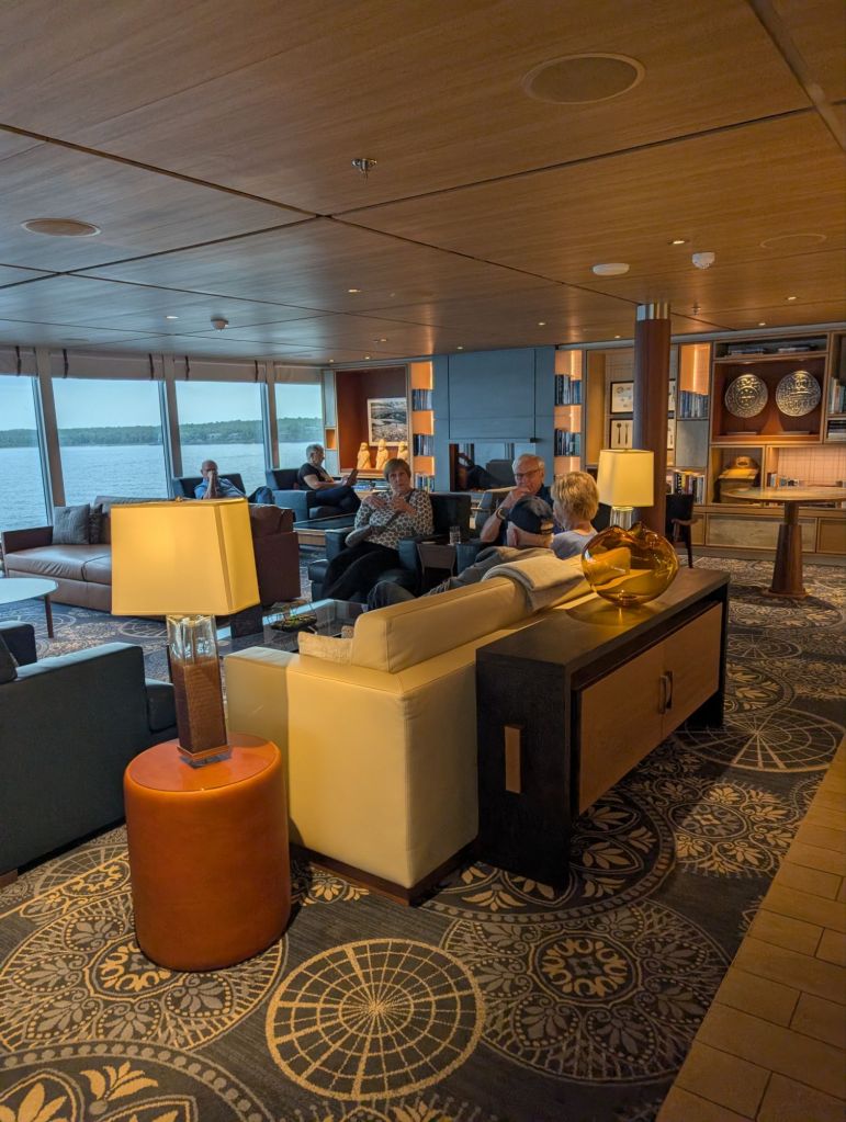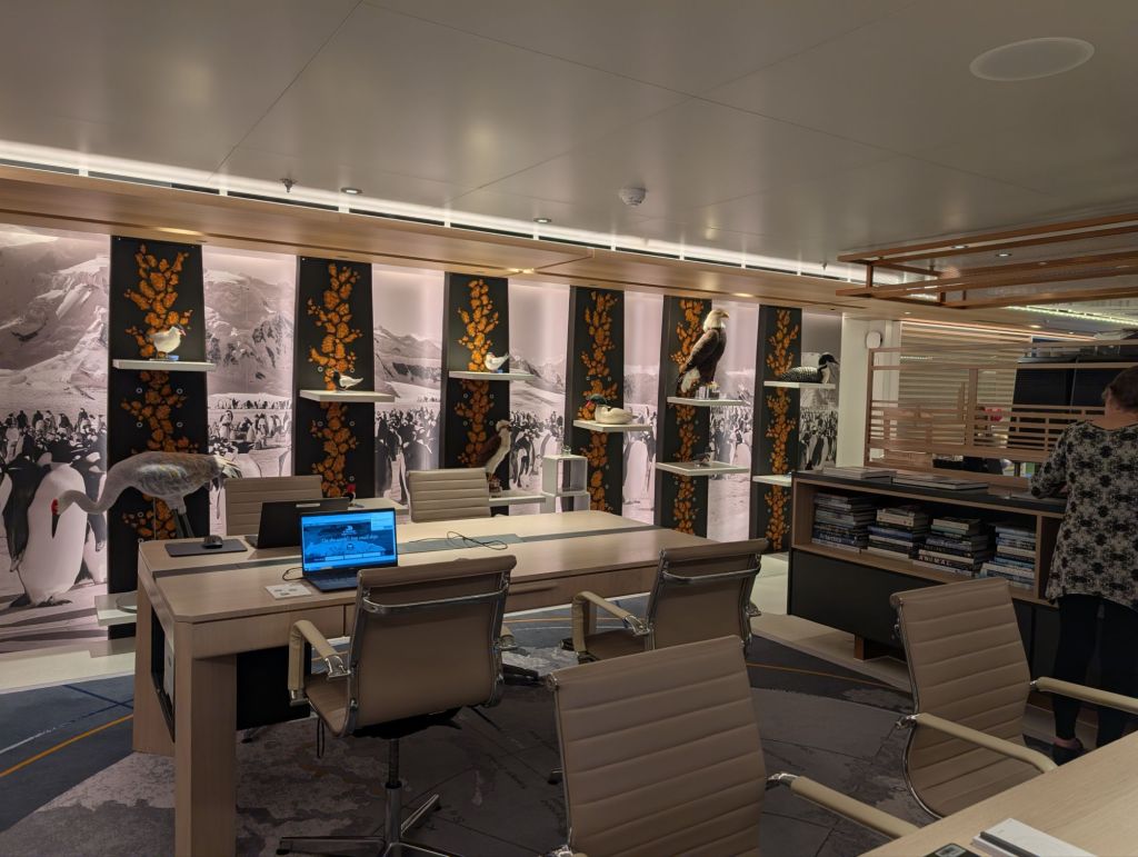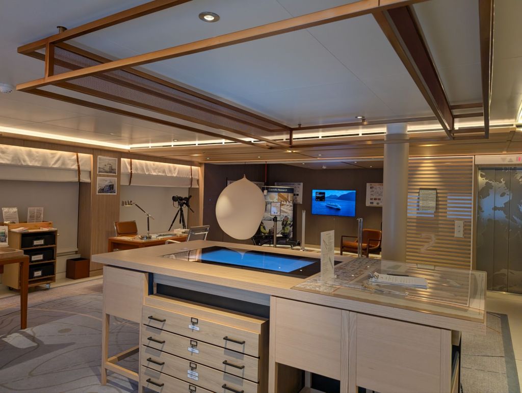 Below are pictures of the expedition center, where the expedition team, with degrees in astronomy, geology, botany and more, share information and lectures with passengers. The science team also has their own lab section where they collect data as the ship cruises. The chief science officer, Jason, explained that they are unlike most research vessels, which are always scrambling to get funding for even one voyage. Viking ships give the science team the unique ability to replicate their studies again and again as they pass over the same areas, making the data much more useful. They have equipment to analyze the water, soil, air and more in dozens of ways. And they collaborate with major universities and organizations around the world to share their data. Jason said, “Most groups conducting scientific research hoard their data because they had to go to so much trouble to fund it. But ours is paid for by the public (Viking passengers), so we share it with the public.” You’re welcome!