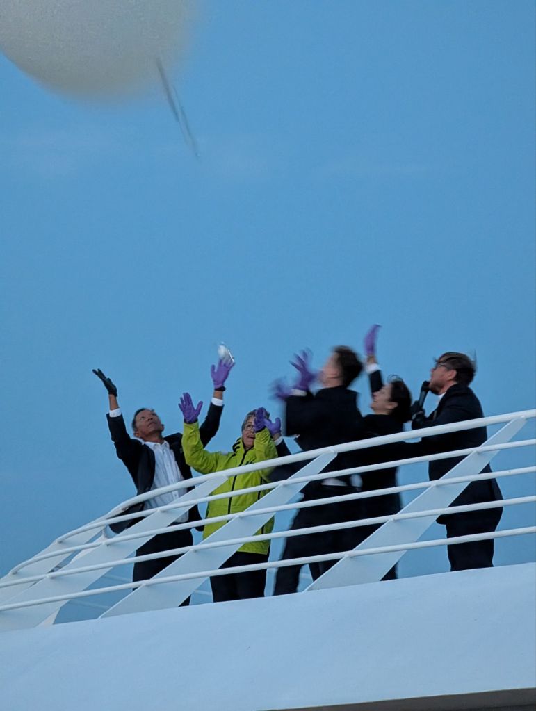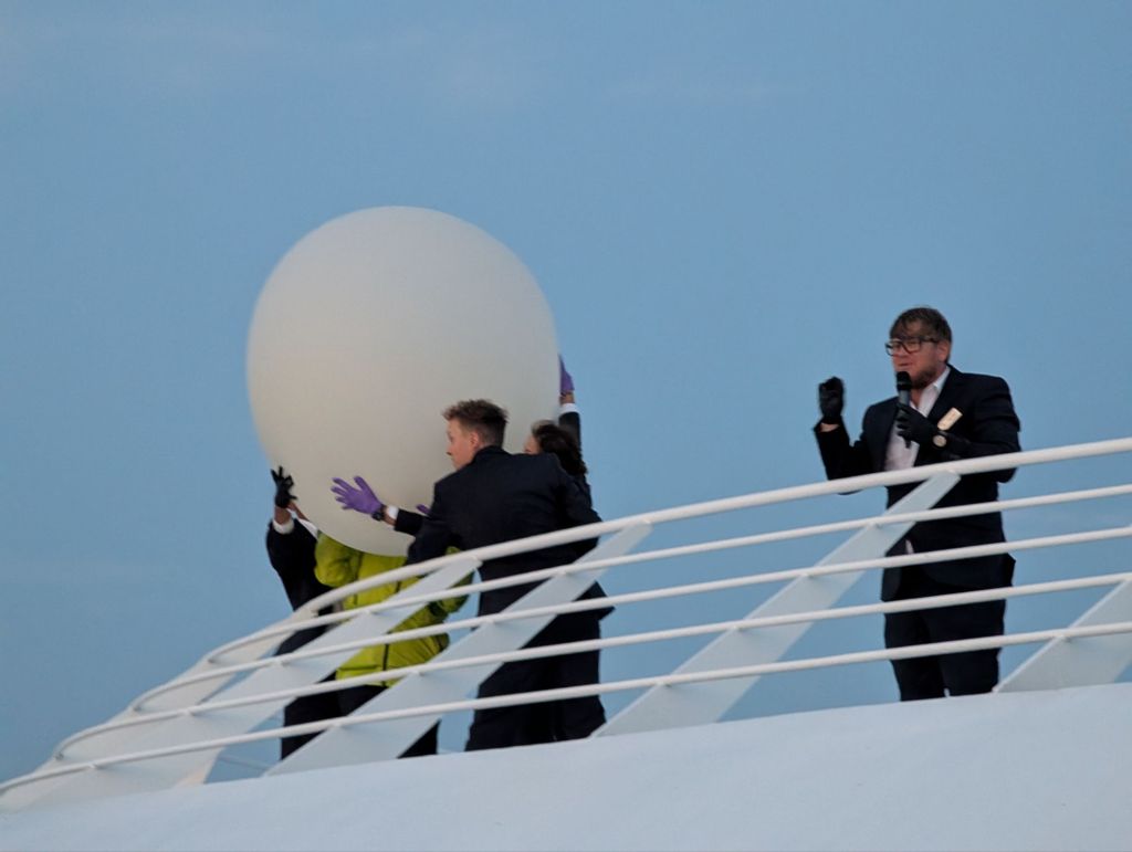 The big white balloon below is a weather balloon, made of biodegradable material and made to carry scientific equipment. The balloons are regularly launched by Viking at times to exactly coordinate with hundreds of other launchings around the world. As they go up, they collect and transmit data on each layer of the atmosphere’s temperature and composition.