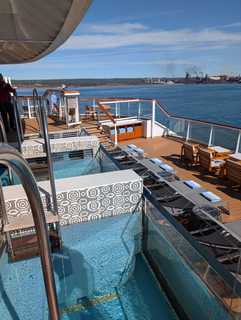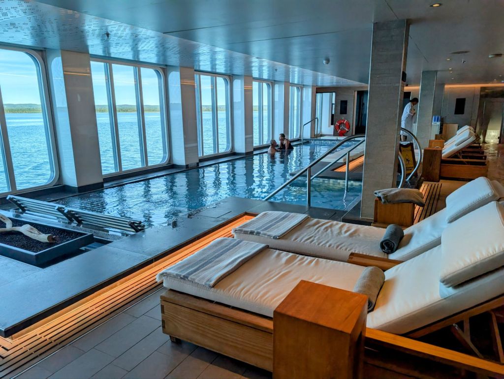 On the stern of the ship is a lounge area with three pools, one with warm water, one tepid and one cold. It’s a Nordic tradition to enjoy going from hot to cold while relaxing in a pool.