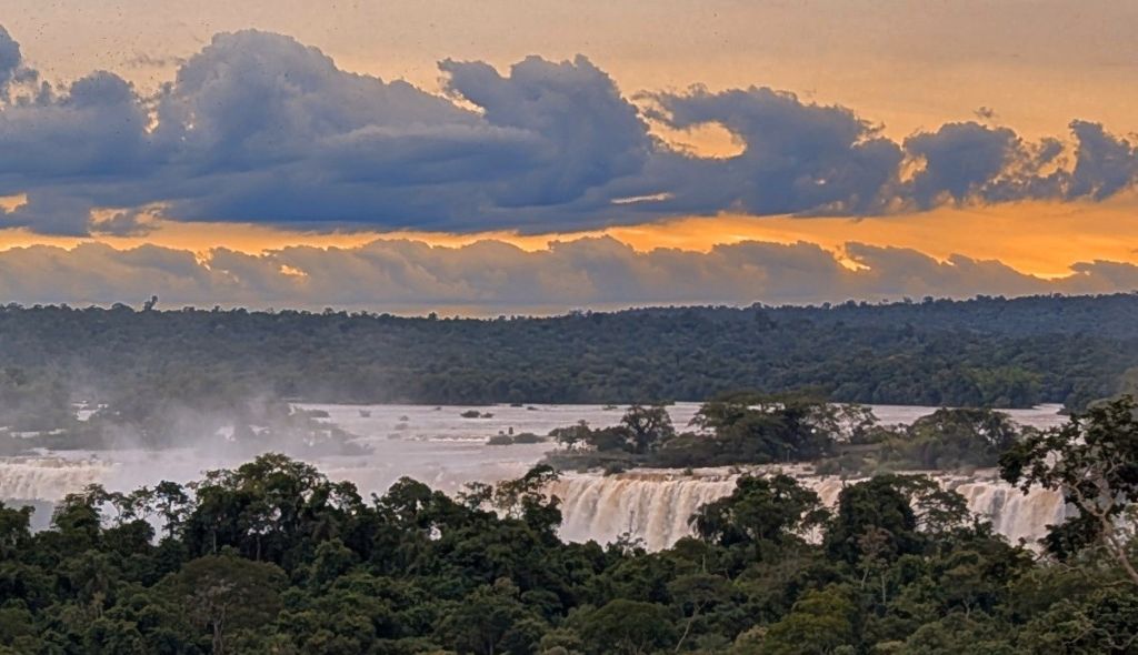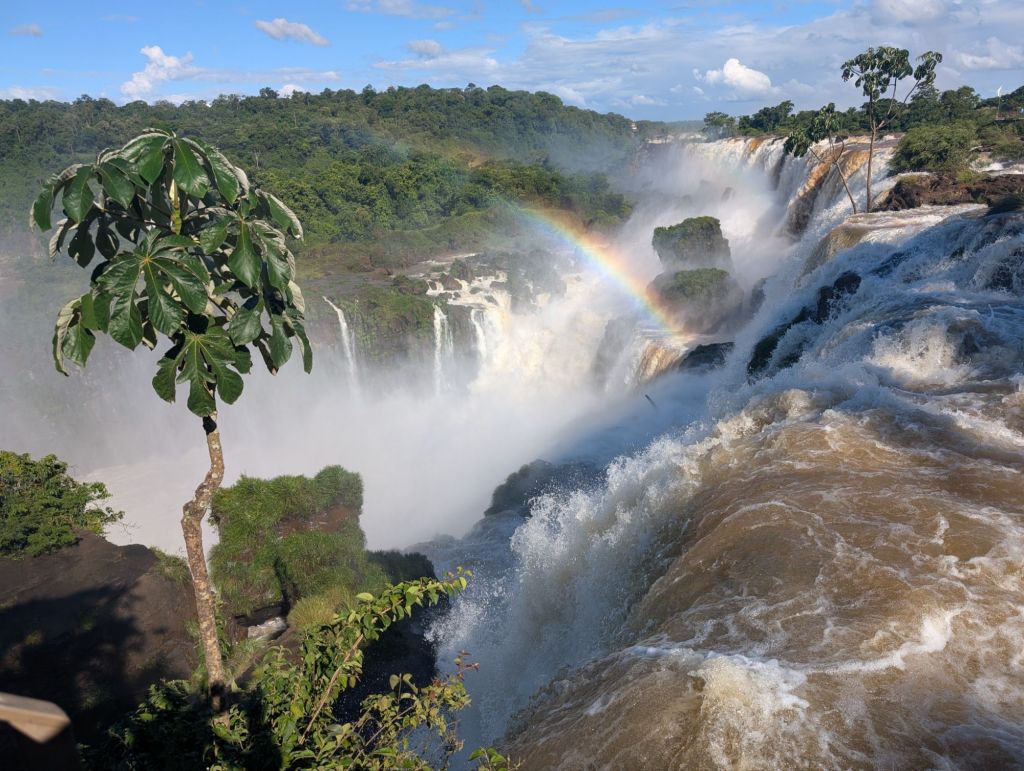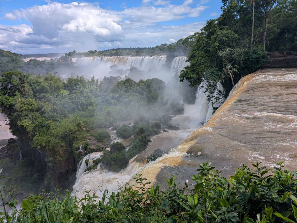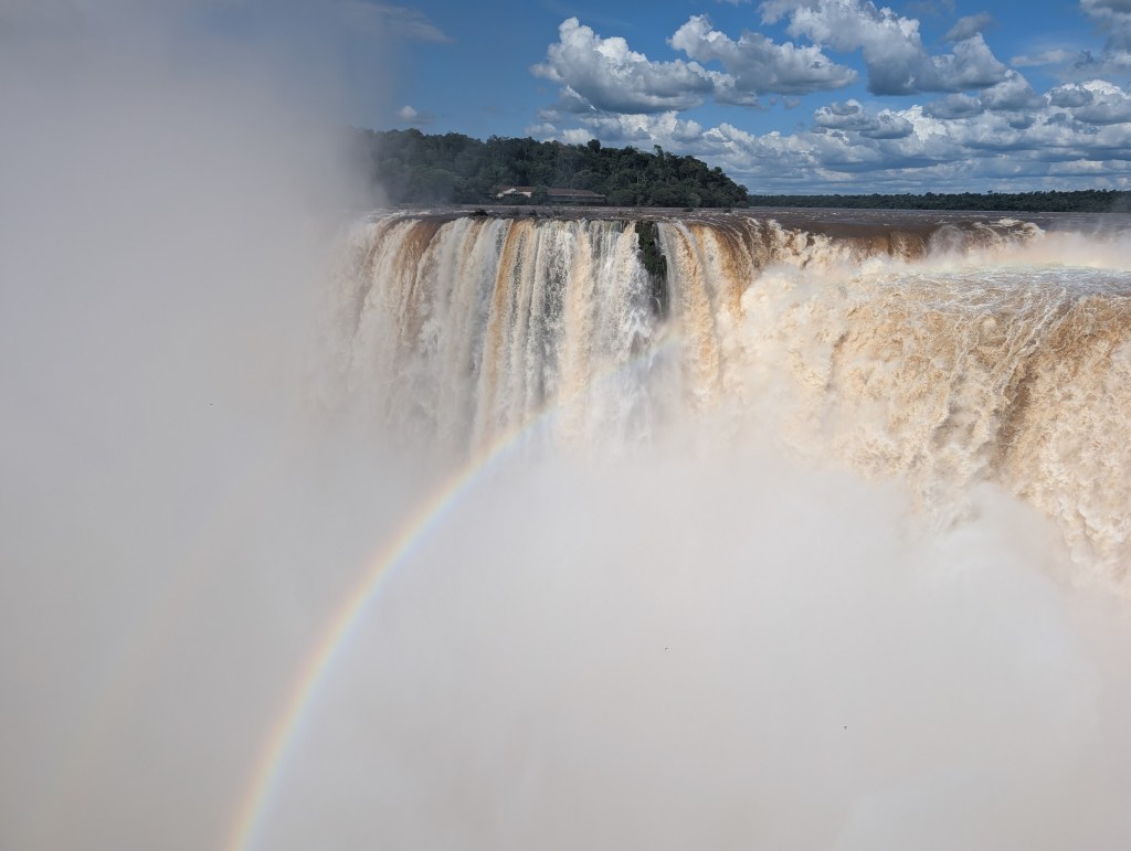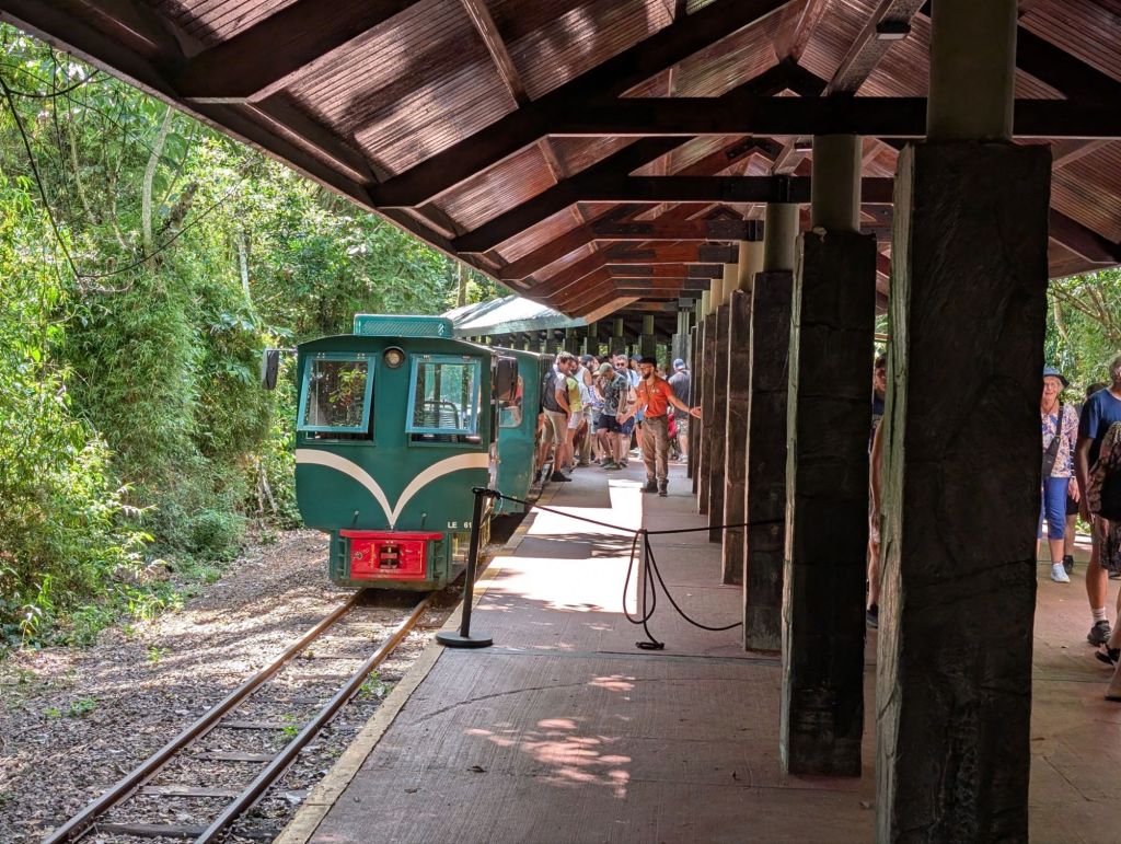 Our first look at the falls was our visit to the iconic Devil’s Throat, a massive horseshoe shaped waterfall. Talk about lucky–the area had just been reopened for viewing that same day. Huge rainfalls in November, 2023 multiplied the falls’ waterflow more than 10-fold, wiping out some of the viewing walkways. So we were among the first to visit Devil’s Throat in more than a year after the walkways were restored. We took a train from the entrance to the park up to Devil’s Throat.