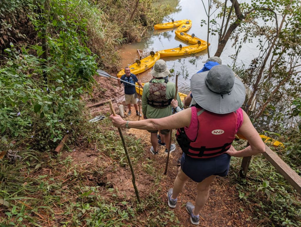 Iguazu is more than waterfalls. There is a huge rainforest with a diversity of plants and wildlife. Hiking in the rainforest was like walking through another world. At La Lorenzo Iguazu Reserve we visited the home of a family working to create a privately held corridor of green space to protect the rainforest. Mercedes, our host, explained how they were using very small, limited tourism to fund their preservation project. Below, we enjoyed the magnificent view from their home deep in the rainforest. We hiked from there down to the river where our kayaks were waiting for us.