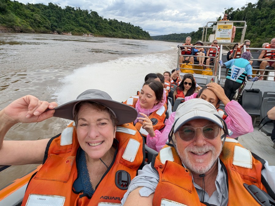 The next day we took The Great Adventure, which involved taking a boat out to the falls and snapping some pictures before everyone put all gear into dry bags. Then the captain drove the boat directly into the roiling spray–twice–while the passengers screamed with pleasure and dismay. Great fun! You can see Joel and me in the video on the left at the bottom of the picture. I’m shielding my face most of the time so the pressure from the spray doesn’t dislodge my contact lens.