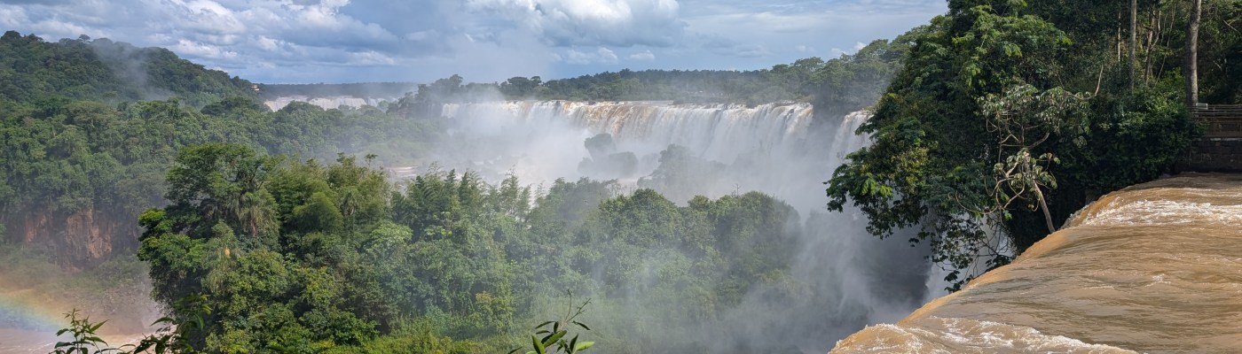 Our first look at the falls was our visit to the iconic Devil’s Throat, a massive horseshoe shaped waterfall. Talk about lucky–the area had just been reopened for viewing that same day. Huge rainfalls in November, 2023 multiplied the falls’ waterflow more than 10-fold, wiping out some of the viewing walkways. So we were among the first to visit Devil’s Throat in more than a year after the walkways were restored. We took a train from the entrance to the park up to Devil’s Throat.